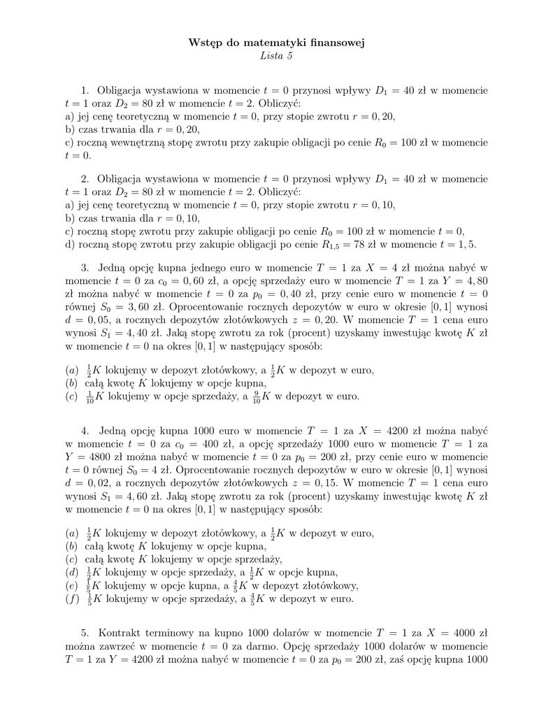Wstęp do matematyki finansowej Lista 5 1. Obligacja wystawiona w momencie t = 0 przynosi wpływy D1 = 40 zł w momencie t = 1 oraz D2 = 80 zł w momencie t = 2. Obliczyć: a) jej cenę teoretyczną w momencie t = 0, przy stopie zwrotu r = 0, 20, b) czas trwania dla r = 0, 20, c) roczną wewnętrzną stopę zwrotu przy zakupie obligacji po cenie R0 = 100 zł w momencie t = 0. 2. Obligacja wystawiona w momencie t = 0 przynosi wpływy D1 = 40 zł w momencie t = 1 oraz D2 = 80 zł w momencie t = 2. Obliczyć: a) jej cenę teoretyczną w momencie t = 0, przy stopie zwrotu r = 0, 10, b) czas trwania dla r = 0, 10, c) roczną stopę zwrotu przy zakupie obligacji po cenie R0 = 100 zł w momencie t = 0, d) roczną stopę zwrotu przy zakupie obligacji po cenie R1,5 = 78 zł w momencie t = 1, 5. 3. Jedną opcję kupna jednego euro w momencie T = 1 za X = 4 zł można nabyć w momencie t = 0 za c0 = 0, 60 zł, a opcję sprzedaży euro w momencie T = 1 za Y = 4, 80 zł można nabyć w momencie t = 0 za p0 = 0, 40 zł, przy cenie euro w momencie t = 0 równej S0 = 3, 60 zł. Oprocentowanie rocznych depozytów w euro w okresie [0, 1] wynosi d = 0, 05, a rocznych depozytów złotówkowych z = 0, 20. W momencie T = 1 cena euro wynosi S1 = 4, 40 zł. Jaką stopę zwrotu za rok (procent) uzyskamy inwestując kwotę K zł w momencie t = 0 na okres [0, 1] w następujący sposób: (a) 12 K lokujemy w depozyt złotówkowy, a 21 K w depozyt w euro, (b) całą kwotę K lokujemy w opcje kupna, 1 9 (c) 10 K lokujemy w opcje sprzedaży, a 10 K w depozyt w euro. 4. Jedną opcję kupna 1000 euro w momencie T = 1 za X = 4200 zł można nabyć w momencie t = 0 za c0 = 400 zł, a opcję sprzedaży 1000 euro w momencie T = 1 za Y = 4800 zł można nabyć w momencie t = 0 za p0 = 200 zł, przy cenie euro w momencie t = 0 równej S0 = 4 zł. Oprocentowanie rocznych depozytów w euro w okresie [0, 1] wynosi d = 0, 02, a rocznych depozytów złotówkowych z = 0, 15. W momencie T = 1 cena euro wynosi S1 = 4, 60 zł. Jaką stopę zwrotu za rok (procent) uzyskamy inwestując kwotę K zł w momencie t = 0 na okres [0, 1] w następujący sposób: (a) 21 K lokujemy w depozyt złotówkowy, a 21 K w depozyt w euro, (b) całą kwotę K lokujemy w opcje kupna, (c) całą kwotę K lokujemy w opcje sprzedaży, (d) 21 K lokujemy w opcje sprzedaży, a 21 K w opcje kupna, (e) 15 K lokujemy w opcje kupna, a 45 K w depozyt złotówkowy, (f ) 15 K lokujemy w opcje sprzedaży, a 54 K w depozyt w euro. 5. Kontrakt terminowy na kupno 1000 dolarów w momencie T = 1 za X = 4000 zł można zawrzeć w momencie t = 0 za darmo. Opcję sprzedaży 1000 dolarów w momencie T = 1 za Y = 4200 zł można nabyć w momencie t = 0 za p0 = 200 zł, zaś opcję kupna 1000 dolarów w momencie T = 1 za Z = 3800 zł można nabyć w momencie t = 0 za c0 = 400 zł. Zakładamy, że oprocentowanie za okres [0, 1] lokat i kredytów złotówkowych oraz dolarowych wynosi 0%. Jaką stopę zwrotu (procent) za okres [0, 1] uzyskamy zawierając jeden kontrakt terminowy na kupno 1000 dolarów oraz nabywając za 2000 zł 10 opcji sprzedaży, a za kolejne 2000 zł 5 opcji kupna, jeśli rynkowa cena dolara w momencie T = 1 wyniesie: (a) (b) (c) (d) (e) S1 = 3, 50 zł, S1 = 3, 80 zł, S1 = 4, 00 zł, S1 = 4, 20 zł, S1 = 4, 50 zł.