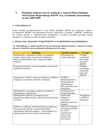 I. Działania zaplanowane do realizacji w ramach Planu działania Sekretariatu Regionalnego KSOW woj. warmińsko-mazurskiego na lata 2008-2009 1. CELE DZIAŁAŃ Celem działań przedstawionych w tym Planie działania KSOW jest skuteczne dotarcie do partnerów KSOW, uświadomieniu korzyści płynących z udziału w KSOW, zachęceniu do wzięcia udziału w zaplanowanych działaniach, a przede wszystkim promocji nowej inicjatywy w ramach rozwoju obszarów wiejskich. 2. DZIAŁANIA SR KSOW WOJEWÓDZTWA WARMIŃSKO-MAZURSKIEGO 2.1. Identyfikacja i analiza możliwych do przeniesienia dobrych praktyk w zakresie rozwoju obszarów wiejskich oraz przekazanie informacji na ich temat Działanie Ogólnopolski / regionalny konkurs na najlepszy projekt zrealizowany na terenach wiejskich w zakresie infrastruktury przy wsparciu środków unijnych. Sposób realizacji Dwuetapowość: I etap regionalny; Przygotowanie bazy wzorów projektów (różne) pod regionalne konkursy. Organizacja i udział w krajowych targach o tematyce związanej z rozwojem obszarów wiejskich. Ogólnopolski / regionalny konkurs na najlepsze gospodarstwo ekologiczne. Ogólnopolski konkurs na najlepszą pracę magisterską, doktorancką w zakresie polityki jakości żywności. Konkurs na najlepszy projekt/inicjatywę mającą na celu promocję regionu za pomocą produktu regionalnego lub tradycyjnego – rozstrzygnięcie za pomocą głosowania na stronie internetowej. FARMA Międzynarodowe Targi Hodowli, Ogrodnictwa i Rozwoju Obszarów Wiejskich; Dwuetapowość: I etap regionalny; Ogłoszenie konkursu i przesłanie najlepszej pracy do komisji; Ogłoszenie konkursu, prezentacja produktu na stronie internetowej z jednoczesną możliwością głosowania; Uwagi Według ustalonego kryterium przez SC KSOW Według ustalonego kryterium przez SC KSOW Współpraca z UWM w Olsztynie Budowa i aktualizacja bazy danych na temat działań i wydarzeń związanych z propagowaniem idei rozwoju żywności wysokiej jakości, a zwłaszcza produktów rolnictwa ekologicznego, produktów regionalnych i tradycyjnych. Organizacja i udział w krajowych i zagranicznych targach o tematyce związanej z systemami jakości żywności. Utworzenie sieci pokazowych gospodarstw ekologicznych. Umieszczenie na stronie internetowej tematów związanych z propagowaniem idei rozwoju żywności wysokiej jakości min podsumowanie konkursu-werdykt; EKOGALA Międzynarodowe Targi Żywności Ekologicznej w Rzeszowie; FARMA Międzynarodowe Targi Hodowli, Ogrodnictwa i Rozwoju Obszarów Wiejskich; Międzynarodowe Targi Żywności Ekologicznej BioFach w Norymberdze; Międzynarodowe Targi Rolnicze Grüne Woche w Berlinie; Światowe Targi Żywności w Moskwie; Światowe Targi Żywności SIAL w Paryżu; Światowe Targi Żywności w Kijowie; Utworzenie bazy danych gospodarstw ekologicznych i umieszczenie na stronie internetowej wraz z informacjami na ich temat; 2 2.2. Przeniesienie dobrych praktyk oraz projektów innowacyjnych, organizacja wymiany doświadczeń i „know-how” Działanie Regionalna konferencja podsumowująca konkurs na najlepszy projekt zrealizowany na terenach wiejskich w zakresie infrastruktury przy wsparciu środków unijnych. Regionalna konferencja podsumowująca konkurs na najlepsze gospodarstwo ekologiczne. Regionalna konferencja podsumowująca konkurs na najlepszą pracę magisterską, doktorancką w zakresie polityki jakości żywności. Regionalna konferencja mająca na celu wymianę doświadczeń i dobrych praktyk w zakresie wspólnotowej polityki jakości żywności. Przygotowanie konferencji dla LGD pt. „Produkt regionalny i tradycyjny a działalność LGD”. Regionalna konferencja dotycząca wymiany doświadczeń w zakresie wdrażania programu rolnośrodowiskowego na obszarach cennych przyrodniczo. Sposób realizacji Udział przedstawicieli zakwalifikowanych do konkursu, wyłonienie i nagrodzenie laureatów; Wyłonienie i nagrodzenie laureatów; Wyłonienie i nagrodzenie laureatów; Organizacja i udział w konferencji przy współpracy z UWM w Olsztynie; Udział w konferencji LGD z woj. warmińskomazurskiego; Zoorganizowanie konferencji poświeconej ochronie bioróżnorodności biologicznej obszaró wiejskich na terenie województwa warmińskomazurskiego; Wystawa lokalnych ras zwierząt, obejmująca m.in. konferencje, spotkania, wymianę doświadczeń hodowlanych, konkurs na championa każdej z ras. Udział w targach; Publikacja i dystrybucja broszury nt. projektów wyróżnionych w konkursie na najlepszy projekt zrealizowany na terenach wiejskich w zakresie infrastruktury przy wsparciu środków unijnych. Po zakończeniu konkursu (raz w roku), umieszczenie na stronie internetowej; Uwagi ok. 100 os. ok. 40 os. ok. 40-50 os. ok. 200 os. ok. 100 os. ok. 100 os. Organizacje i urzędy uczestnicząc e: ARiMR, UWM Olsztyn, W-MODR W-MODR, Związki branżowe np. Związek Hodowców Bydła itp. 3 Publikacja i dystrybucja Biuletynu KSOW Raz na kwartał Według ustalonego kryterium przez SC KSOW Publikacja i dystrybucja broszury nt. dobrych praktyk Podsumowanie ok. 2 000 w ramach Schematu II PPLeader+. działalności LGD w szt. ramach Schematu II PPLeader+, zebranie informacji, druk i dystrybucja celem przedstawienia dobrych praktyk, również umieszczenie na stronie internetowej; Rozbudowa i aktualizacja istniejącej bazy LGD. Sporządzenie mapy ok. 2 000 LGD wraz z szt. informacjami na temat bazy (broszura, strona internetowa); Publikacja dotycząca projektów współpracy Zebranie informacji ok. 3 000 w państwach UE. od samorządów szt. województwa warmińskomazurskiego na temat współpracy zagranicznej na poziomie gmin i przygotowanie broszury; Publikacja i dystrybucja broszury nt. gospodarstw Sporządzenie ok. 1000 szt. ekologicznych, biorących udział w konkursie na broszury najlepsze gospodarstwo ekologiczne województwa promującej warmińsko-mazurskiego. najlepsze gospodarstwa ekologiczne; Publikacja w formie broszury i dystrybucja pracy Według magiste