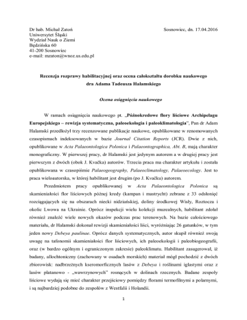 Dr hab. Michał Zatoń Uniwersytet Śląski Wydział Nauk o Ziemi Będzińska 60 41-200 Sosnowiec e-mail: [email protected] Sosnowiec, dn. 17.04.2016 Recenzja rozprawy habilitacyjnej oraz ocena całokształtu dorobku naukowego dra Adama Tadeusza Halamskiego Ocena osiągnięcia naukowego W ramach osiągnięcia naukowego pt. „Późnokredowe flory liściowe Archipelagu Europejskiego – rewizja systematyczna, paleoekologia i paleoklimatologia”, Pan dr Adam Halamski przedłożył trzy recenzowane publikacje naukowe, opublikowane w renomowanych czasopismach indeksowanych w bazie Journal Citation Reports (JCR). Dwie z nich, opublikowane w Acta Palaeontologica Polonica i Palaeontographica, Abt. B, mają charakter monograficzny. W pierwszej pracy, dr Halamski jest jedynym autorem a w drugiej pracy jest pierwszym z dwóch (obok J. Kvačka) autorów. Trzecia praca ma charakter artykułu i została opublikowana w czasopiśmie Palaeogeography, Palaeoclimatology, Palaeoecology. Jest to praca wieloautorska, w której habilitant jest drugim (po J. Kvačku) autorem. Przedmiotem pracy opublikowanej w Acta Palaeontologica Polonica są skamieniałości flor liściowych późnej kredy (kampan i mastrycht) zebrane z 33 odsłonięć rozciągających się na obszarach niecki nidziańskiej, doliny środkowej Wisły, Roztocza i okolic Lwowa na Ukrainie. Oprócz inspekcji wielu kolekcji muzealnych, habilitant zdołał również znaleźć wiele nowych okazów podczas prac terenowych. Na bazie całościowego materiału, dr Halamski dokonał rewizji skamieniałości liści, wyróżniając 26 gatunków, w tym jeden nowy Debeya paulinae. Oprócz danych systematycznych, autor skupił również swoją uwagę na tafonomii skamieniałości flor liściowych, ich paleoekologii i paleobiogeografii, oraz (w bardzo ogólnym i ograniczonym zakresie) paleoklimatu. Habilitant zasugerował, iż badany, allochtoniczny (zachowany w osadach morskich) materiał mógł pochodzić z dwóch zbiorowisk: nadbrzeżnych kseromorficznych lasów z Debeya i roślinami iglastymi oraz z lasów platanowo - „wawrzynowych” rosnących w dolinach rzecznych. Badane zespoły liściowe wydają się mieć charakter przejściowy pomiędzy florami termofilnymi a polarnymi, i są najbardziej podobne do zespołów z Westfalii i Holandii. 1 W pracy opublikowanej w Palaeontographica, Abt. B, habilitant wraz ze współautorem dokonali rewizji systematycznej ok. 320 oznaczalnych okazów flory liściowej z koniaku rowu Nysy Kłodzkiej w Sudetach. I w tym przypadku, habilitant bazował zarówno na wcześniej pozyskanych okazach muzealnych, jak i przez siebie zbieranych, nowych skamieniałościach. Efektem rewizji jest wykazanie obecności 35 gatunków, w tym dwóch nowych (Dicotylophyllum montis-nivium i Dicotylophyllum thaddaei-guniae). Habilitant wyróżnił obecność czterech zbiorowisk roślinnych: las nadrzeczny, las mezofilny, nadbrzeżny las bagienny oraz słone bagna. Badana kolekcja koniackich skamieniałości flor liściowych posłużyła również w analizie paleoklimatycznej (metodą CLAMP – Climate Leaf Analysis Multivariate Program), wyniki której habilitant zamieścił w pracy opublikowanej w Palaeogeography, Palaeoclimatology, Palaeoecology. Z analiz tych wynika, iż np. średnia temperatura roczna na obszarze rowu Nysy Kłodzkiej w koniaku mogła wynosić 17°C. Muszę przyznać, iż habilitant wybrał sobie trudny problem badawczy, gdyż stan zachowania kredowych flor liściowych Polski i Ukrainy znacznie odbiega od ideału. Zachowane w osadach morskich skamieniałości te pozbawione są kutikuli, która zawiera ważne cechy diagnostyczne. Sam kształt liści natomiast, może być podobny u różnych taksonów. Habilitant postanowił poradzić sobie z tym problemem poprzez zastosowanie na wpół sztucznej, na wpół naturalnej klasyfikacji poszczególnych morfotypów liści („rodzaje precyzyjne ale szerokie” wg habilitanta) poprzez odpowiednie kodowanie cech. Oczywiście metoda ta nigdy nie będzie na tyle precyzyjna by odnieść każdy morfotyp do naturalnego gatunku biologicznego, ale za to pozwoli na w miarę przyzwoitą klasyfikację tak zachowanych flor liściowych. Bardzo podoba mi się, że habilitant spróbował innego podejścia do klasyfikacji tak trudnego ze względu na stan zachowania materiału. Rezultatem za to są wspaniałe pod kątem opisów i ilustracji monografie. Po raz pierwszy dostarczają one tak kompleksowych informacji paleobotanicznych dla późnej kredy w oparciu o kopalne liście roślin. Ilustracje występują w formie zdjęć okazów, jak i ich rysunków oraz rekonstrukcji liści (Acta Palaeontologica Polonica). Pan dr Halamski na pewno włożył dużo wysiłku podczas pozyskania nowego materiału, bowiem skamieniałości flory liściowej w osadach morskich zdecydowanie odbiegają pod kątem ilościowym i jakościowym od skamieniałości zwierzęcych. Dalsze prace kameralne, głównie związane z odpowiednią strategią w podejściu do systematyki tak zachowanego materiału to kolejne, jeszcze ważniejsze wyzwanie, któremu habilitant jak najbardziej podołał. Godne uwagi są analizy liści metodą CLAMP w celu wyciągnięcia danych paleoklimatycznych. Habilitant pokazał, iż dysponując odpowiednią liczbą okazów, nawet posiadając nie za dobrze zachowane skamieniałości liści, można z 2 pewną dozą ostrożności uzyskać dane na temat średnich temperatur czy precypitacji. Dane zawarte w trzech powyższych pracach pokazują, że habilitant starał się wyciągnąć z materiału badawczego tyle informacji, ile się tylko da, i według mnie udało Mu się to. Artykuły te jak najbardziej spełniają jedno z istotnych kryteriów postępowania habilitacyjnego. Ocena pozostałego dorobku naukowego i dydaktycznego Oprócz artykułów składających się na pracę habilitacyjną, Pan dr Adam Halamski jest autorem i współautorem 18 publikacji naukowych (10 z bazy JCR) oraz 10 artykułów o charakte