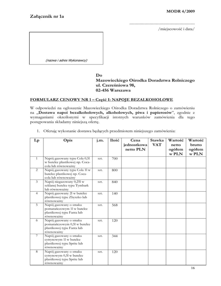 MODR 4/2009 Załącznik nr 1a ................................................................... /miejscowość i data/ (nazwa i adres Wykonawcy) Do Mazowieckiego Ośrodka Doradztwa Rolniczego ul. Czereśniowa 98, 02-456 Warszawa FORMULARZ CENOWY NR 1 – Część I: NAPOJE BEZALKOHOLOWE W odpowiedzi na ogłoszenie Mazowieckiego Ośrodka Doradztwa Rolniczego o zamówieniu na „Dostawa napoi bezalkoholowych, alkoholowych, piwa i papierosów”, zgodnie z wymaganiami określonymi w specyfikacji istotnych warunków zamówienia dla tego postępowania składamy niniejszą ofertę. 1. Oferuję wykonanie dostawa będących przedmiotem niniejszego zamówienia: Lp Opis j.m. Ilość 1 Napój gazowany typu Cola 0,5l w butelce plastikowej np. Cocacola lub równoważny Napój gazowany typu Cola 1l w butelce plastikowej np. Cocacola lub równoważny Napój niegazowany 0,25l w szklanej butelce typu Tymbark lub równoważny Napój gazowany 2l w butelce plastikowej typu Zbyszko lub równoważny Napój gazowany o smaku pomarańczowym 1l w butelce plastikowej typu Fanta lub równoważny Napój gazowany o smaku pomarańczowym 0,5l w butelce plastikowej typu Fanta lub równoważny Napój gazowany o smaku cytrynowym 1l w butelce plastikowej typu Sprite lub równoważny Napój gazowany o smaku cytrynowym 0,5l w butelce plastikowej typu Sprite lub równoważny szt. 700 szt. 800 szt. 840 szt. 140 szt. 568 szt. 120 szt. 344 szt. 120 2 3 4 5 6 7 8 Cena Stawka jednostkowa VAT netto PLN Wartość netto ogółem w PLN Wartość brutto ogółem w PLN 16 9 10 11 12 13 14 15 16 Napój o smaku jabłkowym 2l w kartonie typu Costa lub równoważny Napój o smaku pomarańczowym 2l w kartonie typu Costa lub równoważny Napój o smaku czarnej porzeczki 2l w kartonie typu Costa lub równoważny Napój o smaku jabłkowym 2l w kartonie typu Caprio lub równoważny Napój o smaku pomarańczowym 2l w kartonie typu Caprio lub równoważny Napój o smaku aronia wiśnia jabłko 2l w kartonie typu Caprio lub równoważny Napój o smaku multiwitaminy 2l w kartonie typu Caprio lub równoważny Napój energetyzujący 0,25l w puszce typu Red Bull lub równoważny szt. 120 szt. 120 szt 120 szt. 100 szt 100 szt 100 szt 50 szt 270 Ogółem cena oferta w PLN Słownie (cena ofertowa netto): .................................................................................................zł Słownie (cena ofertowa brutto) .................................................................................................zł 2. Oświadczamy, że spełniamy warunki określone w art. 22 ust. 1 ustawy z dnia 29 stycznia 2004 r. – Prawo zamówień publicznych (tj. Dz.U z 14 września 2006 r. Nr 164, poz. 1163 z p. zm.); 3. Oświadczam, że cena brutto podana w pkt 1 niniejszego formularza zawiera wszystkie koszty wykonania zamówienia, jakie ponosi Zamawiający w przypadku wyboru niniejszej oferty. 4. Zapoznaliśmy się z treścią specyfikacji istotnych warunków zamówienia (w tym ze wzorem umowy) i nie wnosimy do niej zastrzeżeń oraz przyjmujemy warunki w niej zawarte; 5. W przypadku udzielenia zamówienia zobowiązuje się do zawarcia umowy w miejscu i terminie wskazanym przez Zamawiającego oraz na warunkach określonych we wzorze umowy. 6. Oświadczam, że jeżeli w okresie związania ofertą nastąpią jakiekolwiek znaczące zmiany sytuacji przedstawionej w naszych dokumentach załączonych do oferty, natychmiast poinformujemy o nich Zamawiającego. 7. Uważamy się za związanych niniejszą ofertą na czas wskazany w Specyfikacji Istotnych Warunków Zamówienia; 8. Oświadczam, że jestem związany niniejszą ofertą na czas wskazany w SIWZ. 17 9. W przypadku przyznania nam zamówienia, zobowiązujemy się do zawarcia umowy w miejscu i terminie wskazanym przez Zamawiającego w wezwaniu do podpisania umowy oraz do realizacji dostaw przedmiotu zamówienia do następujących Oddziałów i PZD Mazowieckiego Ośrodka Doradztwa Rolniczego Nazwa oddziału Nazwa biura zespołu doradczego I. Oddział Bielice 1 PZD Sochaczew 2 PZD Grodzisk Mazowiecki 3 PZD Żyrardów II. Oddział Ostrołęka 4 PZD Ostrów Mazowiecka 5 PZD Przasnysz 6 PZD Maków Mazowiecki 7 PZD Wyszków 8 PZD Ostrołęka III. Oddział Płock 9 PZD Płock 10 PZD Gostynin 11 PZD Sierpc IV. Oddział „Poświętne” w Płońsku 12 PZD Ciechanów 13 PZD Mława 14 PZD Pułtusk 15 PZD Płońsk 16 PZD Żuromin V. Oddział w Radomiu 17 PZD Białobrzegi Adres/telefon Bielice19, 96-500 Sochaczew tel.(0 46) 862 00 40, fax.(0 46) 862 00 52 Osoba do kontaktu: Pani Renata Marcinkowska Bielice19 96-500 Sochaczew ul. Bartniaka 24 05-825 Grodzisk Mazowiecki ul. 1 Maja 41 96-300 Żyrardów ul. Targowa 4, 07- 412 Ostrołęka tel. (029) 760-03-69; 760-03-56 Osoba do kontaktu: Pani Jolanta Wiszowata ul. Wiejska 07-300 Ostrów Mazowiecka ul. Gołymińska 13 06-300 Przasnysz Urząd Miasta ul. Moniuszki 6 06-200 Maków Mazowiecki Rejonowa Spółdzielnia "SCH" ul. I Armii Wojska Polskiego 171 07-200 Wyszków ul. Targowa 4 07-410 Ostrołęka ul. Zglenickiego 42D, 09-411 Biała tel. (024) 262 97 72; 262 99 30 Osoba do kontaktu: Pan Krzysztof Szumski ul. Zglenickiego 42 D 09-411 Stara-Biała ul. 3 Maja 43b 09-500 Gostynin ul. Piastowska 40 09-200 Sierpc ul. H Sienkiewicza 11, 09-100 Płońsk tel. (0 23) 663 07 00 Osoba do kontaktu: Pani Małgorzata Lewicka ul. Moniuszki 17 06-400 Ciechanów ul. Narutowicza 19, 06-500 Mława ul. Mickiewicza 22A, 06-100 Pułtusk Ul. Sienkiewicza 11, 09-100 Płońsk Pl. Piłsudskiego 3, 09-300 Żuromin ul. Chorzowska 16/18, 26-600 Radom tel./fax (0 48) 365 69 07 Osoba do kontaktu: Pan Bogdan Rutkowski ul. Rzemieślnicza 51 18 26 - 800 Białobrzegi 18 PZD Grójec 19 PZD Kozienice 20 PZD Lipsko 21 PZD Przysucha 22 PZD Radom 23 PZD Szydłowiec 24 PZD Zwoleń VI. Oddział Siedlce 25 PZD Garwolin 26 PZD Łosice 27 PZD Mińsk Mazowiecki 28 PZD Siedlce 29 PZD Sokołów Podlaski 30 PZD Węgrów VII. Oddział Warszawa 31 PZD Legionowo 32 34 PZD Nowy Dwór Mazowiecki PZD Otwock z siedzi