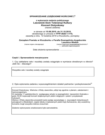 SPRAWOZDANIE (CZĘŚCIOWE*/KOŃCOWE*)1) z wykonania zadania publicznego Lasowicki Dom Tolerancji Kultury Koncert Dożynkowy (nazwa zadania) w okresie od 15.08.2010. do 31.10.2010, określonego w umowie nr FP/P.4026-1-7/10, zawartej w dniu 12 kwietnia 2010 w Kluczborku, pomiędzy Zarządem Powiatu w Kluczborku a Parafia Ewangelicko-Augsburska Lasowice Wielkie (nazwa organu zlecającego) (nazwa organizacji pozarządowej*/podmiotu*/ jednostki organizacyjnej*) Data złożenia sprawozdania: ..................... Część I. Sprawozdanie merytoryczne 1. Czy zakładane cele i rezultaty zostały osiągnięte w wymiarze określonym w ofercie? Jeśli nie – dlaczego? Wszystkie cele i rezultaty zostały osiągnięte 2. Opis wykonania zadania z wyszczególnieniem działań partnerów i podwykonawców2) Koncert Dożynkowy Wańców z Wisły Jawornika ,odbył się zgodnie z planem, założeniami i harmonogramem. W niedzielę 17 października br. występujący artyści w ewangelickim lasowickim Kościele o godz.16.00 rozpoczęli koncert dziękczynnych pieśni religijnych i pieśni i przyśpiewek ludowych. Wańcy z Wisły-Jawornika prowadzili swój występ opowiadając o zwyczajach dożynkowych panujących w Beskidach, często teksty w śpiewanych pieśni były tłumaczone, aby uczestnicy koncertu mogli wszystko dobrze zrozumieć. Zadanie wykonywane zrealizowane byłe samodzielnie. 3. Liczbowe określenie skali działań, zrealizowanych w ramach zadania, /należy użyć tych samych miar, które były zapisane w ofercie realizacji zadania, w części II pkt 5/. Koncert Dożynkowy w Lasowicach Wielkich, odbył się 17 października 2010r. Pomimo nie najładniejszej pogody zgromadził ok. 120 widzów, zaangażował 3 wolontariuszy i 9 wykonawców. Wydrukowano łącznie 120 plakatów i ulotek Część II. Sprawozdanie z wykonania wydatków 1. Rozliczenie ze względu na rodzaj kosztów (w zł) Rodzaj Lp. kosztów Całość zadania (zgodnie z umową) Poprzednie okresy sprawozdawcze (narastająco)* (koszty merytoryczne i administracyjn e związane z realizacją zadania) koszt całkowity z tego z dotacji Wynagrodze- 1 200,00 855,00 nie artystów. Bieżący okres sprawozdawczy – w przypadku sprawozdania końcowego – za okres realizacji zadania z tego z finansowych środków własnych, środków z innych źródeł oraz wpłat i opłat adresatów* koszt całkowity z tego z dotacji z tego z finansowych środków własnych, środków z innych źródeł oraz wpłat i opłat adresatów* koszt całkowity z tego z dotacji z tego z finansowych środków własnych, środków z innych źródeł oraz wpłat i opłat adresatów* 345,00 0,00 0,00 0,00 1 200,00 855,00 345,00 145,18 0,00 145,18 366,00 0,00 366,00 1 711.18 855,00 856,18 Promocja, plakaty 150,00 0,00 150,00 0,00 0,00 0,00 Poczęstunki 360,00 0,00 360,00 0,00 0,00 0,00 0,00 0,00 0,00 855,00 Ogółem 1 710,00 855,00 2 2. Rozliczenie ze względu na źródło finansowania Źródło finansowania Koszty pokryte z dotacji Całość zadania (zgodnie z umową) Poprzednie okresy sprawozdawcze (narastająco)* Bieżący okres Sprawozdawczy – w przypadku sprawozdania końcowego – za okres realizacji zadania zł % zł % zł % 855,00 50 0,00 0,00 855,00 49,97 50 0,00 0,00 856,18 50,03 0,00 100% 1711,18 100% Koszty pokryte z finansowych środków 855,00 własnych, środków z innych źródeł oraz wpłat i opłat adresatów * /z tego wpłaty i opłaty adresatów zadania ....................................... . zł/ Ogółem: 1710,00 100% Uwagi mogące mieć znaczenie przy ocenie realizacji budżetu: Wszystkie wydatki zostały poniesione zgodnie z aktualnymi i obowiązującymi cenami. 3. Zestawienie faktur (rachunków)3) Lp. 1. 2. 3. Numer dokumentu księgowego Numer pozycji kosztorysu Data Nazwa wydatku Kwota (zł) Z tego ze środków pochodzących z dotacji (zł) Faktura VAT 1463/200 2 08.10.2010 Plakat 145,18 0,00 Umowa Zlecenie 1/2010 1 17.10.2010 Wynagrodze 1 200,00 nie artystów 855,00 Faktura VAT 25/B/2010 3 18.10.2010 Poczęstunki 0,00 366,00 3 Część III. Dodatkowe informacje Zakład poligraficzny zaproponował dobrą cenę druku plakatów dlatego wydrukowaliśmy ich więcej niż wcześniej planowaliśmy , wydrukowaliśmy także papierowe ulotki rozdane mieszkańcom naszego Powiatu. Załączniki:4) 1. Fotokopie Faktur 2. Plakat i ulotka po 1 egzemplarzu 3. Fotograficzny kolaż koncertu Oświadczam(-my), że: 1) od daty zawarcia umowy nie zmienił się status prawny organizacji pozarządowej*/podmiotu*/jednostki organizacyjnej*, 2) wszystkie podane w niniejszym sprawozdaniu informacje są zgodne z aktualnym stanem prawnym i faktycznym, 3) zamówienia na dostawy, usługi i roboty budowlane za środki finansowe uzyskane w ramach umowy zostały dokonane zgodnie z przepisami ustawy z dnia 29 stycznia 2004 r. Prawo zamówień publicznych, 4) wszystkie kwoty wymienione w zestawieniu faktur (rachunków) zostały faktycznie poniesione. (pieczęć organizacji pozarządowej* /podmiotu* /jednostki organizacyjnej*) (podpis osoby upoważnionej lub podpisy osób upoważnionych do składania oświadczeń woli w imieniu organizacji pozarządowej*/podmiotu*/jednostki organizacyjnej*) Poświadczenie złożenia sprawozdania Adnotacje urzędowe (nie wypełniać) ______________ * Niepotrzebne skreślić. 4 POUCZENIE Sprawozdania składa się osobiście lub nadsyła przesyłką poleconą w przewidzianym w umowie terminie na adres organu zlecającego. 1) Sprawozdanie częściowe i końcowe sporządzać należy w okresach określonych w umowie. 2) Opis musi zawierać szczegółową informację o zrealizowanych działaniach zgodnie z ich układem zawartym w ofercie, która była podstawą przygotowania umowy. W opisie konieczne jest uwzględnienie wszystkich planowanych działań, zakres w jakim zostały one zrealizowane i wyjaśnienie ewentualnych odstępstw w ich realizacji, zarówno jeśli idzie o ich zakres, jak i harmonogram realizacji. 3) Do sprawozdania załączyć należy spis 