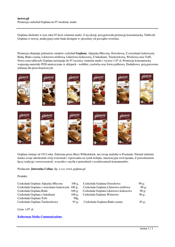 newss.pl Promocja czekolad Goplana na 97 urodziny marki Goplana obchodzi w tym roku 97-lecie istnienia marki. Z tej okazji, przygotowała promocję konsumencką. Tabliczki Goplana w nowej, atrakcyjnej cenie będę dostępne w sprzedaży od początku września. Promocja obejmuje jedenaście smaków czekolad Goplana: Alpejską Mleczną, Orzechową, Z orzechami laskowymi, Białą, Biało-czarną, Likierowo-truflową, Likierowo-kokosową, Z bakaliami, Truskawkową, Wiśniową oraz Toffi. Nowa cena tabliczek Goplana nawiązuje do 97 rocznicy istnienia marki i wynosi 1,97 zł. Promocję konsumencką wspierają materiały POS umieszczane w sklepach - wobbler, cenówka oraz listwa półkowa. Dodatkowo, przygotowano reklamę dla pism branżowych. Goplana istnieje od 1912 roku. Założona przez Braci Wilkońskich, ma swoją siedzibę w Poznaniu. Niemal stuletnia marka wciąż udoskonala swój wizerunek i wprowadza na rynek kolejne, innowacyjne rozwiązania. Z powodzeniem łączy tradycję i nowoczesność, wszystko z myślą o potrzebach i oczekiwaniach konsumentów. Producent: Jutrzenka Colian, Sp. z o.o; www.goplana.pl Produkt: Czekolada Goplana Alpejska Mleczna Czekolada Goplana z orzechami laskowymi Czekolada Goplana Biała Czekolada Goplana z bakaliami Czekolada Goplana Tofii Czekolada Goplana Truskawkowa 100 g, 100 g; 100 g; 100 g; 90g; 93 g; Czekolada Goplana Orzechowa Czekolada Goplana Likierowo-truflowa Czekolada Goplana Likierowo-kokosowa Czekolada Goplana Wiśniowa Czekolada Goplana Biało-czarna 90 g; 90 g; 90 g; 90 g; 85 g; Cena: 1,97 zł. Kolterman Media Communications strona 1 / 1