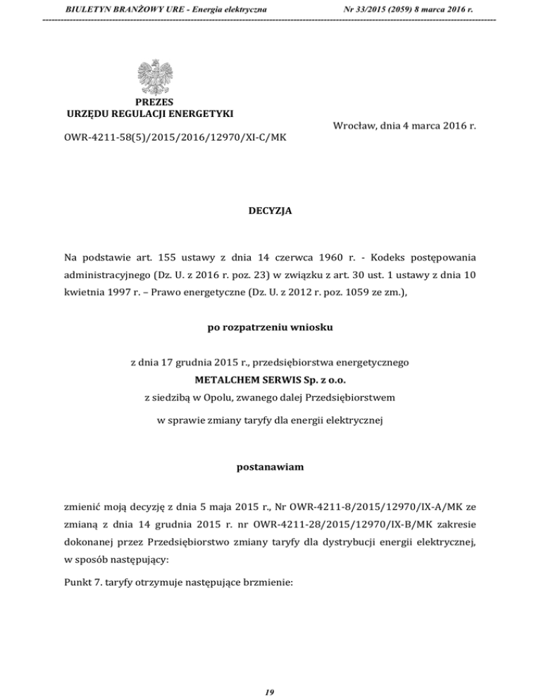 BIULETYN BRANŻOWY URE - Energia elektryczna Nr 33/2015 (2059) 8 marca 2016 r. ------------------------------------------------------------------------------------------------------------------------------------------------------ PREZES URZĘDU REGULACJI ENERGETYKI OWR-4211-58(5)/2015/2016/12970/XI-C/MK Wrocław, dnia 4 marca 2016 r. DECYZJA Na podstawie art. 155 ustawy z dnia 14 czerwca 1960 r. - Kodeks postępowania administracyjnego (Dz. U. z 2016 r. poz. 23) w związku z art. 30 ust. 1 ustawy z dnia 10 kwietnia 1997 r. – Prawo energetyczne (Dz. U. z 2012 r. poz. 1059 ze zm.), po rozpatrzeniu wniosku z dnia 17 grudnia 2015 r., przedsiębiorstwa energetycznego METALCHEM SERWIS Sp. z o.o. z siedzibą w Opolu, zwanego dalej Przedsiębiorstwem w sprawie zmiany taryfy dla energii elektrycznej postanawiam zmienić moją decyzję z dnia 5 maja 2015 r., Nr OWR-4211-8/2015/12970/IX-A/MK ze zmianą z dnia 14 grudnia 2015 r. nr OWR-4211-28/2015/12970/IX-B/MK zakresie dokonanej przez Przedsiębiorstwo zmiany taryfy dla dystrybucji energii elektrycznej, w sposób następujący: Punkt 7. taryfy otrzymuje następujące brzmienie: 19 BIULETYN BRANŻOWY URE - Energia elektryczna Nr 33/2015 (2059) 8 marca 2016 r. ------------------------------------------------------------------------------------------------------------------------------------------------------ 7. Stawki opłat za usługi dystrybucji dla poszczególnych grup taryfowych. [zł/kW/m-c] C21 0,0129 0,85 0,1527 X X C11 0,0129 0,85 0,1460 X X Całodobowy Stawka abonamentowa [zł/kWh] Składnik stały stawki sieciowej 2,10 [zł/kW/m-c] [zł/m-c] 6,89 27,00 [zł/kW/m-c] [zł/m-c] X 7,76 9,80 X 2,12 3,50 Pozostałe godziny doby 12,94 B21 Szczyt popołudniowy [zł/kW/m-c] Szczyt przedpołudniowy Stawka opłaty przejściowej [zł/MWh] GRUPA TARYFOWA Stawka jakościowa Składnik zmienny stawki sieciowej [zł/MWh] 61,95 X X X [zł/kWh] We wszystkich grupach taryfowych wprowadza się stawkę opłaty OZE w wysokości 2,51 zł/MWh, wskazanej w art. 185 ustawy o OZE. Pozostałe zapisy taryfy pozostają bez zmian. UZASADNIENIE Prezes URE decyzją 5 maja 2015 r., Nr OWR-4211-8/2015/12970/IX-A/MK ze zmianą z dnia 14 grudnia 2015 r. nr OWR-4211-28/2015/12970/IX-B/MK, zatwierdził taryfę dla energii elektrycznej Przedsiębiorstwa w zakresie dystrybucji na okres 12 miesięcy od dnia wprowadzenia taryfy do stosowania. Pismem z dnia 17 grudnia 2015 r. Przedsiębiorstwo wystąpiło o zmianę taryfy dla energii elektrycznej w zakresie dostosowania jej do obowiązującej od 1 stycznia 2016 r. stawki opłaty jakościowej. Rozpatrując przedmiotowy wniosek kierowano się przesłankami określonymi w art. 155 Kodeksu postępowania administracyjnego w myśl, którego decyzja ostateczna na mocy, której strona nabyła prawo, może być w każdym czasie za zgodą strony uchylona lub zmieniona przez organ administracji, który ją wydał, jeżeli przepisy szczególne nie sprzeciwiają się uchyleniu lub zmianie takiej decyzji i przemawia za tym słuszny interes strony. W niniejszej sprawie uznano, że zostały spełnione przesłanki warunkujące zmianę decyzji administracyjnej w trybie art. 155 Kpa, w związku, z czym postanowiono orzec jak w rozstrzygnięciu. 2 20 BIULETYN BRANŻOWY URE - Energia elektryczna Nr 33/2015 (2059) 8 marca 2016 r. ------------------------------------------------------------------------------------------------------------------------------------------------------ POUCZENIE 1. Od niniejszej decyzji przysługuje odwołanie do Sądu Okręgowego w Warszawie Sądu Ochrony Konkurencji i Konsumentów - za moim pośrednictwem, w terminie dwutygodniowym od dnia jej doręczenia (art. 30 ust. 2 i 3 Prawa energetyczne oraz art. 47946 pkt 1 i art. 47947 § 1 Kodeksu postępowania cywilnego). 2. Odwołanie od decyzji powinno czynić zadość wymaganiom przepisanym dla pisma procesowego oraz zawierać oznaczenie zaskarżonej decyzji i wartości przedmiotu sporu, przytoczenie zarzutów, zwięzłe ich uzasadnienie, wskazanie dowodów, a także zawierać wniosek o uchylenie albo o zmianę decyzji w całości lub w części (art. 47949 Kodeksu postępowania cywilnego). Odwołanie należy przesłać na adres Południowo-Zachodniego Oddziału Terenowego Urzędu Regulacji Energetyki – ul. Marszałka Józefa Piłsudskiego 49-57, 50-032 Wrocław. 3. Stosownie do art. 47 ust 3 pkt 1 i art. 31 ust. 3 pkt 2 ustawy – Prawo energetyczne, niniejsza decyzja zostanie skierowana do ogłoszenia w „Biuletynie Branżowym Urzędu Regulacji Energetyki – Energia elektryczna”. Z upoważnienia Prezesa Urzędu Regulacji Energetyki Dyrektor Południowo-Zachodniego Oddziału Terenowego Urzędu Regulacji Energetyki z siedzibą we Wrocławiu Józef Dolata Decyzja zwolniona z opłaty skarbowej na podstawie art. 4 ustawy z dnia 16 listopada 2006 r. o opłacie skarbowej (Dz. U. z 2012 r. poz. 1282) Mirosław Kaczmarek Starszy Specjalista Otrzymuje: METALCHEM SERWIS Sp. z o.o. ul. Oświęcimska 102 D, 45-641 Opole 3 21