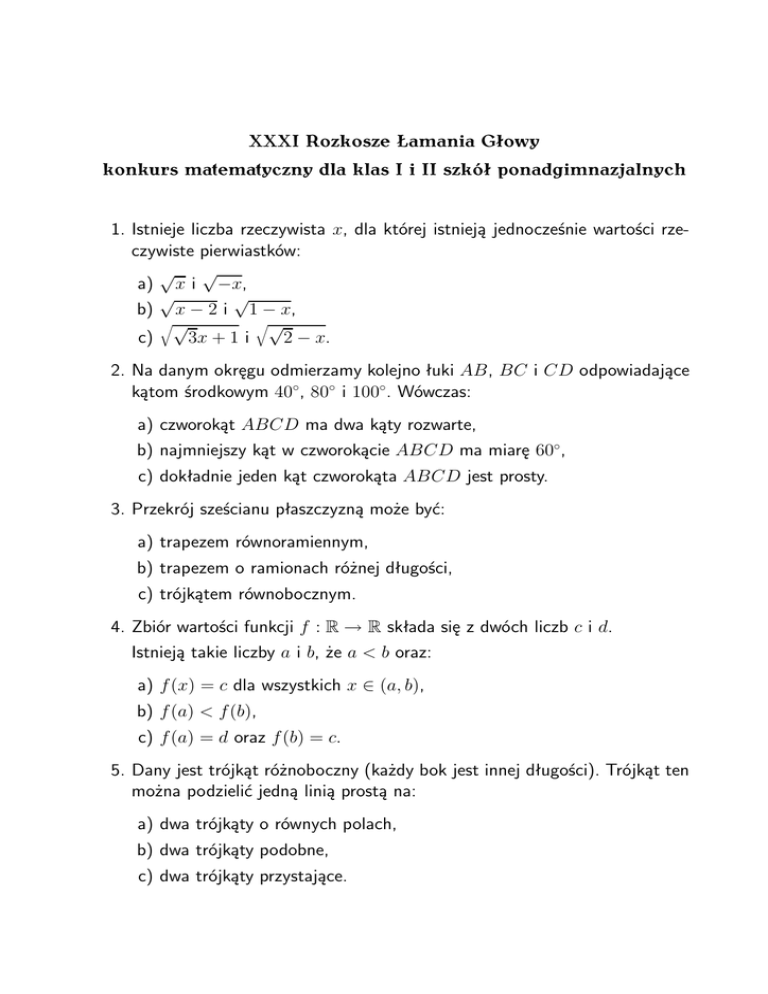 XXXI Rozkosze Łamania Głowy konkurs matematyczny dla klas I i II szkół ponadgimnazjalnych 1. Istnieje liczba rzeczywista x, dla której istnieją jednocześnie wartości rzeczywiste pierwiastków: √ √ a) x i −x, √ √ b) x − 2 i 1 − x, q√ q√ c) 3x + 1 i 2 − x. 2. Na danym okręgu odmierzamy kolejno łuki AB, BC i CD odpowiadające kątom środkowym 40◦, 80◦ i 100◦. Wówczas: a) czworokąt ABCD ma dwa kąty rozwarte, b) najmniejszy kąt w czworokącie ABCD ma miarę 60◦, c) dokładnie jeden kąt czworokąta ABCD jest prosty. 3. Przekrój sześcianu płaszczyzną może być: a) trapezem równoramiennym, b) trapezem o ramionach różnej długości, c) trójkątem równobocznym. 4. Zbiór wartości funkcji f : R → R składa się z dwóch liczb c i d. Istnieją takie liczby a i b, że a < b oraz: a) f (x) = c dla wszystkich x ∈ (a, b), b) f (a) < f (b), c) f (a) = d oraz f (b) = c. 5. Dany jest trójkąt różnoboczny (każdy bok jest innej długości). Trójkąt ten można podzielić jedną linią prostą na: a) dwa trójkąty o równych polach, b) dwa trójkąty podobne, c) dwa trójkąty przystające. 6. Proste AC i BC są styczne do okręgu o środku O w punktach A i B. Kąt ∠ABC ma miarę 65◦. Wówczas: a) |∠AOB| ¬ 130◦, b) |∠AOB| ¬ 130◦, c) |∠AOB| zależy od odległości punktu C od środka okręgu. 7. Wiadomo, że liczba 2n3 + n jest podzielna przez 6. Zatem: a) n jest podzielne przez 6, b) n jest podzielne przez 2 c) jedynie liczby n = 3k + 1, gdzie k oznacza dowolną liczbę nieparzystą, spełniają podany warunek. 8. W kwadrat ABCD o boku długości a wpisano okrąg. Cięciwa okręgu zawarta w prostej przechodzącej przez wierzchołekA i środek boku CD ma długość: √ a) mniejszą niż a 3, √ b) większą niż a 2, c) mniejszą niż √ a 13 2 . 9. Wiadomo, że liczba m jest sumą kwadratów dwóch liczb całkowitych. Wówczas sumą kwadratów dwóch liczb całkowitych jest również: a) 2m, b) 5m, c) 13m. 10. Zbiór A ma siedem elementów. Zbiór B jest k–elementowym podzbiorem zbioru A. Niech n oznacza liczbę funkcji różnowartościowych odwzorowujących zbiór B w zbiór A. Wtedy: a) n może być liczbą nieparzystą, b) jeśli k 2, to n jest podzielne przez 10, c) jeśli k = 3, to n 210. 11. Dany jest ciąg liczb 3, 4, 5, . . . 165. Z tego ciągu można wybrać co najwyżej 81 liczb tak, aby: a) suma każdych dwóch wybranych liczb była podzielna przez przez 2, b) suma każdych trzech wybranych liczb była podzielna przez przez 2, c) suma każdych trzech wybranych liczb nie była podzielna przez przez 2. 12. Jeśli liczba 3k − 1 jest podzielna przez k + 1, gdzie k oznacza liczbę całkowitą, to: a) za k można wstawić więcej niż 4 wartości, b) za k można wstawić więcej niż 9 wartości, c) suma wszystkich możliwych wartości k wynosi −6. 13. W okrąg o promieniu r wpisano trójkąt równoboczny i trójkąt równoramienny (przy czym podstawa ma inną długość niż ramię) o jednym wspólnym wierzchołku i wspólnej osi symetrii. Pole tej części trójkąta równobocznego, √ r2 3 którą zakrył trójkąt równoramienny wynosi 3 . Wówczas: a) trójkąt równoramienny może być trójkątem ostrokątnym, b) trójkąt równoramienny może być trójkątem prostokątnym, c) trójkąt równoramienny może być trójkątem rozwartokątnym. 14. Równanie (xy − 1)2 = (x + 1)2 + (y + 1)2 ma w zbiorze liczb całkowitych: a) nieskończenie wiele rozwiązań (x, y), gdzie x > 0 i y > 0, b) nieskończenie wiele rozwiązań (x, y), gdzie x > 0 i y < 0, c) co najmniej trzy rozwiązania. 15. Każdy punkt płaszczyzny pomalowano na jeden z czterech różnych kolorów, przy czym każdy kolor został wykorzystany. Zatem: a) zawsze istnieje prosta, której punkty są co najmniej w trzech kolorach, b) może istnieć prosta złożona z punktów w jednym kolorze, c) może istnieć kierunek, w którym każda prosta jest co najwyżej w dwóch kolorach. 16. Dane są punkty A = ( 32 , 2), B = (−3, 1) i C = (− 32 , 21 ) oraz wykres funkcji f (x) = |x2 − 4|x| + 3|. Istnieje łamana nie przecinająca wykresu funkcji f i łącząca punkty: a) A i B, b) A i C, c) B i C. 17. Pierwiastkami trójmianu x2 + bx + c są liczby b i c. Zatem: a) b może być równe c, b) c ¬ b, c) b + c ¬ 0. 18. Wykres funkcji f (x) = x5 − x4 − 2ax3 + 2ax2 + a2 x − a2 : a) może mieć z osią OX dokładnie jeden punkt wspólny, b) zawsze ma z osią OX trzy punkty wspólne, c) może mieć z osią OX pięć różnych punktów wspólnych. 19. Ciąg dany wzorem an = (n + A)n, gdzie n 1, jest rosnący: a) dla A = 2009, b) dla każdej wartości A, c) dla A ∈ (− 23 , +∞). √ √ 20. Dany jest wielomian W (x) = (3x2 − x − 1)2009 · (x2 2 − x − 2)2009. Suma współczynników tego wielomianu: a) jest liczbą niewymierną, b) jest liczbą całkowitą, c) jest liczbą ujemną.