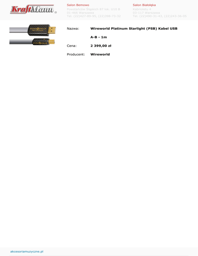 Salon Bemowo Salon Białołęka Powstańców Śląskich 87 lok. U10 B 01-466 Warszawa Tel. (22)427-89-95, (22)398-73-32 Kabrioletu 4 03-117 Warszawa Tel. (22)490-31-43, (22)243-36-05 Nazwa: Wireworld Platinum Starlight (PSB) Kabel USB A-B - 1m akcesoriamuzyczne.pl Cena: 2 399,00 zł Producent: Wireworld