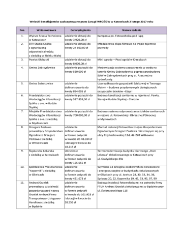 Wnioski Beneficjentów zaakceptowane przez Zarząd WFOŚiGW w Katowicach 2 lutego 2017 roku Poz. 1. Wnioskodawca 3. Wyższa Szkoła Techniczna w Katowicach BTV Studio Spółka z ograniczoną odpowiedzialnością z siedzibą w Bielsku-Białej Powiat Kłobucki 4. Gmina Zebrzydowice 5. Gmina Sośnicowice 6. Przedsiębiorstwo Wodociągów i Kanalizacji Spółka z o.o. w Rudzie Śląskiej Miejskie Przedsiębiorstwo Wodociągów i Kanalizacji Spółka z o.o. z siedzibą w Mysłowicach Grzegorz Postawa prowadzący Gospodarstwo Ogrodnicze Grzegorz Postawa z siedzibą w Witkowicach 2. 7. 8. 9. 10. 11. Cel wystąpienia Nazwa zadania udzielenie dotacji do kwoty 3 920,00 zł udzielenie dotacji do kwoty 24 660,00 zł Kampania pn. Fotowoltaika pod lupą udzielenie dotacji do kwoty 8 000,00 zł udzielenie pożyczki do kwoty 560.000 zł Mini ogrody – Ptasi ogród w Krzepicach udzielenie dofinansowania do kwoty 894.005 zł udzielenie pożyczki do kwoty 527.859,00 zł udzielenie pożyczki do kwoty 700.000,00 zł udzielenie dofinansowania w formie pożyczki w kwocie do 48.034 zł i dotacji w kwocie do 18.215 zł Śląska Izba Lekarska Udzielenie z siedzibą w Katowicach dofinansowania w formie pożyczki do kwoty 155.655 zł Spółdzielnia Mieszkaniowa udzielenie "Kopernik" z siedzibą dofinansowania w Gliwicach w formie pożyczki do kwoty 421.673 zł Andrzej Grzelak udzielenie prowadzący działalność dofinansowania gospodarczą pod nazwą w formie pożyczki Grzelak Andrzej Firma w kwocie do 101.923 zł Transportowo-Usługowo- i dotacji w kwocie do 38.556 zł Handlowa z siedzibą w Będzinie Młodzieżowa ekipa filmowa na tropie tajemnic przyrody Modernizacja systemu zaopatrzenia w wodę na terenie Gminy Zebrzydowice poprzez przebudowę SUW w Zebrzydowicach przy ul. Rzecznej na hydrofornię Uporządkowanie gospodarki ściekowej w Tworogu Małym – budowa przydomowych biologicznych oczyszczalni ścieków –Etap I Budowa kanalizacji sanitarnej w rejonie ul. Pawła, Starej w Rudzie Śląskiej - Chebziu Budowa systemu odprowadzania ścieków sanitarnych w rejonie ul. Katowickiej i Obrzeżnej Północnej w Mysłowicach Montaż instalacji fotowoltaicznej na Gospodarstwie Ogrodniczym Grzegorz Postawa mieszczącym się przy ulicy Częstochowskiej 11d, 42-270 Witkowice Termomodernizacja budynku biurowego „Dom Lekarza” zlokalizowanego w Katowicach przy ul. Grażyńskiego 49a Wymiana 13 dźwigów osobowych na nowoczesne i energooszczędne w budynkach zlokalizowanych w Gliwicach przy ul. Jowisza 28, 30, 32, 34, 36, Syriusza 20, 22, Kopernika 19, 45, 93, 95, 97, 99 Budowa instalacji fotowoltaicznej na potrzeby firmy FTUH Andrzej Grzelak zlokalizowanej w Będzinie przy ul. Świerczewskiego 115 Poz. 12. 13. Wnioskodawca Cel wystąpienia Spółdzielnia Mieszkaniowa udzielenie "MIECHOWICE" z siedzibą dofinansowania w Bytomiu w formie pożyczki w kwocie do 463.837 zł Gmina Czeladź udzielenie dofinansowania w formie dotacji do kwoty 137.024 zł oraz pożyczki do kwoty 592.350 zł Nazwa zadania Usunięcie płyt zawierających azbest ze ścian budynków mieszkalnych w Bytomiu, przy ul. Nickla 83-85-87-89, Nickla 91-93-95, Nickla 97-99-101, Nickla 113-115, Felińskiego 147-149 Przebudowa budynku użyteczności publicznej z dostosowaniem do potrzeb Centrum Społeczno Kulturalnego wraz z jego modernizacją oraz budową miejsc postojowych - Etap I przebudowa z termomodernizacją budynku użyteczności publicznej