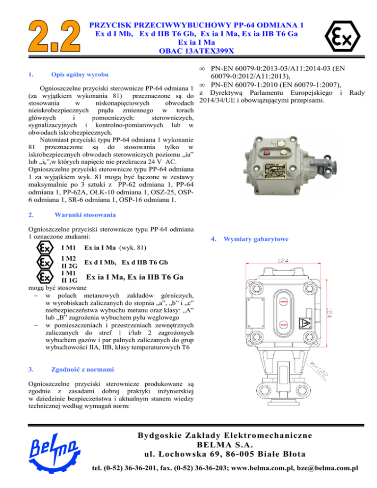 PRZYCISK PRZECIWWYBUCHOWY PP-64 ODMIANA 1 Ex d I Mb, Ex d IIB T6 Gb, Ex ia I Ma, Ex ia IIB T6 Ga Ex ia I Ma OBAC 13ATEX399X • PN-EN 60079-0:2013-03/A11:2014-03 (EN 60079-0:2012/A11:2013), • PN-EN 60079-1:2010 (EN 60079-1:2007), Ognioszczelne przyciski sterownicze PP-64 odmiana 1 z Dyrektywą Parlamentu Europejskiego i Rady (za wyjątkiem wykonania 81) przeznaczone są do stosowania w niskonapięciowych obwodach 2014/34/UE i obowiązującymi przepisami. 1. Opis ogólny wyrobu nieiskrobezpiecznych prądu zmiennego w torach głównych i pomocniczych: sterowniczych, sygnalizacyjnych i kontrolno-pomiarowych lub w obwodach iskrobezpiecznych. Natomiast przyciski typu PP-64 odmiana 1 wykonanie 81 przeznaczone są do stosowania tylko w iskrobezpiecznych obwodach sterowniczych poziomu „ia” lub „ib”,w których napięcie nie przekracza 24 V AC. Ognioszczelne przyciski sterownicze typu PP-64 odmiana 1 za wyjątkiem wyk. 81 mogą być łączone w zestawy maksymalnie po 3 sztuki z PP-62 odmiana 1, PP-64 odmiana 1, PP-62A, OŁK-10 odmiana 1, OSZ-25, OSP6 odmiana 1, SR-6 odmiana 1, OSP-16 odmiana 1. 2. Warunki stosowania Ognioszczelne przyciski sterownicze typu PP-64 odmiana 1 oznaczone znakami: I M1 4. Wymiary gabarytowe Ex ia I Ma (wyk. 81) I M2 Ex d I Mb, Ex d IIB T6 Gb II 2G I M1 II 1G Ex ia I Ma, Ex ia IIB T6 Ga mogą być stosowane − w polach metanowych zakładów górniczych, w wyrobiskach zaliczanych do stopnia „a”, „b” i „c” niebezpieczeństwa wybuchu metanu oraz klasy: „A” lub „B” zagrożenia wybuchem pyłu węglowego − w pomieszczeniach i przestrzeniach zewnętrznych zaliczanych do stref 1 i/lub 2 zagrożonych wybuchem gazów i par palnych zaliczanych do grup wybuchowości IIA, IIB, klasy temperaturowych T6 3. Zgodność z normami Ognioszczelne przyciski sterownicze produkowane są zgodnie z zasadami dobrej praktyki inżynierskiej w dziedzinie bezpieczeństwa i aktualnym stanem wiedzy technicznej według wymagań norm: Bydgoskie Zakłady Elektromechaniczne BELMA S.A. ul. Łochowska 69, 86-005 Białe Błota tel. (0-52) 36-36-201, fax. (0-52) 36-36-203; www.belma.com.pl, [email protected] 5. Parametry techniczne Podstawowe parametry przycisków PP-64 odmiana 1: Parametr Znamionowe napięcie izolacji Znamionowe napięcie łączeniowe Znamionowy prąd łączeniowy Prąd znamionowy ciągły Jed. V V A A Pozostałe wykonania 500 500 AC lub ∑ Ui ≤90 - dla obwodów iskro. na jeden łącznik 2,5 lub 1,6 dla obwodów iskro. na jeden łącznik 6 lub 1,6 - dla obwodów iskro. na jeden łącznik 1x106 120 AC - 15 wyk.81 24 AC 0,042 0,042 Trwałość mechaniczna cykle Znamionowa częstość łączeń ł/h Kategoria użytkowania Zaciski do przyłączania przewodów o max przekroju mm2 2,5 żyły Średnica zewnętrzna przewodu/kabla mm 6÷30* Masa kg ~ 4,5 Stopień ochrony IP 55 * w zależności od zastosowanych zespołów wpustowych tj. Ø 6-10mm –W10M; Ø 10-20mm –W20M; Ø 20-30mm – W30M. Standardowo przyciski PP-64 odmiana 1 są wyposażone w zespoły wpustowe dla średnic zewnętrznych wprowadzanych przewodów od 10-20mm. 6. Zamienność stosowania Ognioszczelne przyciski sterownicze typu PP-64 odmiana 1 oznaczone znakiem OBAC 13ATEX399X mogą być stosowane w instalacjach elektrycznych w miejsce dotychczas stosowanych przycisków sterowniczych odpowiednich typów oznaczonych znakiem: − KDB 08ATEX003X − KDB 04ATEX101X − KDB Nr 98.317W. − KDB Nr 98.318W, − KDB Nr 99.256W(PS-6), − KDB Nr 99.294W(PS-60) 7. Sposób zamawiania W składanym zamówieniu należy podać nazwę wyrobu oraz wykonanie składające się z: - 1 cyfra - program łączeń z tabeli poniżej - 2 cyfra – ilość zespołów wpustowych (1 lub 2 szt.) Przykład: Przycisk PP-64 odmiana 1 wyk. 22 Tabela wykonań