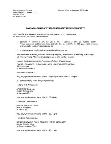 Zielonogórskie Zakłady Usług Miejskich Spółka z o. o., Zielona Góra, ul. Masarska 13 Zielona Góra, 6 listopada 2008 roku ZAWIADOMIENIE O WYBORZE NAJKORZYSTNIEJSZEJ OFERTY ZIELONOGÓRSKIE ZAKŁADY USŁUG MIEJSKICH Spółka z o. o., Zielona Góra, ul. Masarska 13, zw. dalej „zamawiającym” 1. działając w oparciu o art. 92 ust 1 pkt. 1 ustawy z dnia 29 stycznia 2004r. Prawo zamówień publicznych (tekst jednolity Dz. U. z 2007r. Nr 233, poz. 1655 ze zm.), zwanym dalej „ustawą”, zawiadamia, że 1) w postępowaniu o udzielenie zamówienia publicznego na: Bezpośrednia ochrona fizyczna obiektu ( miejsca) Palmiarnia w Zielonej Górze przy ul. Wrocławskiej 12a oraz znajdujące się w nim osoby i mienie. zwanym dalej „postępowaniem” wybrano ofertę nr 9 Wykonawcy: ZAKŁAD USŁUGOWO - BUDOWLANY „WIW – BUD” ANDRZEJ WASZAK 59-220 Legnica ul. Płk Karola Myrka 6 Uzasadnienie wyboru: Przy jedynym kryterium: cena 100 % - najkorzystniejsza oferta – 100 pkt 2) ponadto oferty swoje złożyli Wykonawcy: - oferta nr 1 Wykonawcy: APEXIM BIS Sp. z o.o. 65-225 Zielona Góra ul. Lwowska 25, Przy jedynym kryterium: cena 100 % - 68,66 pkt - oferta nr 2 Wykonawcy: G4S SECURITY SP. Z O.O. 00-838 Warszawa ul. Prosta 69, Przy jedynym kryterium: cena 100 % - 59,15 pkt - oferta nr 3 Wykonawcy: KONCESJONOWANA FIRMA OCHRONY MIENIA „HERKULES” 66-400 Gorzów Wlkp. ul. Paderewskiego 30/ 4, Przy jedynym kryterium: cena 100 % - 75,11 pkt - oferta nr 5 Wykonawcy: AGENCJA OCHRONY OSÓB I MIENIA „ROMA” 01-699 Warszawa ul. Parandowskiego 37, Przy jedynym kryterium: cena 100 % - 75,32 pkt - oferta nr 6 Wykonawcy: ELITARNE BIURO OCHRONY BIZNESU „GROM” 33-300 Nowy Sącz ul. Kilińskiego 46, Przy jedynym kryterium: cena 100 % - 62,60 pkt - oferta nr 7 Wykonawcy: „YAX” – WLEKLIK 59-220 Legnica ul. Wjazdowa 5, Przy jedynym kryterium: cena 100 % - 74,21 pkt - oferta nr 8 Wykonawcy: „PERFECT” OCHRONA MIENIA I OSÓB Sp. z o.o. 65-516 Zielona Góra, ul. Ogrodowa 50, Przy jedynym kryterium: cena 100 % - 50,08 pkt - oferta nr 10 Wykonawcy: EKOTRADE Sp. z o.o. 00-850 Warszawa ul. Prosta 2/14, Przy jedynym kryterium: cena 100 % - 68,47 pkt - oferta nr 11 Wykonawcy: SPÓŁDZIELNIA USŁUGOWA „PIAST” 59-220 Legnica ul. Jaworzyńska 67, Przy jedynym kryterium: cena 100 % - 86,05 pkt - oferta nr 12 Wykonawcy: BIURO HANDLOWO-USŁUGOWE „VIGOR” ADAM URBANEK 61-361 Poznań ul. Starołęcka 18 Przy jedynym kryterium: cena 100 % - 95,46 pkt 2. Działając na podstawie art. 92 ust. 1 pkt 2 ustawy zamawiający zawiadamia, że: odrzucił ofertę nr 4 Wykonawcy: ZAKŁAD USŁUG GOSPODARCZO-SOCJALNYCH „ANTEMA” Sp. z o.o. 58-506 Jelenia Góra Al. Jana Pawła II 8 a Uzasadnienie faktyczne i prawne: zamawiający stwierdził błędy w obliczeniu ceny, oferta winna zawierać oferowaną przez Wykonawcę miesięczną cenę ryczałtową netto, miesięczny podatek VAT i miesięczną cenę ryczałtową brutto. Wykonawca podał wartości z błędami w obliczeniu ceny. Zamawiający działając na podstawie art. 89 ust. 1 pkt 6 ustawy odrzucił ofertę zawierającą błędy w obliczeniu ceny. 3. Działając na podstawie art. 94 ust. 1 ustawy zamawiający informuje, że: w wyniku przedmiotowego postępowania umowa zawarta będzie z Wykonawcą wybranej oferty w terminie nie krótszym niż 7 dni od dnia przekazania zawiadomienia o wyborze oferty, nie później niż przed upływem terminu związania ofertą.