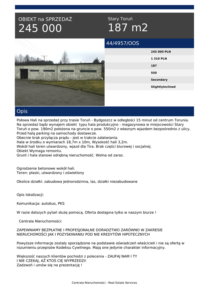 OBIEKT na SPRZEDAŻ 245 000 Stary Toruń 187 m2 44/4957/OOS 245 000 PLN 1 310 PLN 187 550 Secondary SlightlyInclined Opis Połowa Hali na sprzedaż przy trasie Toruń - Bydgoszcz w odległości 15 minut od centrum Torunia. Na sprzedaż bądz wynajem obiekt typu hala produkcyjno - magazynowa w miejscowości Stary Toruń o pow. 190m2 położona na gruncie o pow. 550m2 z własnym wjazdem bezpośrednio z ulicy. Przed halą parking na samochody dostawcze. Obecnie brak przyłącza prądu - jest w trakcie załatwiania. Hala w środku o wymiarach 18,7m x 10m, Wysokość hali 3,2m. Wokół hali teren utwardzony, wjazd dla Tira. Brak części biurowej i socjalnej. Obiekt Wymaga remontu. Grunt i hala stanowi odrębną nieruchomość. Wolna od zaraz. Ogrodzenie betonowe wokół hali. Teren: płaski, utwardzony i oświetlony Okolice działki: zabudowa jednorodzinna, las, działki niezabudowane Opis lokalizacji: Komunikacja: autobus, PKS W razie dalszych pytań służę pomocą. Oferta dostępna tylko w naszym biurze ! Centrala Nieruchomości: ZAPEWNIAMY BEZPŁATNE I PROFESJONALNE DORADZTWO ZARÓWNO W ZAKRESIE NIERUCHOMOŚCI JAK I POZYSKIWANIU POD NIE KREDYTÓW HIPOTECZNYCH Powyższe informacje zostały sporządzone na podstawie oświadczeń właścicieli i nie są ofertą w rozumieniu przepisów Kodeksu Cywilnego. Mają one jedynie charakter informacyjny. Większość naszych klientów pochodzi z polecenia - ZAUFAJ NAM I TY I NIE CZEKAJ, AŻ KTOŚ CIĘ WYPRZEDZI! Zadzwoń i umów się na prezentację ! Centrala Nieruchomości - Real Estate Services Nr licencji pośrednika odpowiedzialnego za wykonanie umowy pośrednictwa 14260. zobacz inne nasze oferty na www.centralanieruchomosci.pl facebook.com/Centrala.N Karolina Rutkowska tel. (+48) 663 899 715 email: [email protected] Centrala Nieruchomości - Real Estate Services Powered by TCPDF (www.tcpdf.org)