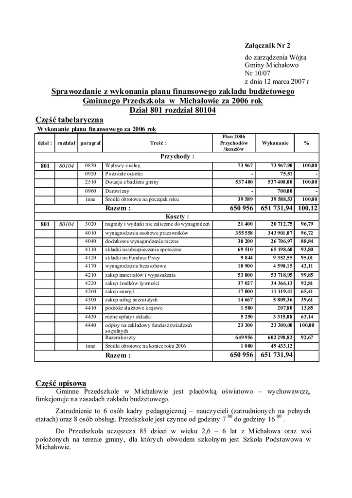 Załącznik Nr 2 do zarządzenia Wójta Gminy M ichałowo Nr 10/07 z dnia 12 marca 2007 r Sprawozdanie z wykonania planu finansowego zakładu budŜetowego Gminnego Przedszkola w Michałowie za 2006 rok Dział 801 rozdział 80104 Część tabelaryczna Wykonanie planu finansowe go za 2006 rok dział : rozdział paragraf Treść : Plan 2006 Przychodów /kosztów Wykonanie % Prz ychody : 801 80104 0830 Wpływy z usług 73 967 0920 P ozostałe odsetki 2510 Dotacja z budŜetu gminy 0960 Darowizny inne Środki obrotowe na początek roku Razem : 73 967,90 100,00 - 75,51 - 537 400 537 400,00 100,00 - 700,00 - 39 589 39 588,53 100,00 650 956 651 731,94 100,12 Kosz ty : 801 80104 3020 nagrody i wydatki nie zaliczane do wynagrodzeń 21 400 20 712,75 96,79 4010 wynagrodzenia osobowe pracowników 4040 dodatkowe wynagrodzenie roczne 355 558 343 901,07 96,72 30 200 26 706,97 88,84 4110 składki na ubezpieczenie społeczne 4120 składki na Fundusz P racy 69 510 65 198,60 93,80 9 844 9 352,55 95,01 4170 wynagrodzenia bezosobowe 10 900 4 590,15 42,11 4210 zakup materiałów i wyposaŜenia 53 800 53 718,95 99,85 4220 zakup środków Ŝywności 37 027 34 366,13 92,81 4260 zakup energii 17 000 11 119,41 65,41 4300 zakup usług pozostałych 14 667 5 809,36 39,61 4410 podróŜe słuŜbowe krajowe 1 500 207,80 13,85 4430 róŜne opłaty i składki 5 250 3 315,08 63,14 4440 odpisy na zakładowy fundusz świadczeń socjalnych Razem koszty 23 300 23 300,00 100,00 649 956 602 298,82 92,67 1 000 49 433,12 650 956 651 731,94 inne Środki obrotowe na koniec roku 2006 Razem : Część opisowa Gminne Przedszkole w M ichałowie jest placówką oświatowo – wychowawczą, funkcjonuje na zasadach zakładu budŜetowego. Zatrudnienie to 6 osób kadry pedagogicznej – nauczycieli (zatrudnionych na pełnych etatach) oraz 8 osób obsługi. Przedszkole jest czynne od godziny 7 00 do godziny 16 00 . Do Przedszkola uczęszcza 85 dzieci w wieku 2,6 – 6 lat z M ichałowa oraz wsi połoŜonych na terenie gminy, dla których obwodem szkolnym jest Szkoła Podstawowa w M ichałowie. Wszystkie dzieci 6 letnie są objęte nauczaniem języka angielskiego. Dzieci mające wady wymowy uczęszczają na zajęcia z logopedą ( 26 dzieci). Dodatkowo realizowane są zajęcia indywidualne w wymiarze 5 godzin tygodniowo z jednym dzieckiem. Planowane na 2006 rok przychody wraz z saldem początkowym 650 956 zł – wykonanie 651 731,94 zł tj. 94,04 %. W tym z tytułu odpłatności rodziców za pobyt dzieci w Przedszkolu 73 967,90 zł na planowane 73 967 zł. Dotacja z budŜetu gminy 537 400 zł, zgodnie z zaplanowaną. Pozostałe przychody w kwocie 775,51 zł to darowizna oraz odsetki bankowe od środków zgromadzonych na rachunku bankowym Środki obrotowe: na rachunku bankowym na początek roku 39 588,53 zł, zapasy materiałów (opał i Ŝywność) 9 477,74 zł, zobowiązania z tytułu wypłaconych w 2006 roku dodatkowych wynagrodzeń za 2005 rok 30 993,75 zł. Środki obrotowe netto - 18 072,52 zł. . Koszty poniesione w okresie sprawozdawczym to kwota 602 298,82 zł - 92,67%. W tym: • • • • środki czystości, bhp, ubrania robocze i ochronne o wartości ......................4 705,44 zł dodatki wiejskie i mieszkaniowe ................................................................16 007,31 zł wynagrodzenie pracowników wraz z 13 – tką i składkami pochodnymi .445 159,19 zł wynagrodzenia bezosobowe – umowy – zlecania ........................................4 590,15 zł (wydatki na opłacenie dodatkowych zajęć języka angielskiego oraz logopedycznych oraz opłacenie kosztów indywidualnych zajęć korekcyjnych) • zakup materiałów i wyposaŜenia koszty .....................................................53 718,95 zł z tego, między innymi: literatura metodyczna zakupiona do doskonalenia zawodowego, poradniki, ksiąŜki metodyczne, wyposaŜenie gabinetu logopedycznego ........................2 590,00 zł zabawki dla dzieci i pomoce metodyczne dla nauczycieli...................8 362,90 zł wyposaŜenie sal zajęć i przedszkola....................................................4 225,00 zł (stoliki, krzesełka, niszczarka, wiertarka, rozdrabniacz) materiały do drobnych napraw i remontów pomieszczeń (naprawa świetlówek, malowanie bloku Ŝywieniowego, malowanie łazienek dla dzieci, szafki biurowe, artykuły do wykonania: dekoracji ściany, remontu pokoju administracyjnego, schodów wejściowych do przedszkola, ocieplenia podpiwniczenia) .5 926,33 zł środki czystości....................................................................................5 090,20 zł wyposaŜenie kuchni, zmywalni, naczynia stołowe..............................2 233,69 zł materiały biurowe (druki, papier, tusz do drukarki, materiały dekoracyjne) 4 170,00 zł wyposaŜenie pozostałe(uchwyty na papier, pieczątki, świetlówki, apteczka, benzyna do kosiarki itp.).................................................................... 2 283,84 zł opał do ogrzewania pomieszczeń i wody...........................................19 670,52 zł • Ŝywność do przygotowania posiłków koszt.................................................34 366,13 zł • energia elektryczna i woda ..........................................................................11 119,41 zł • zakup usług pozostałych na kwotę.................................................................5 809,36 zł w tym: prowizja i opłaty bankowe kwota.........................................................759,32 zł szkolenie pracowników........................................................................320,00 zł rozmowy telefoniczne wraz z abonamentem.....................................2 028,02 zł wyjazdy dzieci do Teatru – koszt autokaru ..........................................227,00 zł remont schodów przed budynkiem ....................................................1 513,75 zł • • • usługi pozostałe: przegląd gaśnic, czyszczenie przewodów k