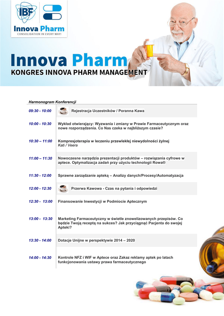 Harmonogram Konferencji 09:30 - 10:00 Rejestracja Uczestników / Poranna Kawa 10:00 - 10:30 Wykład otwierający: Wyzwania i zmiany w Prawie Farmaceutycznym oraz nowe rozporządzenia. Co Nas czeka w najbliższym czasie? 10:30 – 11:00 Kompresjoterapia w leczeniu przewlekłej niewydolności żylnej Kati / Veera 11:00 – 11:30 Nowoczesne narzędzia prezentacji produktów – rozwiązania cyfrowe w aptece. Optymalizacja zadań przy użyciu technologii Rowa® 11:30 - 12:00 Sprawne zarządzanie apteką – Analizy danych/Procesy/Automatyzacja 12:00 - 12:30 Przerwa Kawowa - Czas na pytania i odpowiedzi 12:30 - 13:00 Finansowanie Inwestycji w Podmiocie Aptecznym 13:00 - 13:30 Marketing Farmaceutyczny w świetle znowelizowanych przepisów. Co będzie Twoją receptą na sukces? Jak przyciągnąć Pacjenta do swojej Apteki? 13:30 - 14:00 Dotacje Unijne w perspektywie 2014 – 2020 14:00 - 14:30 Kontrole NFZ i WIF w Aptece oraz Zakaz reklamy aptek po latach funkcjonowania ustawy prawa farmaceutycznego