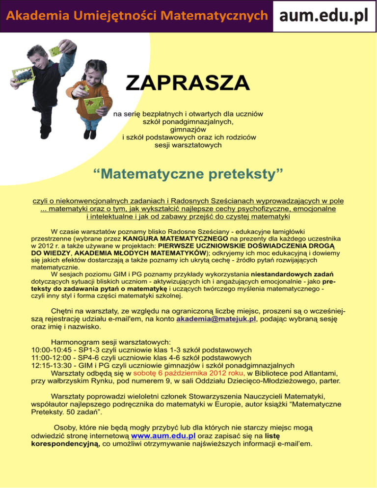 ZAPRASZA na seriê bezp³atnych i otwartych dla uczniów szkó³ ponadgimnazjalnych, gimnazjów i szkó³ podstawowych oraz ich rodziców sesji warsztatowych “Matematyczne preteksty” czyli o niekonwencjonalnych zadaniach i Radosnych Szeœcianach wyprowadzaj¹cych w pole ... matematyki oraz o tym, jak wykszta³ciæ najlepsze cechy psychofizyczne, emocjonalne i intelektualne i jak od zabawy przejœæ do czystej matematyki W czasie warsztatów poznamy blisko Radosne Szeœciany - edukacyjne ³amig³ówki przestrzenne (wybrane przez KANGURA MATEMATYCZNEGO na prezenty dla ka¿dego uczestnika w 2012 r. a tak¿e u¿ywane w projektach: PIERWSZE UCZNIOWSKIE DOŒWIADCZENIA DROG¥ DO WIEDZY, AKADEMIA M£ODYCH MATEMATYKÓW); odkryjemy ich moc edukacyjn¹ i dowiemy siê jakich efektów dostarczaj¹ a tak¿e poznamy ich ukryt¹ cechê - Ÿród³o pytañ rozwijaj¹cych matematycznie. W sesjach poziomu GIM i PG poznamy przyk³ady wykorzystania niestandardowych zadañ dotycz¹cych sytuacji bliskich uczniom - aktywizuj¹cych ich i anga¿uj¹cych emocjonalnie - jako preteksty do zadawania pytañ o matematykê i ucz¹cych twórczego myœlenia matematycznego czyli inny styl i forma czêœci matematyki szkolnej. Chêtni na warsztaty, ze wzglêdu na ograniczon¹ liczbê miejsc, proszeni s¹ o wczeœniejsz¹ rejestracjê udzia³u e-mail'em, na konto [email protected], podaj¹c wybran¹ sesjê oraz imiê i nazwisko. Harmonogram sesji warsztatowych: 10:00-10:45 - SP1-3 czyli uczniowie klas 1-3 szkó³ podstawowych 11:00-12:00 - SP4-6 czyli uczniowie klas 4-6 szkó³ podstawowych 12:15-13:30 - GIM i PG czyli uczniowie gimnazjów i szkó³ ponadgimnazjalnych Warsztaty odbêd¹ siê w sobotê 6 paŸdziernika 2012 roku, w Bibliotece pod Atlantami, przy wa³brzyskim Rynku, pod numerem 9, w sali Oddzia³u Dzieciêco-M³odzie¿owego, parter. Warsztaty poprowadzi wieloletni cz³onek Stowarzyszenia Nauczycieli Matematyki, wspó³autor najlepszego podrêcznika do matematyki w Europie, autor ksi¹¿ki “Matematyczne Preteksty. 50 zadañ”. Osoby, które nie bêd¹ mog³y przybyæ lub dla których nie starczy miejsc mog¹ odwiedziæ stronê internetow¹ www.aum.edu.pl oraz zapisaæ siê na listê korespondencyjn¹, co umo¿liwi otrzymywanie najœwie¿szych informacji e-mail’em.