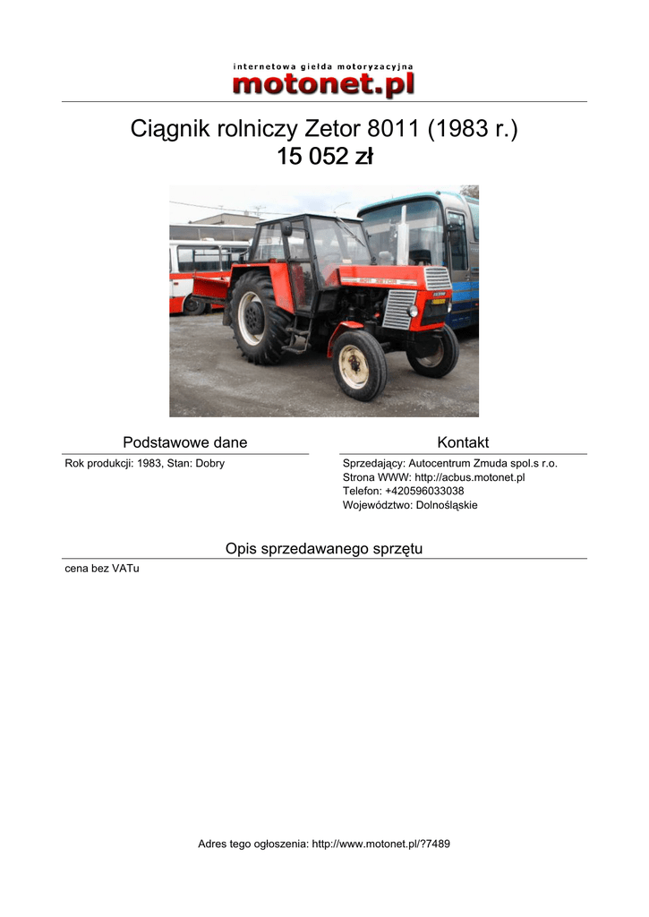 Ciągnik rolniczy Zetor 8011 (1983 r.) 15 052 zł Podstawowe dane Rok produkcji: 1983, Stan: Dobry Kontakt Sprzedający: Autocentrum Zmuda spol.s r.o. Strona WWW: http://acbus.motonet.pl Telefon: +420596033038 Województwo: Dolnośląskie Opis sprzedawanego sprzętu cena bez VATu Adres tego ogłoszenia: http://www.motonet.pl/?7489