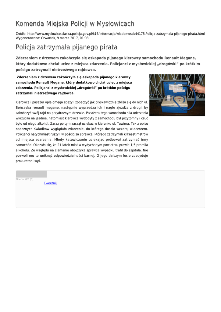 Komenda Miejska Policji w Mysłowicach Źródło: http://www.myslowice.slaska.policja.gov.pl/k16/informacje/wiadomosci/44175,Policja-zatrzymala-pijanego-pirata.html Wygenerowano: Czwartek, 9 marca 2017, 01:08 Policja zatrzymała pijanego pirata Zderzeniem z drzewem zakończyła się eskapada pijanego kierowcy samochodu Renault Megane, który dodatkowo chciał uciec z miejsca zdarzenia. Policjanci z mysłowickiej „drogówki” po krótkim pościgu zatrzymali nietrzeźwego rajdowca. Zderzeniem z drzewem zakończyła się eskapada pijanego kierowcy samochodu Renault Megane, który dodatkowo chciał uciec z miejsca zdarzenia. Policjanci z mysłowickiej „drogówki” po krótkim pościgu zatrzymali nietrzeźwego rajdowca. Kierowca i pasażer opla omega zdążyli zobaczyć jak błyskawicznie zbliża się do nich ul. Bończyka renault megane, następnie wyprzedza ich i nagle zjeżdża z drogi, by zakończyć swój rajd na przydrożnym drzewie. Pasażera tego samochodu siła uderzenia wyrzuciła na jezdnię, natomiast kierowca wydobyty z samochodu był przytomny i czuć było od niego alkohol. Zaraz po tym zaczął uciekać w kierunku ul. Tuwima. Tak z opisu naocznych świadków wyglądało zdarzenie, do którego doszło wczoraj wieczorem. Policjanci natychmiast ruszyli w pościg za sprawcą, którego zatrzymali kilkaset metrów od miejsca zdarzenia. Młody katowiczanin uciekając próbował zatrzymać inny samochód. Okazało się, że 21-latek miał w wydychanym powietrzu prawie 1,5 promila alkoholu. Ze względu na złamanie obojczyka sprawca wypadku trafił do szpitala. Nie pozwoli mu to uniknąć odpowiedzialności karnej. O jego dalszym losie zdecyduje prokurator i sąd. Ocena: 0/5 (0) Tweetnij