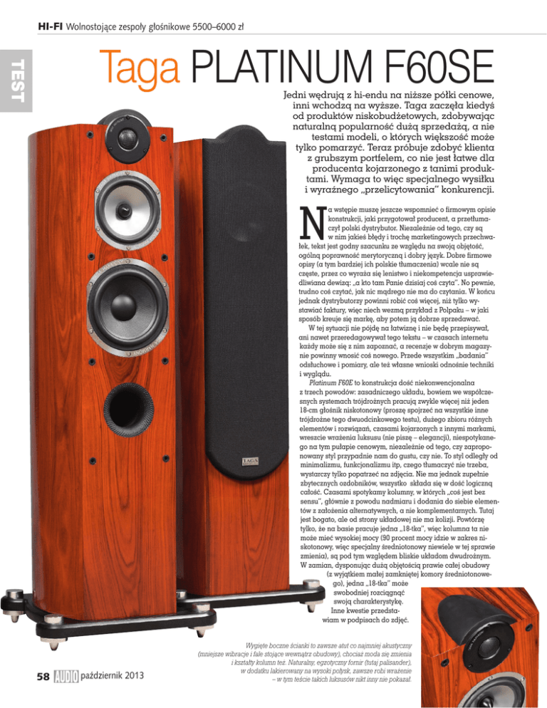 HI-FI Wolnostojące zespoły głośnikowe 5500–6000 zł TEST Taga PLATINUM F60SE Jedni wędrują z hi-endu na niższe półki cenowe, inni wchodzą na wyższe. Taga zaczęła kiedyś od produktów niskobudżetowych, zdobywając naturalną popularność dużą sprzedażą, a nie testami modeli, o których większość może tylko pomarzyć. Teraz próbuje zdobyć klienta z grubszym portfelem, co nie jest łatwe dla producenta kojarzonego z tanimi produktami. Wymaga to więc specjalnego wysiłku i wyraźnego „przelicytowania” konkurencji. N a wstępie muszę jeszcze wspomnieć o firmowym opisie konstrukcji, jaki przygotował producent, a przetłumaczył polski dystrybutor. Niezależnie od tego, czy są w nim jakieś błędy i trochę marketingowych przechwałek, tekst jest godny szacunku ze względu na swoją objętość, ogólną poprawność merytoryczną i dobry język. Dobre firmowe opisy (a tym bardziej ich polskie tłumaczenia) wcale nie są częste, przez co wyraża się lenistwo i niekompetencja usprawiedliwiana dewizą: „a kto tam Panie dzisiaj coś czyta”. No pewnie, trudno coś czytać, jak nic mądrego nie ma do czytania. W końcu jednak dystrybutorzy powinni robić coś więcej, niż tylko wystawiać faktury, więc niech wezmą przykład z Polpaku – w jaki sposób kreuje się markę, aby potem ją dobrze sprzedawać. W tej sytuacji nie pójdę na łatwiznę i nie będę przepisywał, ani nawet przeredagowywał tego tekstu – w czasach internetu każdy może się z nim zapoznać, a recenzje w dobrym magazynie powinny wnosić coś nowego. Przede wszystkim „badania” odsłuchowe i pomiary, ale też własne wnioski odnośnie techniki i wyglądu. Platinum F60E to konstrukcja dość niekonwencjonalna z trzech powodów: zasadniczego układu, bowiem we współczesnych systemach trójdrożnych pracują zwykle więcej niż jeden 18-cm głośnik niskotonowy (proszę spojrzeć na wszystkie inne trójdrożne tego dwuodcinkowego testu), dużego zbioru różnych elementów i rozwiązań, czasami kojarzonych z innymi markami, wreszcie wrażenia luksusu (nie piszę – elegancji), niespotykanego na tym pułapie cenowym, niezależnie od tego, czy zaproponowany styl przypadnie nam do gustu, czy nie. To styl odległy od minimalizmu, funkcjonalizmu itp, czego tłumaczyć nie trzeba, wystarczy tylko popatrzeć na zdjęcia. Nie ma jednak zupełnie zbytecznych ozdobników, wszystko składa się w dość logiczną całość. Czasami spotykamy kolumny, w których „coś jest bez sensu”, głównie z powodu nadmiaru i dodania do siebie elementów z założenia alternatywnych, a nie komplementarnych. Tutaj jest bogato, ale od strony układowej nie ma kolizji. Powtórzę tylko, że na basie pracuje jedna „18-tka”, więc kolumna ta nie może mieć wysokiej mocy (90 procent mocy idzie w zakres niskotonowy, więc specjalny średniotonowy niewiele w tej sprawie zmienia), są pod tym względem bliskie układom dwudrożnym. W zamian, dysponując dużą objętością prawie całej obudowy (z wyjątkiem małej zamkniętej komory średniotonowego), jedna „18-tka” może swobodniej rozciągnąć swoją charakterystykę. Inne kwestie przedstawiam w podpisach do zdjęć. 58 październik 2013 Wygięte boczne ścianki to zawsze atut co najmniej akustyczny (mniejsze wibracje i fale stojące wewnątrz obudowy), chociaż moda się zmienia i kształty kolumn też. Naturalny, egzotyczny fornir (tutaj palisander), w dodatku lakierowany na wysoki połysk, zawsze robi wrażenie – w tym teście takich luksusów nikt inny nie pokazał. www.audio.com.pl Cokolisko i wielkie kolce – mogą się podobać bardzo, średnio lub wcale, ale swoją rolę spełnią świetnie, szeroko rozstawione i łatwe do wyregulowania. R E K L A M A Tytanową kopułkę osłania dodatkowo metalowa siateczka (niezależnie od głównej maskownicy, którą można zdjąć), mogąca pełnić dodatkową funkcję dyfuzora. Lekkie wysunięcie głośnika wysokotonowego (ponad górną krawędź obudowy) ze standardową (dużą) osłoną nie jest tak korzystne, jak w przypadku głośników wysokotonowych o niewielkiej całkowitej średnicy (powstaje problem fal odbijanych od dodatkowej, biegnącej łukiem krawędzi). Producent informuje, że w nowej wersji tego tweetera (instalowanej w tej kolumnie) zastosowano magnes neodymowy, co teoretycznie dało okazję do zmniejszenia jego frontu, ale wymagałoby przecież przekonstruowania górnej części obudowy. Głośnik średniotonowy ma membranę aluminiową i klasyczny „korektor fazy” – nieruchomy, w kształcie pocisku, pozwalający na wentylację cewki i „układający” charakterystykę przetwarzania. Setki drobnych wgłębień na wylocie basrefleksu... Najwyraźniej B&W nie udało się skutecznie opatentować swojego „flow-portu” albo skutecznie egzekwować swoich praw. Zresztą różne formy wyżłobień tego elementu, mające poprawiać przepływ powietrza, widzimy w konstrukcjach wielu firm. www.audio.com.pl Niskotonowy jest najbardziej oryginalny ze względu na materiał membrany – producent informuje, że wykonał ją z wełny; być może chodzi o mieszankę wełny z celulozą, a nawet jeżeli o czystą wełnę, to w wyniku jakiegoś procesu technologicznego tworzącą sztywną strukturę. Wcześniej wełna była znana w technice głośnikowej jako materiał rekomendowany do tłumienia linii transmisyjnych, ale już trzydzieści lat temu firma Vieta stosowała membrany z bawełny. Kształt terminala nawiązuje do poprzecznego przekroju obudowy, a same zaciski są znacznie solidniejsze, niż zwykle spotykane w tym zakresie cenowym (podobne ma ESA), chociaż daleko im jeszcze do (cen) WBT... październik 2013 59 HI-FI Wolnostojące zespoły głośnikowe 5500–6000 zł TEST Laboratorium Taga Harmony PLATINIUM F60SE LAB rys. 2. charakterystyka modułu impedancji. Byłem szczerze ciekaw, jak wygląda charakterystyka przetwarzania kolumny grającej tak szczególnie; trudno 