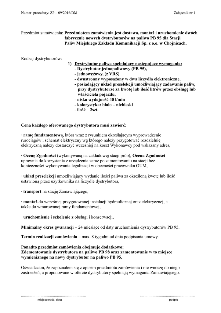 Numer procedury: ZP – 09/2016/DM Załącznik nr 1 Przedmiot zamówienia: Przedmiotem zamówienia jest dostawa, montaż i uruchomienie dwóch fabrycznie nowych dystrybutorów na paliwo PB 95 dla Stacji Paliw Miejskiego Zakładu Komunikacji Sp. z o.o. w Chojnicach. Rodzaj dystrybutorów: 1) Dystrybutor paliwa spełniający następujące wymagania: - Dystrybutor jednopaliwowy (PB 95), - jednowężowy, (z VRS) - dwustronny wyposażony w dwa liczydła elektroniczne, - posiadający układ preselekcji umożliwiający zadawanie paliw, przy dystrybutorze za kwotę lub ilość litrów przez obsługę lub właściciela pojazdu, - niska wydajność 40 l/min - kolorystyka: biało – niebieski - ilość – 2szt. Cena każdego oferowanego dystrybutora musi zawierć: · ramę fundamentową, którą wraz z rysunkiem określającym wyprowadzenie rurociągów i schemat elektryczny wg którego należy przygotować rozdzielnię elektryczną należy dostarczyć wcześniej na koszt Wykonawcy pod wskazany adres, · Ocenę Zgodności (wykonywaną na zakładowej stacji prób), Ocena Zgodności uprawnia do korzystania z urządzenia zaraz po zamontowaniu na stacji bez konieczności wykonywania legalizacji w obecności pracownika OUM, · układ preselekcji umożliwiający wydanie ilości paliwa za określoną kwotę lub ilość ustawioną przez użytkownika na liczydle dystrybutora, · transport na stację Zamawiającego, · montaż do wcześniej przygotowanej instalacji hydraulicznej oraz elektrycznej, a także do wmurowanej ramy fundamentowej, · uruchomienie i szkolenie z obsługi i konserwacji, Minimalny okres gwarancji – 24 miesiące od daty uruchomienia dystrybutorów PB 95. Termin realizacji zamówienia – max. 8 tygodni od dnia podpisania umowy. Ponadto przedmiot zamówienia obejmuje dodatkowo: Zdemontowanie dystrybutora na paliwo PB 98 oraz zamontowanie w to miejsce wymienianego na nowy dystrybutor na paliwo PB 95. Oświadczam, że zapoznałem się z opisem przedmiotu zamówienia i nie wnoszę do niego zastrzeżeń, a proponowane w ofercie dystrybutory spełniają wymagania Zamawiającego. ............................................................... miejscowość, data ..................................................... podpis