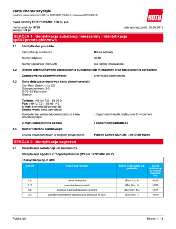 karta charakterystyki zgodnie z rozporządzeniem (WE) nr 1907/2006 (REACH), zmienionej 2015/830/UE Kwas octowy ROTIPURAN® 100 %, p.a. numer artykułu: 3738 Wersja: 1.0 pl data sporządzenia: 26.08.2015 SEKCJA 1: Identyfikacja substancji/mieszaniny i identyfikacja spółki/przedsiębiorstwa 1.1 1.2 Identyfikator produktu Identyfikacja substancji Kwas octowy Numer artykułu 3738 Numer rejestracji (REACH) nie istotne (mieszanina) Istotne zidentyfikowane zastosowania substancji lub mieszaniny oraz zastosowania odradzane Zastosowania zidentyfikowane: 1.3 chemikalia laboratoryjna Dane dotyczące dostawcy karty charakterystyki Carl Roth GmbH + Co KG Schoemperlenstr. 3-5 D-76185 Karlsruhe Niemcy Telefon: +49 (0) 721 - 56 06 0 Fax: +49 (0) 721 - 56 06 149 e-mail: [email protected] Strona www: www.carlroth.de 1.4 Kompetentna osoba odpowiedzialna za kartę charakterystyki : Department Health, Safety and Environment e-mail (kompetentna osoba) : [email protected] Numer telefonu alarmowego Służba powiadamianych w nagłych przypadkach Poison Centre Munich: +49/(0)89 19240 SEKCJA 2: Identyfikacja zagrożeń 2.1 Klasyfikacja substancji lub mieszaniny Klasyfikacja zgodnie z rozporządzeniem (WE) nr 1272/2008 (CLP) Klasyfikacja zg. z GHS Sekcja Klasa zagrożenia Klasa i kategoria zagrożenia Zwrot wskazujący rodzaj zagrożenia 2.6 ciecze łatwopalne (Flam. Liq. 3) H226 2.16 powoduje korozje metali (Met. Corr. 1) H290 3.2 działanie żrące/podrażniające na skórę (Skin Corr. 1A) H314 3.3 poważne uszkodzenie oczu/działanie drażniące na oczy (Eye Dam. 1) H318 Polska (pl) Strona 1 / 16 karta charakterystyki zgodnie z rozporządzeniem (WE) nr 1907/2006 (REACH), zmienionej 2015/830/UE Kwas octowy ROTIPURAN® 100 %, p.a. numer artykułu: 3738 Uwagi Pełny tekst zwrotów H: zob. SEKCJA 16. 2.2 Elementy oznakowania Oznakowania zgodnie z rozporządzeniem (WE) nr 1272/2008 (CLP) Hasło ostrzegawcze Niebezpieczeństwo Piktogramy Zwroty wskazujące rodzaj zagrożenia H226 H290 H314 Łatwopalna ciecz i pary. Może powodować korozję metali. Powoduje poważne oparzenia skóry oraz uszkodzenia oczu. Zwroty wskazujące środki ostrożności Zwroty wskazujące środki ostrożności - zapobieganie P210 Przechowywać z dala od źródeł ciepła, gorących powierzchni, źródeł iskrzenia, otwartego ognia i innych źródeł zapłonu. Nie palić. Stosować rękawice ochronne/odzież ochronną/ochronę oczu/ochronę twarzy. P280 Zwroty wskazujące środki ostrożności - reagowanie P303+P361+P353 P305+P351+P338 P310 W PRZYPADKU KONTATKU ZE SKÓRĄ (lub z włosami): Natychmiast zdjąć całą zanieczyszczoną odzież. Spłukać skórę pod strumieniem wody/prysznicem. W PRZYPADKU DOSTANIA SIĘ DO OCZU: ostrożnie płukać wodą przez kilka minut. Wyjąć soczewki kontaktowe, jeżeli są i można je łatwo usunąć. Kontynuować płukanie. Natychmiast skontaktować się z OŚRODKIEM ZATRUĆ/lekarzem. Niebezpieczne składniki do oznakowania: kwas octowy Oznakowanie opakowań, których zawartość nie przekracza 125 ml Hasło ostrzegawcze: Niebezpieczeństwo Symbol(-e) H314 Powoduje poważne oparzenia skóry oraz uszkodzenia oczu. P280 Stosować rękawice ochronne/odzież ochronną/ochronę oczu/ochronę twarzy. P303+P361+P353 W PRZYPADKU KONTATKU ZE SKÓRĄ (lub z włosami): Natychmiast zdjąć całą zanieczyszczoną odzież. Spłukać skórę pod strumieniem wody/prysznicem. P305+P351+P338 W PRZYPADKU DOSTANIA SIĘ DO OCZU: ostrożnie płukać wodą przez kilka minut. Wyjąć soczewki kontaktowe, jeżeli są i można je łatwo usunąć. Kontynuować płukanie. P310 Natychmiast skontaktować się z OŚRODKIEM ZATRUĆ/lekarzem. zawiera: Polska (pl) Kwas octowy Strona 2 / 16 karta charakterystyki zgodnie z rozporządzeniem (WE) nr 1907/2006 (REACH), zmienionej 2015/830/UE Kwas octowy ROTIPURAN® 100 %, p.a. numer artykułu: 3738 2.3 Inne zagrożenia Nie ma dodatkowych informacji. SEKCJA 3: Skład/informacja o składnikach 3.2 Mieszaniny Opis mieszanki Skład/informacja o składnikach. Nazwa substancji Identyfikator wt% Klasyfikacja zg. z 1272/2008/WE kwas octowy Nr. CAS 64-19-7 ≥ 96 Flam. Liq. 3 / H226 Met. Corr. 1 / H290 Skin Corr. 1A / H314 Piktogramy Nr. WE 200-580-7 Nr. indeksowy 607-002-00-6 Nr. rej. REACH 01-2119475328-30XXXX Uwagi Pełny tekst skrótów: zob. SEKCJA 16. SEKCJA 4: Środki pierwszej pomocy 4.1 Opis środków pierwszej pomocy Uwagi ogólne Natychmiast zdjąć całą zanieczyszczoną odzież. Samoochrona udzielających pierwszej pomocy. Po narażeniu przez drogi oddechowe Wyprowadzić lub wynieść poszkodowanego na świeże powietrze i zapewnić mu warunki do swobodnego oddychania. W razie trudności w oddychaniu lub zatrzymania oddechu zastosować sztuczne oddychanie. Konieczna opieka lekarska. Po kontakcie ze skórą Zanieczyszczoną skórę natychmiast przemyć dużą ilością wody. Konieczna jest natychmiastowa pomoc medyczna, tak aby nie doprowadzić do przewlekłego i ciężkiego gojenia się ran. Po kontakcie z oczami W przypadku przedostania się do oczu natychmiast przemywać przez 10 do 15 minut przy otwartej powiece bieżącą wodą i zasięgnąć porady lekarza. Chronić nieuszkodzone oko. Polska (pl) Strona 3 / 16 karta charakterystyki zgodnie z rozporządzeniem (WE) nr 1907/2006 (REACH), zmienionej 2015/830/UE Kwas octowy ROTIPURAN® 100 %, p.a. numer artykułu: 3738 Po narażeniu przez przewód pokarmowy Natychmiast wypłukać usta i wypić dużą ilość wody. W przypadku połknięcia połknięcia istnieje niebezpieczeństwo perforacji przewodu pokarmowego i żołądka (silne działanie żrące). NIE wywoływać wymiotów. Natychmiast wezwać lekarza. 4.2 Najważniejsze ostre i opóźnione objawy oraz skutki narażenia Działanie drażniące, Działanie żrące, Dolegliwości żołądkowo-jelitowe, Kurcze, Nudności, Wymioty, Duszność, Omdlenie, Perforacja żołądka, Może spowodować utratę wzroku, Obrzęk płuc, Ryzyko poważnego uszkodzenia oczu 4.3 Wskazania dotyczące wsz