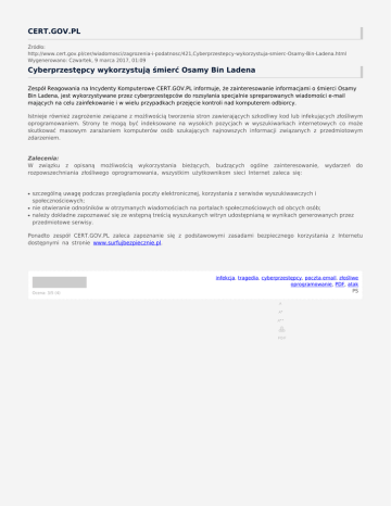 CERT.GOV.PL Źródło: http://www.cert.gov.pl/cer/wiadomosci/zagrozenia-i-podatnosc/421,Cyberprzestepcy-wykorzystuja-smierc-Osamy-Bin-Ladena.html Wygenerowano: Czwartek, 9 marca 2017, 01:09 Cyberprzestępcy wykorzystują śmierć Osamy Bin Ladena Zespół Reagowania na Incydenty Komputerowe CERT.GOV.PL informuje, że zainteresowanie informacjami o śmierci Osamy Bin Ladena, jest wykorzystywane przez cyberprzestępców do rozsyłania specjalnie spreparowanych wiadomości e-mail mających na celu zainfekowanie i w wielu przypadkach przejęcie kontroli nad komputerem odbiorcy. Istnieje również zagrożenie związane z możliwością tworzenia stron zawierających szkodliwy kod lub infekujących złośliwym oprogramowaniem. Strony te mogą być indeksowane na wysokich pozycjach w wyszukiwarkach internetowych co może skutkować masowym zarażaniem komputerów osób szukających najnowszych informacji związanych z przedmiotowym zdarzeniem. Zalecenia: W związku z opisaną możliwością wykorzystania bieżących, budzących ogólne zainteresowanie, wydarzeń do rozpowszechniania złośliwego oprogramowania, wszystkim użytkownikom sieci Internet zaleca się: ● ● ● szczególną uwagę podczas przeglądania poczty elektronicznej, korzystania z serwisów wyszukiwawczych i społecznościowych; nie otwieranie odnośników w otrzymanych wiadomościach na portalach społecznościowych od obcych osób; należy dokładne zapoznawać się ze wstępną treścią wyszukanych witryn udostępnianą w wynikach generowanych przez przedmiotowe serwisy. Ponadto zespół CERT.GOV.PL zaleca zapoznanie się z podstawowymi zasadami bezpiecznego korzystania z Internetu dostępnymi na stronie www.surfujbezpiecznie.pl. Ocena: 3/5 (4) infekcja, tragedia, cyberprzestępcy, poczta email, złośliwe oprogramowanie, PDF, atak PS