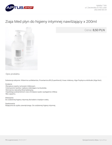 Apteka 7 dni ul. Zarzewska 51/53, Łódź (42) 640-00-24 Ziaja Med plyn do higieny intymnej nawilżający x 200ml Cena: 8,50 PLN Opis produktu Substancje aktywne: Witamina surfaktantów, Prowitamina B5 (D-panthenol), Kwas mlekowy, Alga Porphyra umbilicalis (Alga Nori). Działanie •Receptura oparta na kwasie mlekowym. •Intensywnie nawilża i wpływa osłaniająco na śluzówkę. •Wzmacnia naturalną florę bakteryjną. •Zapobiega podrażnieniom oraz zmniejsza ryzyko wystąpienia infekcji. •Bez zapachu. Wskazania Do codziennej higieny intymnej dla kobiet w każdym wieku. Dawkowanie: Wyłącznie do użytku zewnętrznego. Do codziennej higieny intymnej. Plik wygenerowano: 09-03-2017 Powered by TCPDF (www.tcpdf.org) Oprogramowanie sklepu: AptusShop