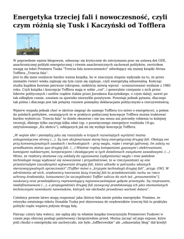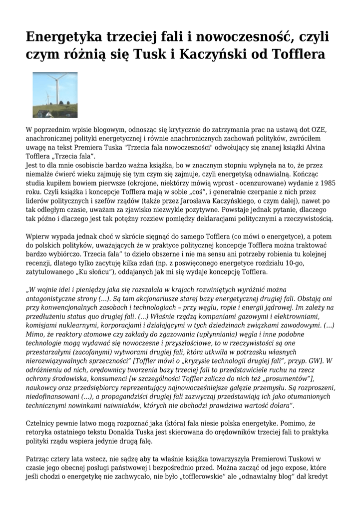 Energetyka trzeciej fali i nowoczesność, czyli czym różnią się Tusk i Kaczyński od Tofflera W poprzednim wpisie blogowym, odnosząc się krytycznie do zatrzymania prac na ustawą dot OZE, anachronicznej polityki energetycznej i równie anachronicznych zachowań polityków, zwróciłem uwagę na tekst Premiera Tuska "Trzecia fala nowoczesności" odwołujący się znanej książki Alvina Tofflera „Trzecia fala”. Jest to dla mnie osobiscie bardzo ważna książka, bo w znacznym stopniu wpłynęła na to, że przez niemalże ćwierć wieku zajmuję się tym czym się zajmuje, czyli energetyką odnawialną. Kończąc studia kupiłem bowiem pierwsze (okrojone, niektórzy mówią wprost - ocenzurowane) wydanie z 1985 roku. Czyli książka i koncepcje Tofflera mają w sobie „coś”, i generalnie czerpanie z nich przez liderów politycznych i szefów rządów (także przez Jarosława Kaczyńskiego, o czym dalej), nawet po tak odległym czasie, uważam za zjawisko niezwykle pozytywne. Powstaje jednak pytanie, dlaczego tak późno i dlaczego jest tak potężny rozziew pomiędzy deklaracjami politycznymi a rzeczywistością. Wpierw wypada jednak choć w skrócie sięgnąć do samego Tofflera (co mówi o energetyce), a potem do polskich polityków, uważających że w praktyce politycznej koncepcje Tofflera można traktować bardzo wybiórczo. Trzecia fala” to dzieło obszerne i nie ma sensu ani potrzeby robienia tu kolejnej recenzji, dlatego tylko zacytuję kilka zdań (np. z poswięconego energetyce rozdziału 10-go, zatytulowanego „Ku słońcu”), oddajanych jak mi się wydaje koncepcję Tofflera. „W wojnie idei i pieniędzy jaka się rozszalała w krajach rozwiniętych wyróżnić można antagonistyczne strony (…). Są tam akcjonariusze starej bazy energetycznej drugiej fali. Obstają oni przy konwencjonalnych zasobach i technologiach – przy węglu, ropie i energii jądrowej. Im zależy na przedłużeniu status quo drugiej fali. (...) Właśnie rządzą kompaniami gazowymi i elektrowniami, komisjami nuklearnymi, korporacjami i działającymi w tych dziedzinach związkami zawodowymi. (…) Mimo, że reaktory atomowe czy zakłady do zgazowania (upłynniania) węgla i inne podobne technologie mogą wydawać się nowoczesne i przyszłościowe, to w rzeczywistości są one przestarzałymi (zacofanymi) wytworami drugiej fali, która utkwiła w potrzasku własnych nierozwiązywalnych sprzeczności” [Toffler mówi o „kryzysie technologii drugiej fali”, przyp. GW]. W odróżnieniu od nich, orędownicy tworzenia bazy trzeciej fali to przedstawiciele ruchu na rzecz ochrony środowiska, konsumenci [w szczególności Toffler zalicza do nich też „prosumentów”], naukowcy oraz przedsiębiorcy reprezentujący najnowocześniejsze gałęzie przemysłu. Są rozproszeni, niedofinansowani (…), a propagandziści drugiej fali zazwyczaj przedstawiają ich jako otumanionych technicznymi nowinkami naiwniaków, których nie obchodzi prawdziwa wartość dolara”. Cztelnicy pewnie latwo mogą rozpoznać jaka (która) fala niesie polska energetyke. Pomimo, że retoryka ostatniego tekstu Donalda Tuska jest skierowana do orędowników trzeciej fali to praktyka polityki rządu wspiera jedynie drugą falę. Patrząc cztery lata wstecz, nie sądzę aby ta właśnie książka towarzyszyła Premierowi Tuskowi w czasie jego obecnej posługi państwowej i bezpośrednio przed. Można zacząć od jego expose, które jeśli chodzi o energetykę nie zachwycało, nie było „tofflerowskie” ale „odnawialny blog” dał kredyt zaufania rządowi. Potem nawet obiecująco wyglądały prace nad Raportem „Polska 2030” (bo robili to młodzi ludzie spoza korporacji, a Premier zdawal sie ten powiew mlodosci firmowac) była rzeczywiście szansa na nowy paradygmat także w energetyce (jeżeli nie na trzecią falę), ale jeśli chodzi o energetykę to skończyło się na utrwalaniu tej drugiej, por. wniosek Raportu: „Ustalenie horyzontu czasowego udziału OZE w strukturze wytwarzania – na poziomie 20%, a później ew. 30% (do 2030 r.) z uwzględnieniem założenia, że w wypadku Polski węgiel jest cennym dobrem, należy go oszczędzać, choć po okresie inkubacji technologii „czystego węgla” (do lat 2020–2025 r.) może warto go wykorzystywać mniej (do 2040–2050 r.), czyniąc z węgla rezerwę strategiczną na II połowę XXI wieku”. Komentując tę "antyutopie" na „odnawialnym", zauważyłem że rząd Tuska w coraz bardziej anachronicznych poglądach na przyszłość energetyki zbliża się do poglądów w tym zakresie swojego poprzednika i dyżurnego adwersarza. Teraz sądzę że premierzy Tusk i Kaczyński, jeśli chodzi o energetykę i nowoczesnosć w energetyce w zasadzie nie różnią się niczym. Niezależnie od starań i retoryki są typowymi apologetami i epigonami zarazem drugiej fali. Paradoksem jest to że nawet z Tofflera i hasła „nowoczesności” czerpią i korzystają w tym samym czasie (czyli poniewczasie) i w poddobny sposob. Bo także Jaroslaw Kaczyński robiąc wlasnie wykładnię swoich poglądów gospodarczych w swoim wpisie blogowym „Nowoczesny patriotyzm gospodarczy” „faluje nowoczesnością” powołując się przy tym wprost na Tofflera. Obu premierów łączy też to, że pewnie nie znając książki Tofflera, czerpią z jego frazeologii jedynie w celach li tylko marketingowych, a w realizowanej dotychczas polityce energetycznej robią wszystko na odwrót niż wskazuje ich rzekomy autorytet. Zdaje się, że jeżli już czytali to zakończyli lekturę na opisie drugiej fali (ok. 20% całości książki Tofflera „Trzecia fala”. Karą dla obu Panów :), zemstą Tofflera za nieuważne czytanie:) w refrenie piosenki "falowanie i spadanie" i jednocześnie paradoksem całej tej ich przelotnej przygody z amerykanskim badaczem spoleczenstwa i trednow gospodarczych może być to, że w końcu, szybciej niż myślą, trzecia fala przejdzie także przez Polsk