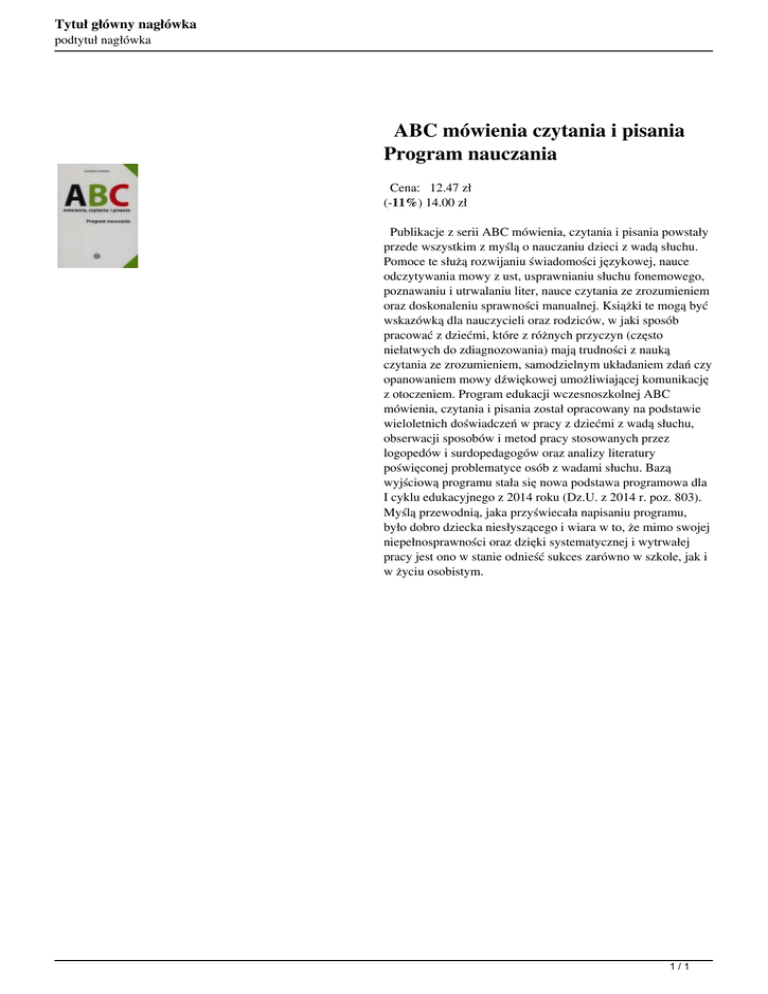 Tytuł główny nagłówka podtytuł nagłówka ABC mówienia czytania i pisania Program nauczania Cena: 12.47 zł (-11%) 14.00 zł Publikacje z serii ABC mówienia, czytania i pisania powstały przede wszystkim z myślą o nauczaniu dzieci z wadą słuchu. Pomoce te służą rozwijaniu świadomości językowej, nauce odczytywania mowy z ust, usprawnianiu słuchu fonemowego, poznawaniu i utrwalaniu liter, nauce czytania ze zrozumieniem oraz doskonaleniu sprawności manualnej. Książki te mogą być wskazówką dla nauczycieli oraz rodziców, w jaki sposób pracować z dziećmi, które z różnych przyczyn (często niełatwych do zdiagnozowania) mają trudności z nauką czytania ze zrozumieniem, samodzielnym układaniem zdań czy opanowaniem mowy dźwiękowej umożliwiającej komunikację z otoczeniem. Program edukacji wczesnoszkolnej ABC mówienia, czytania i pisania został opracowany na podstawie wieloletnich doświadczeń w pracy z dziećmi z wadą słuchu, obserwacji sposobów i metod pracy stosowanych przez logopedów i surdopedagogów oraz analizy literatury poświęconej problematyce osób z wadami słuchu. Bazą wyjściową programu stała się nowa podstawa programowa dla I cyklu edukacyjnego z 2014 roku (Dz.U. z 2014 r. poz. 803). Myślą przewodnią, jaka przyświecała napisaniu programu, było dobro dziecka niesłyszącego i wiara w to, że mimo swojej niepełnosprawności oraz dzięki systematycznej i wytrwałej pracy jest ono w stanie odnieść sukces zarówno w szkole, jak i w życiu osobistym. 1/1 Powered by TCPDF (www.tcpdf.org)