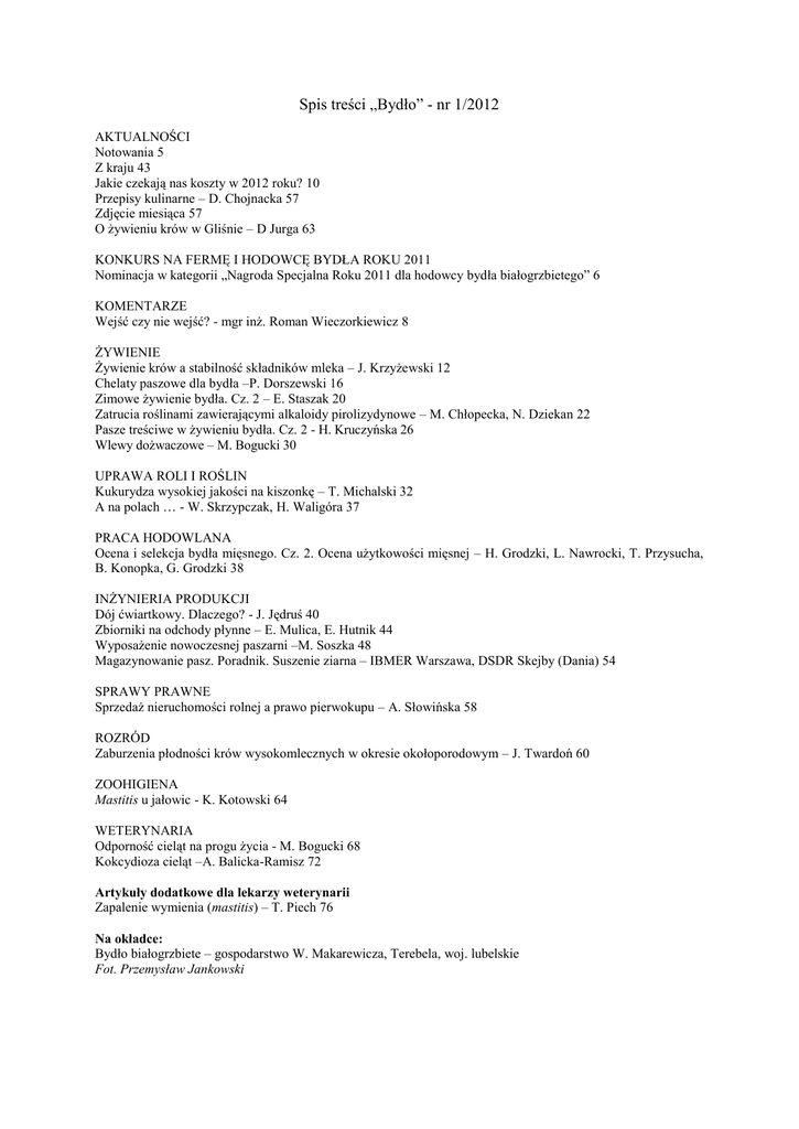 Spis treści „Bydło” - nr 1/2012 AKTUALNOŚCI Notowania 5 Z kraju 43 Jakie czekają nas koszty w 2012 roku? 10 Przepisy kulinarne – D. Chojnacka 57 Zdjęcie miesiąca 57 O żywieniu krów w Gliśnie – D Jurga 63 KONKURS NA FERMĘ I HODOWCĘ BYDŁA ROKU 2011 Nominacja w kategorii „Nagroda Specjalna Roku 2011 dla hodowcy bydła białogrzbietego” 6 KOMENTARZE Wejść czy nie wejść? - mgr inż. Roman Wieczorkiewicz 8 ŻYWIENIE Żywienie krów a stabilność składników mleka – J. Krzyżewski 12 Chelaty paszowe dla bydła –P. Dorszewski 16 Zimowe żywienie bydła. Cz. 2 – E. Staszak 20 Zatrucia roślinami zawierającymi alkaloidy pirolizydynowe – M. Chłopecka, N. Dziekan 22 Pasze treściwe w żywieniu bydła. Cz. 2 - H. Kruczyńska 26 Wlewy dożwaczowe – M. Bogucki 30 UPRAWA ROLI I ROŚLIN Kukurydza wysokiej jakości na kiszonkę – T. Michalski 32 A na polach … - W. Skrzypczak, H. Waligóra 37 PRACA HODOWLANA Ocena i selekcja bydła mięsnego. Cz. 2. Ocena użytkowości mięsnej – H. Grodzki, L. Nawrocki, T. Przysucha, B. Konopka, G. Grodzki 38 INŻYNIERIA PRODUKCJI Dój ćwiartkowy. Dlaczego? - J. Jędruś 40 Zbiorniki na odchody płynne – E. Mulica, E. Hutnik 44 Wyposażenie nowoczesnej paszarni –M. Soszka 48 Magazynowanie pasz. Poradnik. Suszenie ziarna – IBMER Warszawa, DSDR Skejby (Dania) 54 SPRAWY PRAWNE Sprzedaż nieruchomości rolnej a prawo pierwokupu – A. Słowińska 58 ROZRÓD Zaburzenia płodności krów wysokomlecznych w okresie okołoporodowym – J. Twardoń 60 ZOOHIGIENA Mastitis u jałowic - K. Kotowski 64 WETERYNARIA Odporność cieląt na progu życia - M. Bogucki 68 Kokcydioza cieląt –A. Balicka-Ramisz 72 Artykuły dodatkowe dla lekarzy weterynarii Zapalenie wymienia (mastitis) – T. Piech 76 Na okładce: Bydło białogrzbiete – gospodarstwo W. Makarewicza, Terebela, woj. lubelskie Fot. Przemysław Jankowski
