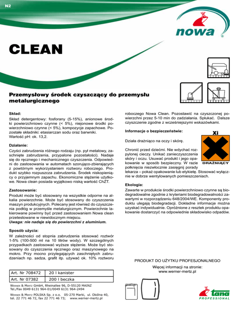 N2 CLEAN Przemysłowy środek czyszczący do przemysłu metalurgicznego Skład: Skład detergentowy: fosforany (5-15%), anionowe środki powierzchniowo czynne (< 5%), niejonowe środki powierzchniowo czynne (< 5%), kompozycje zapachowe. Pozostałe składniki: etasiarczan sodu oraz barwniki. Wartość pH: ok. 13,2. Działanie: Czyści zabrudzenia różnego rodzaju (np. pył metalowy, zaschnięte zabrudzenia, przypalone pozostałości). Nadaje się do ręcznego i mechanicznego czyszczenia. Odpowiedni do zastosowania w automatach szorująco-zbierających z powtórnym wykorzystaniem roztworu roboczego. Produkt szybko rozpuszcza zabrudzenia. Środek niskopieniący o przyjemnym zapachu. Ekonomiczne stężenie użytkowe. Nowa clean posiada wyjątkowo niską wartość ChZT. Zastosowanie: Produkt może być stosowany na wszystkie odporne na alkalia powierzchnie. Może być stosowany do czyszczenia maszyn produkcyjnych. Polecany jest również do czyszczenia podłóg w przemyśle metalurgicznym. Powierzchnie lakierowane powinny być przed zastosowaniem Nowa clean przetestowane w niewidocznym miejscu. Uwaga: nie nadaje się do powierzchni z aluminium. Sposób użycia: W zależności od stopnia zabrudzenia stosować roztwór 1-5% (100-500 ml na 10 litrów wody). W szczególnych przypadkach zastosować wyższe stężenie. Może być stosowany do czyszczenia ręcznego oraz maszynowego na mokro. Przy mocno przylegających zaschniętych zabrudzeniach np. sadza, grafit itp. używać ok. 10% roztworu Art. Nr 708472 20 l kanister Art. Nr 07382 200 l beczka Werner & Mertz GmbH, Rheinallee 96, D-55120 MAINZ Tel./Fax 0049 6131 964-01/0049 6131 964-2494 Werner & Mertz POLSKA Sp. z o.o. 05-270 Marki, ul. Okólna 40, tel. 22 771 46 72, fax 22 771 46 73; www.werner-mertz.pl roboczego Nowa Clean. Pozostawić na czyszczonej powierzchni przez 5-10 min do zadziałania. Spłukać. Dalsze czyszczenie zgodne z wcześniejszymi wskazówkami. Informacje o bezpieczeństwie: Działa drażniąco na oczy i skórę. Chronić przed dziećmi. Nie wdychać rozpylonej cieczy. Unikać zanieczyszczenia skóry i oczu. Usuwać produkt i jego opakowanie w sposób bezpieczny. W razie połknięcia niezwłocznie zasięgnij porady lekarza – pokaż opakowanie lub etykietę. Stosować wyłącznie w dobrze wentylowanych pomieszczeniach. Ekologia: Zawarte w produkcie środki powierzchniowo czynne są biodegradowalne zgodnie z kryteriami biodegradowalności zawartymi w rozporządzeniu 648/2004/WE. Komponenty produktu ulegają biodegradacji. Dokładne informacje można uzyskać indywidualnie. Opróżnione z resztek produktu opakowanie dostarczyć na odpowiednie składowisko odpadów. Produkt do użytku profesjonalnego Więcej informacji na stronie: www.werner-mertz.pl