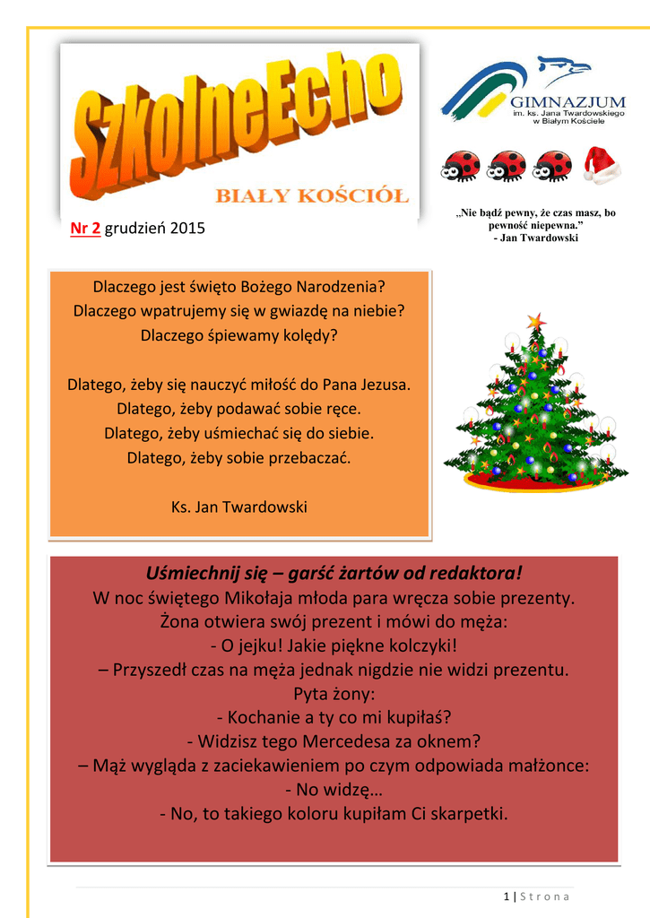 Nr 2 grudzień 2015 „Nie bądź pewny, że czas masz, bo pewność niepewna.” - Jan Twardowski Dlaczego jest święto Bożego Narodzenia? Dlaczego wpatrujemy się w gwiazdę na niebie? Dlaczego śpiewamy kolędy? Dlatego, żeby się nauczyć miłość do Pana Jezusa. Dlatego, żeby podawać sobie ręce. Dlatego, żeby uśmiechać się do siebie. Dlatego, żeby sobie przebaczać. Ks. Jan Twardowski Uśmiechnij się – garść żartów od redaktora! W noc świętego Mikołaja młoda para wręcza sobie prezenty. Żona otwiera swój prezent i mówi do męża: - O jejku! Jakie piękne kolczyki! – Przyszedł czas na męża jednak nigdzie nie widzi prezentu. Pyta żony: - Kochanie a ty co mi kupiłaś? - Widzisz tego Mercedesa za oknem? – Mąż wygląda z zaciekawieniem po czym odpowiada małżonce: - No widzę… - No, to takiego koloru kupiłam Ci skarpetki. 1|S tr o n a „Selfie w barwach jesieni” Dnia 17 grudnia 2015 r. na sali gimnastycznej w Gimnazjum im. Ks. Jana Twardowskiego w Białym Kościele odbyła się wręczenie nagród drugiej edycji Gminnego Konkursu Fotograficznego: „Selfie w barwach jesieni”, zorganizowanego przez Gimnazjum im. Ks. Jana Twardowskiego w Białym Kościele we współpracy ze Szkołą Podstawową im. Św. Jadwigi Królowej w Białym Kościele oraz Gminnym Ośrodkiem Kultury i Sportu. Celem konkursu było rozbudzanie pasji artystycznej wśród uczniów szkół podstawowych i gimnazjalnych na terenie Gminy Wielka Wieś. W konkursie wzięło udział 49 uczestników ze wszystkich szkół w Gminie Wielka Wieś. Młodzi fotografowie uchwycili na swoich zdjęciach najpiękniejsze kolory jesieni. Niektórzy wykorzystali leśne pejzaże i jesienne łąki, inni szukali barw jesieni we własnym ogrodzie. Gala finałowa pojawili się wszyscy uczestnicy oraz zaproszeni goście: pan Tadeusz Wójtowicz - wójt gminy Wielka Wieś, pani Krystyna Hrabia – dyrektor Gminnego Ośrodka Ekonomiczno - Administracyjnego, pani Magdalena Szymańska - dyrektor Gminnego Ośrodka Kultury i Sportu oraz radny Białego Kościoła - pan Józef Wojdała. Laureaci, finaliści oraz uczestnicy konkursu „Selfie w barwach jesieni” odebrali nagrody z rąk Wójta Gminy Wielka Wieś - pana Tadeusza Wójtowicza, dyrektora Gimnazjum Ks. Jana Twardowskiego w Białym Kościele - pani Bożeny Turek oraz dyrektora Szkoły Podstawowej im. Św. Jadwigi Królowej w Białym Kościele – pani Anny Zajączkowskiej. Na gali rozdania nagród można było podziwiać wystawę prac wszystkich uczestników konkursu. Zwiedzający z uwagą oglądali każde zdjęcie, rozpoznając na nich siebie, swoich kolegów i przyjaciół. 2|S tr o n a ŻYWNOŚĆ STRAJKUJE! – PODSUMOWANIE PROJEKTU Co roku wyrzucamy 1,3 mld ton jedzenia. Stanowi to 1/3 ilości produkowanej żywności nadającej się do spożycia. W Europie marnuje się 100 mln ton żywności. W typowym domu Europejczyka wyrzuca się do kosza 20-30% kupionego jedzenia, 2/3 nadawałoby się jeszcze do spożycia. Badania ankietowe prowadzone na temat marnowania żywności jednoznacznie mówią, iż dzieci w Polsce nieszanują jedzenia. To paradoks – milion dzieci żyje w skrajnym ubóstwie w Polsce i nie ma szans na regularne, odżywcze posiłki, skąd zatem brak szacunku do żywności? Efektem braku szacunku jest właśnie marnowanie jedzenia i zanik wrażliwości na osoby żyjące w biedzie. Dlatego projekt „Żywność strajkuje”, realizowany przez Stowarzyszenie Przyjaciół Dzieci i Młodzieży POZYTYWKA wraz ze Szkołą Podstawową oraz Gimnazjum w Białym Kościele, został skierowany do młodych odbiorców, by budować ich świadomość problemu. W ramach projektu zostało podjętych szereg działań, między innymi: uczniowie uczestniczyli w warsztatach, na których oprócz wiedzy dotyczącej zapobiegania marnowaniu żywności, przygotowali także plakaty promujące projekt; odbyły się warsztaty wyjazdowe na wysypisko śmieci, by uzmysłowić skalę problemu – zobrazować ilość wyrzucanego jedzenia; młodzież wspólnie komponowała posiłek tak, aby nie marnować produktów żywnościowych; razem z Bankiem Żywności w Krakowie, uczestnicy projektu zorganizowali akcję na terenie krakowskiego hipermarketu, w czasie której przekazywali zdobytą wiedzę na temat marnowania żywności i sposobów zapobiegania temu zjawisku; uczestnicy projektu przeprowadzili zbiórkę żywności na terenie swoich miejscowości przeprowadzono konkurs na logo projektu, a zwycięska praca została wydrukowana na ekologicznych torbach zakupowych. Te i szereg innych działań podsumowano w czasie piątkowego spotkania, które odbyło się w Gimnazjum w Białym Kościele. Młodzież ze Szkoły Podstawowej oraz Gimnazjum, która brała udział w projekcie, a także zaproszeni goście, mieli możliwość obejrzenia prezentacji dotyczącej zapobiegania marnowaniu żywności. Wręczono nagrodę dla zwycięzcy konkursu na logo projektu został nim Arkadiusz Janik, uczeń Szkoły Podstawowej w Białym Kościele. Wszystkim uczestnikom i zaproszonym na podsumowanie gościom, wręczono torby z logo projektu. 3|S tr o n a Wszystkim uczestnikom i zaproszonym na podsumowanie gościom, wręczono torby z logo projek DO SIEGO ROKU 2016!!! Zespół redakcyjny: Anna Kura – redaktor naczelny | Mariola Pogan | Wiktoria Krawiec | Anna Wieszczecińska | Paulina Seweryn Opracowanie graficzne: Filip Nowakowski | Mariola Pogan | Opiekun: Magdalena Zięcina Współpraca: Grażyna Pogan | Elżbieta Glanowska Witamy w redakcji Filipa Gałczyka i życzymy sukcesów. 4|S tr o n a