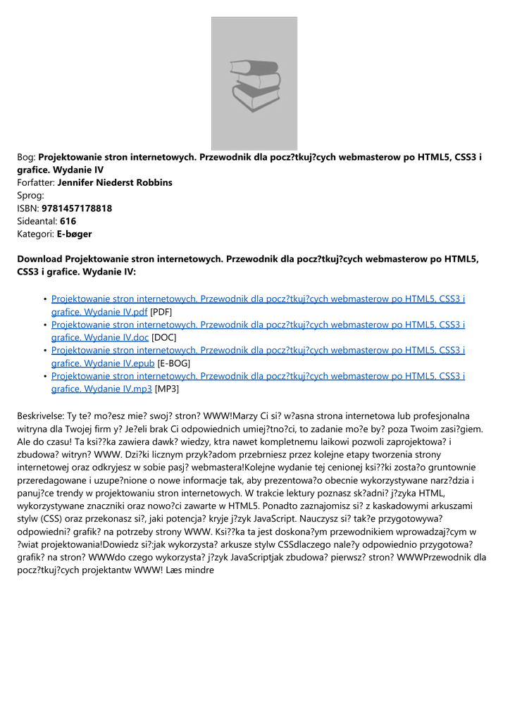 Bog: Projektowanie stron internetowych. Przewodnik dla pocz?tkuj?cych webmasterow po HTML5, CSS3 i grafice. Wydanie IV Forfatter: Jennifer Niederst Robbins Sprog: ISBN: 9781457178818 Sideantal: 616 Kategori: E-bøger Download Projektowanie stron internetowych. Przewodnik dla pocz?tkuj?cych webmasterow po HTML5, CSS3 i grafice. Wydanie IV: • Projektowanie stron internetowych. Przewodnik dla pocz?tkuj?cych webmasterow po HTML5, CSS3 i grafice. Wydanie IV.pdf [PDF] • Projektowanie stron internetowych. Przewodnik dla pocz?tkuj?cych webmasterow po HTML5, CSS3 i grafice. Wydanie IV.doc [DOC] • Projektowanie stron internetowych. Przewodnik dla pocz?tkuj?cych webmasterow po HTML5, CSS3 i grafice. Wydanie IV.epub [E-BOG] • Projektowanie stron internetowych. Przewodnik dla pocz?tkuj?cych webmasterow po HTML5, CSS3 i grafice. Wydanie IV.mp3 [MP3] Beskrivelse: Ty te? mo?esz mie? swoj? stron? WWW!Marzy Ci si? w?asna strona internetowa lub profesjonalna witryna dla Twojej firm y? Je?eli brak Ci odpowiednich umiej?tno?ci, to zadanie mo?e by? poza Twoim zasi?giem. Ale do czasu! Ta ksi??ka zawiera dawk? wiedzy, ktra nawet kompletnemu laikowi pozwoli zaprojektowa? i zbudowa? witryn? WWW. Dzi?ki licznym przyk?adom przebrniesz przez kolejne etapy tworzenia strony internetowej oraz odkryjesz w sobie pasj? webmastera!Kolejne wydanie tej cenionej ksi??ki zosta?o gruntownie przeredagowane i uzupe?nione o nowe informacje tak, aby prezentowa?o obecnie wykorzystywane narz?dzia i panuj?ce trendy w projektowaniu stron internetowych. W trakcie lektury poznasz sk?adni? j?zyka HTML, wykorzystywane znaczniki oraz nowo?ci zawarte w HTML5. Ponadto zaznajomisz si? z kaskadowymi arkuszami stylw (CSS) oraz przekonasz si?, jaki potencja? kryje j?zyk JavaScript. Nauczysz si? tak?e przygotowywa? odpowiedni? grafik? na potrzeby strony WWW. Ksi??ka ta jest doskona?ym przewodnikiem wprowadzaj?cym w ?wiat projektowania!Dowiedz si?:jak wykorzysta? arkusze stylw CSSdlaczego nale?y odpowiednio przygotowa? grafik? na stron? WWWdo czego wykorzysta? j?zyk JavaScriptjak zbudowa? pierwsz? stron? WWWPrzewodnik dla pocz?tkuj?cych projektantw WWW! Læs mindre