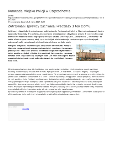 Komenda Miejska Policji w Częstochowie Źródło: http://czestochowa.slaska.policja.gov.pl/ka7/informacje/wiadomosci/18464,Zatrzymani-sprawcy-zuchwalej-kradziezy-3-ton-zl omu.html Wygenerowano: Czwartek, 9 marca 2017, 01:09 Zatrzymani sprawcy zuchwałej kradzieży 3 ton złomu Policjanci z Wydziału Kryminalnego z policjantami z Posterunku Policji w Olsztynie zatrzymali dwóch sprawców kradzieży 3 ton złomu. Zatrzymanie przestępców i odzyskanie prawie 3 ton skradzionego złomu było możliwe dzięki współpracy Policji z Służbą Ochrony Kolei. Zatrzymania „ złomiarzy ” to także efekt zorganizowanej akcji tych służb i jak wiele wskazuje to dopiero początek kolejnych zatrzymań osób zajmujących się kradzieżami złomu na dużą skalę. Policjanci z Wydziału Kryminalnego z policjantami z Posterunku Policji w Olsztynie zatrzymali dwóch sprawców kradzieży 3 ton złomu. Zatrzymanie przestępców i odzyskanie prawie 3 ton skradzionego złomu było możliwe dzięki współpracy Policji z Służbą Ochrony Kolei. Zatrzymania „ złomiarzy ” to także efekt zorganizowanej akcji tych służb i jak wiele wskazuje to dopiero początek kolejnych zatrzymań osób zajmujących się kradzieżami złomu na dużą skalę. 29-letni częstochowianin, jego 19 - letni kolega oraz współpracujący z nimi inny młody człowiek w sposób wyjątkowo zuchwały okradali wagony wiozące złom do Huty. Mężczyźni kradli „ w biały dzień „ skacząc na wagony, i na jadącym pociągu przygotowując odpowiednio cenne kawałki złomu. Tak przygotowany złom zrzucali w wybrane wcześniej miejsce. Po jakimś czasie podjeżdżali samochodem m-ki Lublin i zabierali wyrzucony z pociągu złom. Dalsza dystrybucja złomu stanowiła dla nich sposób na życie. Policjanci, współpracując z Służbą Ochrony Kolei podjęli działania aby zatrzymać sprawców tego rodzaju przestępstw. Dzięki współpracy udało się nie tylko zatrzymać złodziei ale i odzyskać porzucony przez przestępców samochód z skradzionym złomem w ilości około 3 ton. Najprawdopodobniej również był to kolejny transport skradzionego mienia. Mężczyźni odpowiedzą za dokonaną kradzież. Policjanci pracujący nad ta sprawą ustalają kolejne osoby związane z tego rodzaju kradzieżami na większa skalę. Ich zatrzymanie jest wiec kwestią czasu. Sprawdzamy również w ilu kolejnych przypadkach złodzieje dopuścili się podobnych kradzieży. . Zatrzymanie przestępców to efekt współpracy służby policyjnej i ochrony kolei, a także efekt policyjnej pracy operacyjnej. Ocena: 0/5 (0) Tweetnij