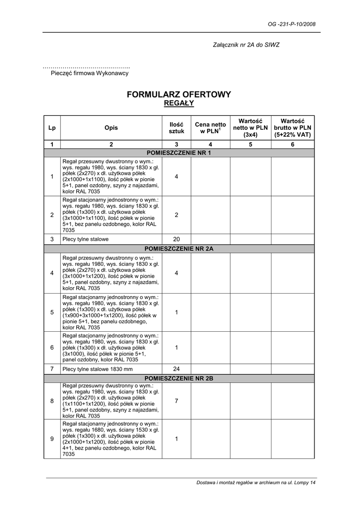 OG -231-P-10/2008 Załącznik nr 2A do SIWZ …………………………………….. Pieczęć firmowa Wykonawcy FORMULARZ OFERTOWY REGAŁY Ilość sztuk Lp Opis 1 2 1 Regał przesuwny dwustronny o wym.: wys. regału 1980, wys. ściany 1830 x gł. półek (2x270) x dł. uŜytkowa półek (2x1000+1x1100), ilość półek w pionie 5+1, panel ozdobny, szyny z najazdami, kolor RAL 7035 4 2 Regał stacjonarny jednostronny o wym.: wys. regału 1980, wys. ściany 1830 x gł. półek (1x300) x dł. uŜytkowa półek (3x1000+1x1100), ilość półek w pionie 5+1, bez panelu ozdobnego, kolor RAL 7035 2 3 Plecy tylne stalowe 4 Regał przesuwny dwustronny o wym.: wys. regału 1980, wys. ściany 1830 x gł. półek (2x270) x dł. uŜytkowa półek (3x1000+1x1200), ilość półek w pionie 5+1, panel ozdobny, szyny z najazdami, kolor RAL 7035 Cena netto 1 w PLN 3 4 POMIESZCZENIE NR 1 Wartość netto w PLN (3x4) Wartość brutto w PLN (5+22% VAT) 5 6 20 POMIESZCZENIE NR 2A 5 6 7 Regał stacjonarny jednostronny o wym.: wys. regału 1980, wys. ściany 1830 x gł. półek (1x300) x dł. uŜytkowa półek (1x900+3x1000+1x1200), ilość półek w pionie 5+1, bez panelu ozdobnego, kolor RAL 7035 Regał stacjonarny jednostronny o wym.: wys. regału 1980, wys. ściany 1830 x gł. półek (1x300) x dł. uŜytkowa półek (3x1000), ilość półek w pionie 5+1, panel ozdobny, kolor RAL 7035 4 1 1 24 Plecy tylne stalowe 1830 mm POMIESZCZENIE NR 2B 8 9 Regał przesuwny dwustronny o wym.: wys. regału 1980, wys. ściany 1830 x gł. półek (2x270) x dł. uŜytkowa półek (1x1100+1x1200), ilość półek w pionie 5+1, panel ozdobny, szyny z najazdami, kolor RAL 7035 Regał stacjonarny jednostronny o wym.: wys. regału 1680, wys. ściany 1530 x gł. półek (1x300) x dł. uŜytkowa półek (2x1000+1x1200), ilość półek w pionie 4+1, bez panelu ozdobnego, kolor RAL 7035 7 1 Dostawa i montaŜ regałów w archiwum na ul. Lompy 14 OG -231-P-10/2008 10 Plecy tylne stalowe 1830 mm 14 11 Plecy tylne stalowe 1530 mm 3 12 Regał przesuwny dwustronny o wym.: wys. regału 1980, wys. ściany 1830 x gł. półek (2x270) x dł. uŜytkowa półek (1x900+4x1000), ilość półek w pionie 5+1, częściowo obniŜony do 4+1, panel ozdobny, szyny z najazdami, kolor RAL 7035 7 13 Regał stacjonarny jednostronny o wym.: wys. regału 1980, wys. ściany 1830 x gł. półek (1x300) x dł. uŜytkowa półek (1x900+5x1000), ilość półek w pionie 5+1, , częściowo obniŜony do 4+1, bez panelu ozdobnego, kolor RAL 7035 1 POMIESZCZENIE NR 3 14 15 16 Regał stacjonarny jednostronny o wym.: wys. regału 1680, wys. ściany 1530 x gł. półek (1x300) x dł. uŜytkowa półek (2x900+8x1000), ilość półek w pionie 5+1, panel ozdobny, kolor RAL 7035 Regał stacjonarny jednostronny o wym.: wys. regału 1680, wys. ściany 1530 x gł. półek (1x300) x dł. uŜytkowa półek (1x1200), ilość półek w pionie 4+1, bez panelu ozdobnego, , kolor RAL 7035 Regał stacjonarny jednostronny o wym.: wys. regału 1980, wys. ściany 1830 x gł. półek (1x300) x dł. uŜytkowa półek (2x1000), ilość półek w pionie 5+1, bez panelu ozdobnego, , kolor RAL 7035 1 1 2 17 Regał stacjonarny jednostronny o wym.: wys. regału 1980, wys. ściany 1830 x gł. półek (1x300) x dł. uŜytkowa półek (1x1200), ilość półek w pionie 5+1, bez panelu ozdobnego, kolor RAL 7035 18 Plecy tylne stalowe 1830 mm 45 19 Plecy tylne stalowe 1530 mm 12 RAZEM ……………………….., dnia ……….….. 2008 r. Miejscowość 1 X X ………………………………………………………………….. Podpis osoby (osób) upowaŜnionej do występowania w imieniu Wykonawcy PoŜądany czytelny podpis albo podpis i pieczątka z imieniem i nazwiskiem Dostawa i montaŜ regałów w archiwum na ul. Lompy 14