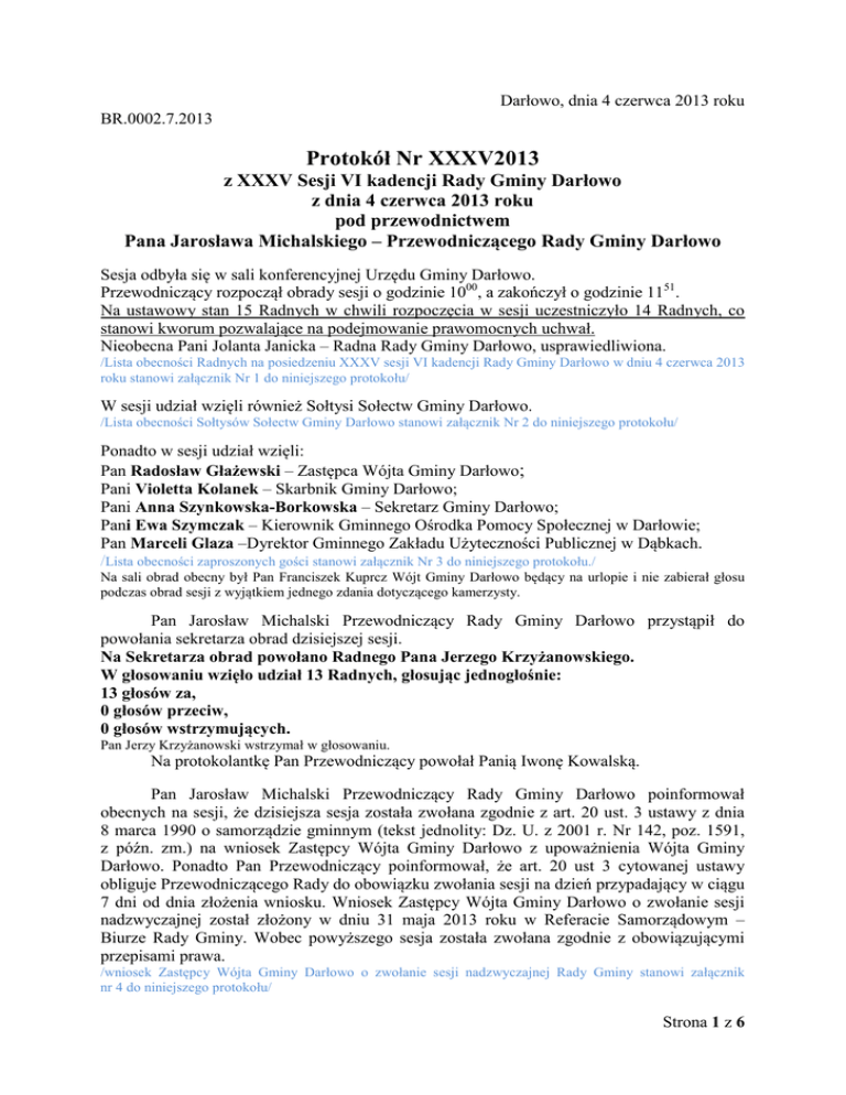 Darłowo, dnia 4 czerwca 2013 roku BR.0002.7.2013 Protokół Nr XXXV2013 z XXXV Sesji VI kadencji Rady Gminy Darłowo z dnia 4 czerwca 2013 roku pod przewodnictwem Pana Jarosława Michalskiego – Przewodniczącego Rady Gminy Darłowo Sesja odbyła się w sali konferencyjnej Urzędu Gminy Darłowo. Przewodniczący rozpoczął obrady sesji o godzinie 1000, a zakończył o godzinie 1151. Na ustawowy stan 15 Radnych w chwili rozpoczęcia w sesji uczestniczyło 14 Radnych, co stanowi kworum pozwalające na podejmowanie prawomocnych uchwał. Nieobecna Pani Jolanta Janicka – Radna Rady Gminy Darłowo, usprawiedliwiona. /Lista obecności Radnych na posiedzeniu XXXV sesji VI kadencji Rady Gminy Darłowo w dniu 4 czerwca 2013 roku stanowi załącznik Nr 1 do niniejszego protokołu/ W sesji udział wzięli również Sołtysi Sołectw Gminy Darłowo. /Lista obecności Sołtysów Sołectw Gminy Darłowo stanowi załącznik Nr 2 do niniejszego protokołu/ Ponadto w sesji udział wzięli: Pan Radosław Głażewski – Zastępca Wójta Gminy Darłowo; Pani Violetta Kolanek – Skarbnik Gminy Darłowo; Pani Anna Szynkowska-Borkowska – Sekretarz Gminy Darłowo; Pani Ewa Szymczak – Kierownik Gminnego Ośrodka Pomocy Społecznej w Darłowie; Pan Marceli Glaza –Dyrektor Gminnego Zakładu Użyteczności Publicznej w Dąbkach. /Lista obecności zaproszonych gości stanowi załącznik Nr 3 do niniejszego protokołu./ . Na sali obrad obecny był Pan Franciszek Kuprcz Wójt Gminy Darłowo będący na urlopie i nie zabierał głosu podczas obrad sesji z wyjątkiem jednego zdania dotyczącego kamerzysty. Pan Jarosław Michalski Przewodniczący Rady Gminy Darłowo przystąpił do powołania sekretarza obrad dzisiejszej sesji. Na Sekretarza obrad powołano Radnego Pana Jerzego Krzyżanowskiego. W głosowaniu wzięło udział 13 Radnych, głosując jednogłośnie: 13 głosów za, 0 głosów przeciw, 0 głosów wstrzymujących. Pan Jerzy Krzyżanowski wstrzymał w głosowaniu. Na protokolantkę Pan Przewodniczący powołał Panią Iwonę Kowalską. Pan Jarosław Michalski Przewodniczący Rady Gminy Darłowo poinformował obecnych na sesji, że dzisiejsza sesja została zwołana zgodnie z art. 20 ust. 3 ustawy z dnia 8 marca 1990 o samorządzie gminnym (tekst jednolity: Dz. U. z 2001 r. Nr 142, poz. 1591, z późn. zm.) na wniosek Zastępcy Wójta Gminy Darłowo z upoważnienia Wójta Gminy Darłowo. Ponadto Pan Przewodniczący poinformował, że art. 20 ust 3 cytowanej ustawy obliguje Przewodniczącego Rady do obowiązku zwołania sesji na dzień przypadający w ciągu 7 dni od dnia złożenia wniosku. Wniosek Zastępcy Wójta Gminy Darłowo o zwołanie sesji nadzwyczajnej został złożony w dniu 31 maja 2013 roku w Referacie Samorządowym – Biurze Rady Gminy. Wobec powyższego sesja została zwołana zgodnie z obowiązującymi przepisami prawa. /wniosek Zastępcy Wójta Gminy Darłowo o zwołanie sesji nadzwyczajnej Rady Gminy stanowi załącznik nr 4 do niniejszego protokołu/ Strona 1 z 6 Ad. 1.2. Pan Jarosław Michalski Przewodniczący Rady Gminy Darłowo przystąpił do ustalenia porządku obrad, przy czym przypomniał, że proponowany porządek obrad wszyscy Radni otrzymali wraz z zawiadomieniem na dzisiejszą sesję. Pan Jarosław Michalski Przewodniczący Rady Gminy Darłowo przypomniał obecnym że jest to sesja zwołana w trybie nadzwyczajnym, na wniosek, wobec czego dodatkowym warunkiem dokonania zmiany w porządku obrad jest przede wszystkim zgoda wnioskodawcy na tę zmianę. Nikt wniosku o zmianę porządku obrad nie zgłosił. Pan Jarosław Michalski Przewodniczący Rady Gminy Darłowo przedstawił porządek obrad: 1. Otwarcie obrad sesji. 1.1. Stwierdzenie kworum. 1.2. Ustalenie porządku obrad. 2. Rozpatrzenie projektów uchwał: 2.1. Rozpatrzenie uchwały w sprawie uchylenia uchwały nr XXXIII/289/2013 Rady Gminy Darłowo z dnia 6 maja 2013 roku w sprawie zamiany nieruchomości gruntowej stanowiącej własność Gminy Darłowo na nieruchomość gruntową stanowiącą własność osoby fizycznej. Druk Nr 1/2013XXXV 2.2. Rozpatrzenie uchwały w sprawie zamiany nieruchomości gruntowej stanowiącej własność Gminy Darłowo na nieruchomość gruntową stanowiącą własność osoby fizycznej. (dot. zamiany działki nr 348, działki nr 349, działki nr 350/1 w obrębie Słowino-Słowinko na działkę zabudowaną nr 400 w obrębie Słowino-Słowinko) Druk Nr 2/2013XXXV 2.3. Rozpatrzenie uchwały w sprawie wniesienia skargi na rozstrzygnięcie nadzorcze Wojewody Zachodniopomorskiego. Druk Nr 3/2013XXXV 2.4. Rozpatrzenie uchwały w sprawie wniesienia skargi na rozstrzygnięcie nadzorcze Wojewody Zachodniopomorskiego. Druk Nr 4/2013XXXV 3. Wolne wnioski. 4. Zamknięcie obrad. Wobec powyższego Pan Jarosław Michalski Przewodniczący Rady Gminy Darłowo poddał pod głosowanie porządek obrad. W głosowaniu udział wzięło 14 Radnych Rady Gminy Darłowo głosując jednogłośnie: 14 głosów za przyjęciem porządku obrad sesji, 0 głosów przeciw, 0 głosów wstrzymujących”. Pan Jarosław Michalski Przewodniczący Rady Gminy Darłowo oznajmił, że porządek obrad został przyjęty jednogłośnie. /Proponowany porządek obrad Radni otrzymali wraz z zawiadomieniami na XXXV Sesję Rady Gminy Darłowo. Porządek obrad wraz z zawiadomieniem stanowi załącznik Nr 5 do niniejszego protokołu/ Ad. 2.1. Rozpatrzenie uchwały w sprawie uchylenia uchwały nr XXXIII/289/2013 Rady Gminy Darłowo z dnia 6 maja 2013 roku w sprawie zamiany nieruchomości gruntowej stanowiącej własność Gminy Darłowo na nieruchomość gruntową stanowiącą własność osoby fizycznej. Druk Nr 1/2013XXXV /Projekt uchwały wraz z uzasadnieniem w sprawie uchylenia uchwały nr XXXIII/289/2013 Rady Gminy Darłowo z dnia 6 maja 2013 roku w sprawie zamiany nieruchomości gruntowej stanowiącej własność Gminy Darłowo na nieruchomość gruntową stanowiącą własność osoby fizycznej stanowi załącznik nr 6 do niniejszego