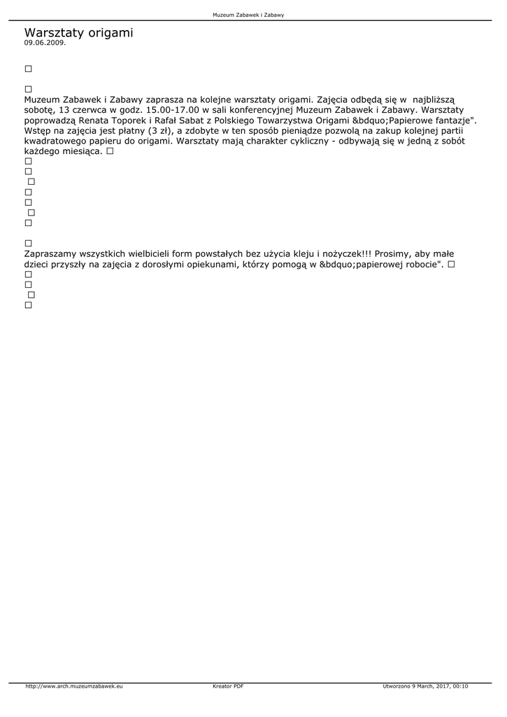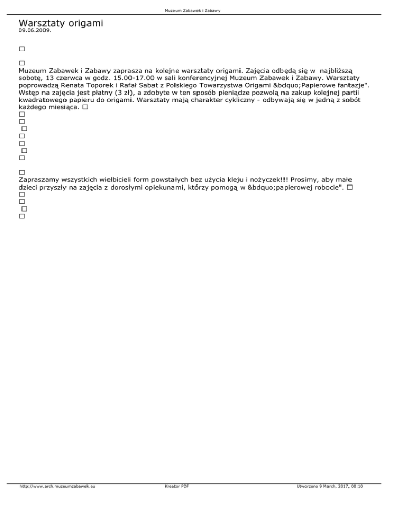 Muzeum Zabawek i Zabawy Warsztaty origami 09.06.2009. Muzeum Zabawek i Zabawy zaprasza na kolejne warsztaty origami. Zajęcia odbędą się w najbliższą sobotę, 13 czerwca w godz. 15.00-17.00 w sali konferencyjnej Muzeum Zabawek i Zabawy. Warsztaty poprowadzą Renata Toporek i Rafał Sabat z Polskiego Towarzystwa Origami „Papierowe fantazje". Wstęp na zajęcia jest płatny (3 zł), a zdobyte w ten sposób pieniądze pozwolą na zakup kolejnej partii kwadratowego papieru do origami. Warsztaty mają charakter cykliczny - odbywają się w jedną z sobót każdego miesiąca. Zapraszamy wszystkich wielbicieli form powstałych bez użycia kleju i nożyczek!!! Prosimy, aby małe dzieci przyszły na zajęcia z dorosłymi opiekunami, którzy pomogą w „papierowej robocie". http://www.arch.muzeumzabawek.eu Kreator PDF Utworzono 9 March, 2017, 00:10