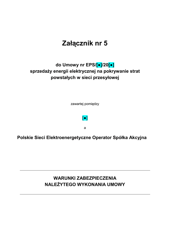 Załącznik nr 5 do Umowy nr EPS/[●]/20[●] sprzedaży energii elektrycznej na pokrywanie strat powstałych w sieci przesyłowej zawartej pomiędzy [●] a Polskie Sieci Elektroenergetyczne Operator Spółka Akcyjna WARUNKI ZABEZPIECZENIA NALEŻYTEGO WYKONANIA UMOWY Załącznik nr 5 do Umowy nr EPS/[●]/20[●] sprzedaży energii elektrycznej na pokrywanie strat powstałych w sieci przesyłowej zawartej pomiędzy Dostawcą a OSP 1. Dostawca w celu zabezpieczenia należytego wykonania Umowy, w ciągu 5 dni roboczych od daty zawarcia Umowy wniesie zabezpieczenie w wysokości równej 2 % wartości wynikającej z iloczynu ilości energii elektrycznej zawartej w GDE-G, określonej w Załączniku nr 1 do Umowy w Tabeli nr 2 i ceny rozliczeniowej dla GDE-G, określonej w Załączniku nr 2 do Umowy / sumy iloczynów: - ilości energii elektrycznej zawartej odpowiednio w produktach GDE-BASE, GDE-PEAK5, GDE-PEAK7, GDE-K [zapis opcja – w zależności od wyboru typu produktu w postępowaniu przetargowym], określonej w Załączniku nr 1 do Umowy w Tabeli nr 2 i - odpowiednio cen rozliczeniowych dla powyższych produktów, określonych w Załączniku nr 2 do Umowy. [zapis opcja – w zależności od wyboru typu produktu w postępowaniu przetargowym] Zabezpieczenie służy pokryciu ewentualnych roszczeń z tytułu niewykonania lub nienależytego wykonania Umowy, w tym w szczególności odszkodowania umownego, naliczanego zgodnie z postanowieniami Załącznika nr 3 do Umowy. 2. Zabezpieczenie, o którym mowa w pkt 1, Dostawca może ustanowić w jednej lub w kilku spośród wymienionych poniżej form: 1) przelewem środków pieniężnych w kwocie określonej w pkt 1 na rachunek bankowy OSP o numerze: [●]; 2) nieodwołalnej, bezwarunkowej gwarancji bankowej, wystawionej przez bank o aktualnej ocenie ratingowej, nadanej przez agencję ratingową, na poziomie BBB lub wyższym, na kwotę określoną w pkt 1. Okres ważności gwarancji obejmować powinien co najmniej okres od dnia [●] do 20-go dnia po terminie płatności za ostatni okres rozliczeniowy; 3) nieodwołalnej, bezwarunkowej gwarancji ubezpieczeniowej, wystawionej przez ubezpieczyciela o aktualnej ocenie ratingowej, nadanej przez agencję ratingową, na poziomie BBB lub wyższym, na kwotę określoną w pkt 1. Okres ważności gwarancji obejmować powinien co najmniej okres od dnia [●] do 20-go dnia po terminie płatności za ostatni okres rozliczeniowy. 3. Zabezpieczenie, o którym mowa w pkt 2.1), OSP będzie przechowywał na oprocentowanym rachunku bankowym. 4. Zabezpieczenie, o którym mowa w pkt 2.2) / 2.3) powinno być zgodne ze wzorem określonym w pkt 10. Wszelkie zapisy gwarancji odbiegające od wzoru wymagają uprzedniej akceptacji OSP. 5. Zabezpieczenie, o którym mowa w pkt 2.2) /2.3), Dostawca zobowiązany jest dostarczyć OSP w terminie określonym w pkt 1 na następujący adres: Polskie Sieci Elektroenergetyczne Operator S.A. Sekretariat Departamentu Przesyłu, pokój nr 119/A ul. Warszawska 165, 05-520 Konstancin – Jeziorna. 6. OSP zwróci zabezpieczenie, o którym mowa w pkt 2, w terminie 20 dni po terminie płatności za ostatni okres rozliczeniowy, nie wcześniej jednak niż po zakończeniu wszystkich rozliczeń wynikających z Umowy. Dostawca OSP strona 2 z 4 Załącznik nr 5 do Umowy nr EPS/[●]/20[●] sprzedaży energii elektrycznej na pokrywanie strat powstałych w sieci przesyłowej zawartej pomiędzy Dostawcą a OSP 7. OSP zwróci Dostawcy zabezpieczenie, o którym mowa w pkt 2.1) wraz z odsetkami wynikającymi z umowy rachunku bankowego, na którym było ono przechowywane, pomniejszone o koszt prowadzenia tego rachunku oraz prowizji bankowej za przelew pieniędzy na rachunek bankowy Dostawcy. Dostawca do 10-go dnia po zakończeniu ostatniego okresu rozliczeniowego poinformuje pisemnie OSP na jaki numer rachunku bankowego OSP ma dokonać zwrotu zabezpieczenia wniesionego w formie środków pieniężnych. 8. OSP zwolni zabezpieczenie wniesione w formie gwarancji bankowej/gwarancji ubezpieczeniowej, wysyłając do wystawcy tej gwarancji oryginał dokumentu gwarancji listem poleconym. 9. Dostawca ma obowiązek być ubezpieczony od odpowiedzialności cywilnej w zakresie prowadzonej działalności gospodarczej, obejmującej działalność związaną z przedmiotem Umowy, w całym okresie obowiązywania Umowy. W przypadku, gdy okres ważności polisy lub innego dokumentu ubezpieczenia upływa w trakcie okresu obowiązywania Umowy, Dostawca jest zobowiązany do dostarczenia OSP kopii kolejnej polisy lub innego dokumentu ubezpieczenia (przedłużającej okres ubezpieczenia od odpowiedzialności cywilnej w zakresie prowadzonej działalności gospodarczej, obejmującej działalność związaną z przedmiotem Umowy), poświadczonej za zgodność z oryginałem przez osoby do tego uprawnione lub inne upoważnione osoby, dla których zostało dołączone odpowiednie upoważnienie, niezwłocznie, lecz nie później, niż w terminie do 7 dni od daty upływu dotychczasowego okresu ubezpieczenia. Niedostarczenie kopii polisy lub innego dokumentu ubezpieczenia, o których mowa powyżej, będzie traktowane jako poważne naruszenie postanowień Umowy. 10. Zabezpieczenie, o którym mowa w pkt 2.2) / 2.3) powinno być wniesione zgodnie z następującym wzorem. Dostawca OSP strona 3 z 4 Załącznik nr 5 do Umowy nr EPS/[●]/20[●] sprzedaży energii elektrycznej na pokrywanie strat powstałych w sieci przesyłowej zawartej pomiędzy Dostawcą a OSP Warszawa, dnia …. …………. r. Beneficjent: Polskie Sieci Elektroenergetyczne Operator S.A. ul. Warszawska 165 05-520 Konstancin – Jeziorna GWARANCJA BANKOWA/ UBEZPIECZNIOWA NR ………………. Zostaliśmy poinformowani przez naszego Klienta ……………….., z siedzibą w………….. (dalej „Klient”), że wymagana jest gwarancja bankowa / ubezpieczeniowa w wysokości …………….. zł (słownie: ……………………..) – wystawiona na Waszą rzecz i zabe