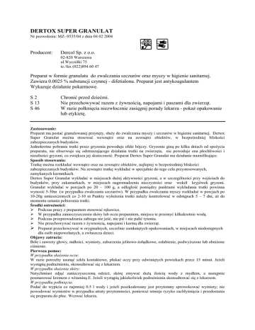 DERTOX SUPER GRANULAT Nr pozwolenia: MZ- 0535/04 z dnia 04 02 2004 Producent: Dercol Sp. z o.o. 02-820 Warszawa ul.Wyczółki 75 te./fax (022)894 60 47 Preparat w formie granulatu do zwalczania szczurów oraz myszy w higienie sanitarnej. Zawiera 0.0025 % substancji czynnej - difetialonu. Preparat jest antykoagulantem Wykazuje działanie pokarmowe. S2 S 13 S 46 Chronić przed dziećmi. Nie przechowywać razem z Ŝywnością, napojami i paszami dla zwierząt. W razie połknięcia niezwłocznie zasięgnij porady lekarza - pokaŜ opakowanie lub etykietę. Zastosowanie: Preparat ma postać granulowanej przynęty, słuŜy do zwalczania myszy i szczurów w higienie sanitarnej. Dertox Super Granulat moŜna stosować wewnątrz oraz na zewnątrz obiektów, w bezpośredniej bliskości zabezpieczanych budynków. Jednokrotne pobranie trutki przez gryzonia powoduje efekt bójczy. Gryzonie giną po kilku dniach od spoŜycia preparatu, nie obserwuje się odstraszającego działania trutki na zwierzęta, nie powoduje ona płochliwości i nieufności gryzoni, co zwiększa jej skuteczność. Preparat Dertox Super Granulat ma działanie mumifikujące. Sposób stosowania: Trutkę moŜna rozkładać wewnątrz oraz na zewnątrz obiektów, najlepiej w bezpośredniej bliskości zabezpieczanych budynków. Na zewnątrz trutkę wykładać w specjalnie do tego celu przystosowanych, zamykanych karmnikach. Dertox Super Granulat wykładać w miejscach duŜej aktywności gryzoni, a w szczególności przy wejściach do budynków, przy zakamarkach, w miejscach nagromadzenia nieczystości oraz wokół kryjówek gryzoni. Granulat wykładać w porcjach po 20 – 100 g, a odległość pomiędzy punktami wykładania trutki powinna wynosić 5-30m (w przypadku zwalczania szczurów). W przypadku zwalczania myszy rozkładać w porcjach po 10-20g umieszczonych co 2-10 m Punkty wyłoŜenia trutki naleŜy kontrolować w odstępach 5 – 7 dni, aŜ do momentu ustania pobierania trutki. Środki ostroŜności: Podczas pracy z preparatem stosować rękawice. W przypadku zanieczyszczenia skóry lub oczu preparatem, miejsca te przemyć kilkakrotnie wodą. Podczas przeprowadzania zabiegu nie jeść, nie pić i nie palić tytoniu. Nie przechowywać razem z Ŝywnością, napojami i karmą dla zwierząt. Preparat przechowywać w oryginalnych, szczelnie zamkniętych opakowaniach, w miejscach niedostępnych dla osób niepowołanych, a zwłaszcza dzieci. Objawy zatrucia: Bóle i zawroty głowy, mdłości, wymioty, zaburzenia jelitowo-Ŝołądkowe, osłabienie, podwyŜszone lub obniŜone ciśnienie. Pierwsza pomoc: W przypadku skaŜenia oczu: W razie potrzeby usunąć szkła kontaktowe, płukać oczy przy odwiniętych powiekach przez 15 minut. JeŜeli wystąpią podraŜnienia, skonsultować się z lekarzem. W przypadku skaŜenia skóry: Natychmiast zdjąć zanieczyszczoną odzieŜ, skórę zmywać duŜą ilością wody z mydłem, a następnie posmarować kremem z witaminą E. JeŜeli wystąpią jakiekolwiek podraŜnienia skonsultować się z lekarzem. W przypadku połknięcia: Podać do wypicia co najmniej 0.5 l wody i jeŜeli poszkodowany jest przytomny sprowokować wymioty; nie powodować wymiotów w przypadku utraty przytomności, poniewaŜ istnieje ryzyko zachłyśnięcia i przedostania się preparatu do płuc. Wezwać lekarza. Magazynowanie: Preparat przechowywać w oryginalnych, szczelnie zamkniętych opakowaniach, w suchym i dobrze wentylowanym magazynie w temperaturze 0 - 25 0C, z dala od środków spoŜywczych, pasz, naczyń na Ŝywność, źródeł ciepła i ognia, w miejscach niedostępnych dla osób nieupowaŜnionych, a w szczególności dzieci. Postępowanie z odpadami preparatu i opakowaniem: Padłe gryzonie usuwać zgodnie z obowiązującymi przepisami. Resztki preparatu oraz puste opakowania zebrać i traktować jako odpady komunalne. Zabrania się spalania opakowań po środku we własnym zakresie. UWAGA! ZABRANIA SIĘ WYKORZYSTYWANIA OPRÓśNIONYCH OPAKOWAŃ DO INNYCH CELÓW, W TYM TAKśE TRAKTOWANIA ICH JAKO SUROWCE WTÓRNE. ANTIDOTUM: WITAMINA K. W sytuacjach, kiedy konieczna jest inna pomoc medyczna niŜ ujęta w ostrzeŜeniach skontaktować się z najbliŜszym ośrodkiem toksykologicznym: Ośrodki Toksykologiczne w Polsce: Gdańsk - /0-58/ 301-65-16, Kraków - /0-12/ 411-99-99, Lublin - /0-81/ 740-26-76, Łódź - /0-42/ 657-99-00, Poznań - /0-61/ 847-69-46, Rzeszów - /0-17/ 86-644-09, Sosnowiec - / 0-32/ 266-11-45, Warszawa - /0-22/ 61908-97, Wrocław - / 0-71/ 34-33-008. Skutek działania środka biobójczego: W przypadku powtórnego pojawienia się gryzoni po wykonaniu zabiegu, naleŜy go powtarzać w odstępach dwutygodniowych. Zalecenia dotyczące wentylacji: Preparat nie działa szkodliwie przez drogi oddechowe. Data produkcji: ......... Okres waŜności - 3 lata Nr serii: ........... Pojemność opakowania: ..........