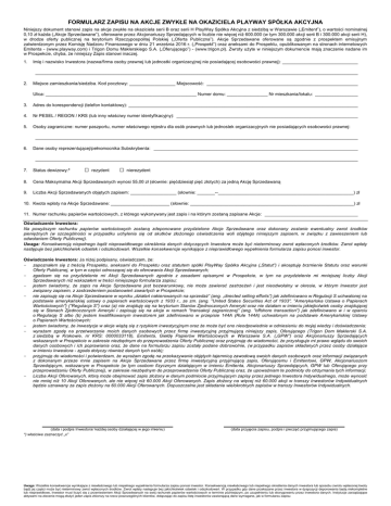 FORMULARZ ZAPISU NA AKCJE ZWYKŁE NA OKAZICIELA PLAYWAY SPÓŁKA AKCYJNA