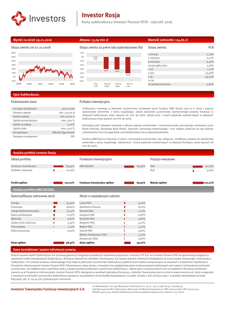 Investor Rosja Karta subfunduszu Investor Parasol SFIO - styczeń 2016 Wyniki na dzień 29.01.2016 Stopa zwrotu od 07.10.2008 Aktywa: 13,09 mln zł Wartość jednostki: 104,85 zł Stopa zwrotu za pełne lata kalendarzowe (%) Stopa zwrotu 1 miesiąc 3 miesiące 6 miesięcy od początku roku 1 rok 3 lata 5 lat 10 lat od pierwszej wyceny PLN 2,28% -6,17% -6,48% 2,28% 1,27% -33,58% -39,30% 4,83% Opis Subfunduszu Podstawowe dane Polityka inwestycyjna Początek działalności 06.10.2008 Pierwsza wpłata min. 100,00 zł Kolejna wpłata min. 50,00 zł Opłata manipulacyjna max. 5,00 % Opłata za wykup 0,00% Opłata stała Zarządzający max. 4,00 % Mikołaj Stępniewski Dostępny w programie ISO Subfundusz inwestuje w jednostki uczestnictwa emitowane przez fundusz DWS Russia oraz w w akcje i papiery wartościowe emitentów z rynku rosyjskiego. Udział jednostek uczestnictwa wymienionego powyżej funduszu w aktywach Subfunduszu może wynosić od 70% do 100%. Udział akcji i innych papierów wartościowych w aktywach Subfunduszu może wynosić od 70% do 100%. Pozostałą część aktywów inwestuje w dłużne papiery wartościowe i instrumenty rynku pieniężnego emitowane przez Skarb Państwa, Narodowy Bank Polski, jednostki samorządu terytorialnego i inne władze publiczne (w tym państw członkowskich Unii Europejskiej), przedsiębiorstwa oraz w depozyty bankowe. Fundusz DWS Russia inwestuje w akcje i inne papiery wartościowe (np. obligacje, certyfikaty z prawem do dywidendy) emitentów z rynku rosyjskiego. Udział akcji i innych papierów wartościowych w aktywach funduszu może wynosić od 70% do 100%. Analiza portfela Investor Rosja Skład portfela Fundusze inwestycyjne Fundusze inwestycyjne 89,95% Gotówka i depozyty 10,05% Portfel ogółem 100,00% DWS RUSSIA Fundusze inwestycyjne ogółem Pozycje walutowe 89,95% 89,95% EUR 90,19% PLN 9,81% Waluta ogółem 100,00% Analiza portfela DWS RUSSIA Dywersyfikacja sektorowa akcji Akcje o największym udziale Energia 35,90% Lukoil PJSC 9,50% Finansowy 18,60% Sberbank of Russia 8,70% Usługi telekomunikacyjne 15,50% Rosneft OAO 7,10% Dobra podstawowe 11,30% Gazprom PAO 6,90% Materiały 9,60% NovaTek OAO 4,80% Użyteczność publiczna 5,30% MegaFon PJSC 4,70% Przemysłowy 2,10% Magnit PJSC 4,70% Dobra luksusowe 0,60% Tatneft PAO 4,60% Akcje ogółem 98,90% Mobile TeleSystems PJSC 4,10% Rostelecom OJSC 3,90% Akcje ogółem 59,00% Dane kontaktowe i ważne informacje prawne Dotychczasowe wyniki Subfunduszu nie stanowią gwarancji osiągnięcia podobnych wyników w przyszłości. Investors TFI S.A. ani Investor Parasol SFIO nie gwarantują osiągnięcia założonych celów inwestycyjnych Subfunduszu. Niniejszy materiał ma charakter informacyjny i nie zawiera pełnych informacji niezbędnych do oceny ryzyka związanego z inwestycją w Subfundusz i nie stanowi przekazu reklamowego. Przy nabyciu jednostek uczestnictwa Subfunduszu pobierana jest opłata manipulacyjna na zasadach i w wysokości określonej w Prospekcie Informacyjnym Investor Parasol SFIO. Prezentowane stopy zwrotu z inwestycji nie uwzględniają opłat manipulacyjnych pobieranych przy nabyciu lub konwersji jednostek uczestnictwa. Szczegółowy opis czynników ryzyka, zasady sprzedaży jednostek uczestnictwa Subfunduszu, tabela opłat manipulacyjnych oraz szczegółowe informacje podatkowe zawarte są w Prospekcie Informacyjnym Investor Parasol SFIO, dostępnym w punktach dystrybucji Funduszu, siedzibie Towarzystwa oraz na stronie www.investors.pl. Zyski osiągnięte z inwestycji w jednostki uczestnictwa Subfunduszu obciążone są podatkiem od dochodów kapitałowych, na podst. Ustawy z dnia 26 lipca 1991 r. o podatku dochodowym od osób fizycznych, (Dz. U. 00.14.176 z późniejszymi zmianami). Investors Towarzystwo Funduszy Inwestycyjnych S.A. ul. Mokotowska 1 I 00-640 Warszawa I Infolinia 801 00 33 70 I +48 22 588 18 45 I investors.pl Sąd Rejonowy dla M.St. Warszawy w Warszawie XII Wydział Gospodarczy I KRS 0000227685 I NIP 1070001525 REGON 140027134 I Kapitał zakładowy jest równy kapitałowi wpłaconemu i wynosi 7 257 190 zł