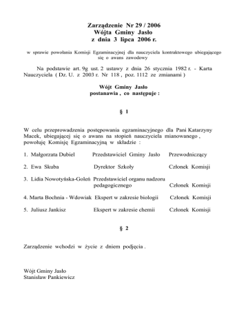 Zarządzenie Nr 29 / 2006 Wójta Gminy Jasło z dnia 3 lipca 2006 r. w sprawie powołania Komisji Egzaminacyjnej dla nauczyciela kontraktowego ubiegającego się o awans zawodowy Na podstawie art. 9g ust. 2 ustawy z dnia 26 stycznia 1982 r. - Karta Nauczyciela ( Dz. U. z 2003 r. Nr 118 , poz. 1112 ze zmianami ) Wójt Gminy Jasło postanawia , co następuje : § 1 W celu przeprowadzenia postępowania egzaminacyjnego dla Pani Katarzyny Macek, ubiegającej się o awans na stopień nauczyciela mianowanego , powołuję Komisję Egzaminacyjną w składzie : 1. Małgorzata Dubiel Przedstawiciel Gminy Jasło Przewodniczący 2. Ewa Skuba Dyrektor Szkoły Członek Komisji 3. Lidia Nowotyńska-Goleń Przedstawiciel organu nadzoru pedagogicznego Członek Komisji 4. Marta Bochnia - Wdowiak Ekspert w zakresie biologii Członek Komisji 5. Juliusz Jankisz Członek Komisji Ekspert w zakresie chemii § 2 Zarządzenie wchodzi w życie z dniem podjęcia . Wójt Gminy Jasło Stanisław Pankiewicz