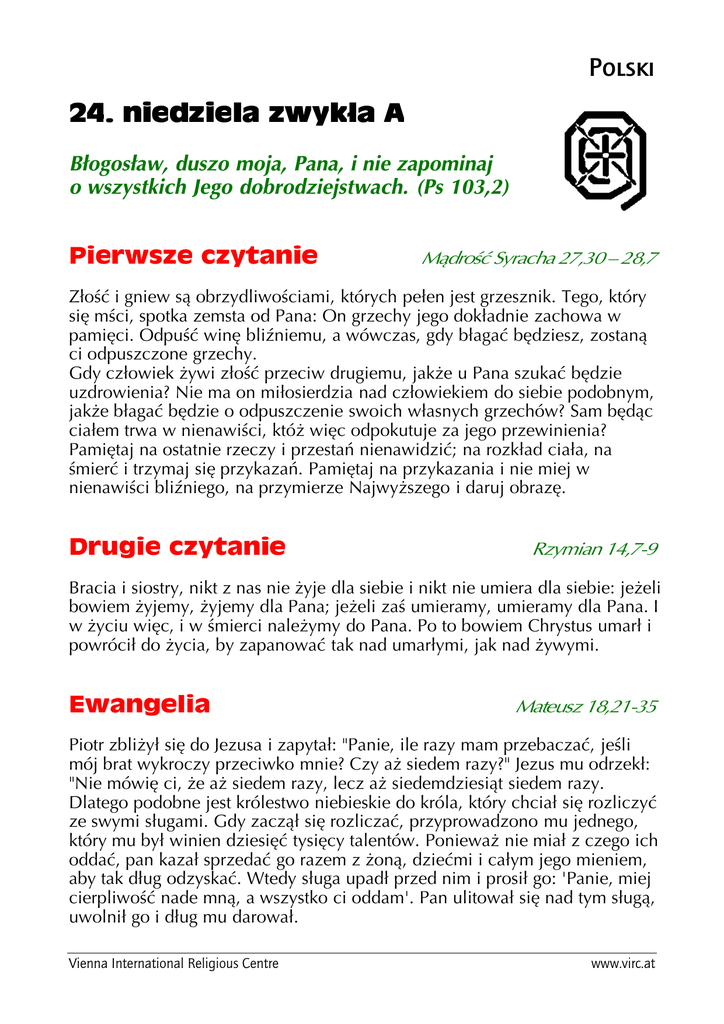 Polski Błogosław, duszo moja, Pana, i nie zapominaj o wszystkich Jego dobrodziejstwach. (Ps 103,2) Złość i gniew są obrzydliwościami, których pełen jest grzesznik. Tego, który się mści, spotka zemsta od Pana: On grzechy jego dokładnie zachowa w pamięci. Odpuść winę bliźniemu, a wówczas, gdy błagać będziesz, zostaną ci odpuszczone grzechy. Gdy człowiek żywi złość przeciw drugiemu, jakże u Pana szukać będzie uzdrowienia? Nie ma on miłosierdzia nad człowiekiem do siebie podobnym, jakże błagać będzie o odpuszczenie swoich własnych grzechów? Sam będąc ciałem trwa w nienawiści, któż więc odpokutuje za jego przewinienia? Pamiętaj na ostatnie rzeczy i przestań nienawidzić; na rozkład ciała, na śmierć i trzymaj się przykazań. Pamiętaj na przykazania i nie miej w nienawiści bliźniego, na przymierze Najwyższego i daruj obrazę. Bracia i siostry, nikt z nas nie żyje dla siebie i nikt nie umiera dla siebie: jeżeli bowiem żyjemy, żyjemy dla Pana; jeżeli zaś umieramy, umieramy dla Pana. I w życiu więc, i w śmierci należymy do Pana. Po to bowiem Chrystus umarł i powrócił do życia, by zapanować tak nad umarłymi, jak nad żywymi. Piotr zbliżył się do Jezusa i zapytał: "Panie, ile razy mam przebaczać, jeśli mój brat wykroczy przeciwko mnie? Czy aż siedem razy?" Jezus mu odrzekł: "Nie mówię ci, że aż siedem razy, lecz aż siedemdziesiąt siedem razy. Dlatego podobne jest królestwo niebieskie do króla, który chciał się rozliczyć ze swymi sługami. Gdy zaczął się rozliczać, przyprowadzono mu jednego, który mu był winien dziesięć tysięcy talentów. Ponieważ nie miał z czego ich oddać, pan kazał sprzedać go razem z żoną, dziećmi i całym jego mieniem, aby tak dług odzyskać. Wtedy sługa upadł przed nim i prosił go: 'Panie, miej cierpliwość nade mną, a wszystko ci oddam'. Pan ulitował się nad tym sługą, uwolnił go i dług mu darował. Vienna International Religious Centre www.virc.at Lecz gdy sługa ów wyszedł, spotkał jednego ze współsług, który mu był winien sto denarów. Chwycił go i zaczął dusić, mówiąc: 'Oddaj, coś winien'. Jego współsługa upadł przed nim i prosił go: 'Miej cierpliwość nade mną, a oddam tobie'. On jednak nie chciał, lecz poszedł i wtrącił go do więzienia, dopóki nie odda długu. Współsłudzy jego widząc, co się działo, bardzo się zasmucili. Poszli i opowiedzieli swemu panu wszystko, co zaszło. Wtedy pan jego wezwał go przed siebie i rzekł mu: 'Sługo niegodziwy! Darowałem ci cały ten dług, ponieważ mnie prosiłeś. Czyż więc i ty nie powinieneś był ulitować się nad swoim współsługą, jak ja ulitowałem się nad tobą?' I uniesiony gniewem pan jego kazał wydać go katom, dopóki mu całego długu nie odda. Podobnie uczyni wam Ojciec mój niebieski, jeżeli każdy z was nie przebaczy z serca swemu bratu". Przesłanie dzisiejszej Ewangelii można wyrazić jednym zdaniem: chodzi o bezgraniczne przebaczenie. Piotr, któremu przekazana została władza wiązania i rozwiązywania, pyta Jezusa o wymiar, o granicę wybaczania. Ona nie istnieje, gdyż Bóg to, czego od nas wymaga, uobecnił we wspólnej historii z człowiekiem. Cała Biblia jest pełna relacji o ciągłym miłosierdziu i przebaczaniu Boga. Ilekroć lud Boży popadał w niewierność, a nie był to – według Biblii – rzadki wypadek, tyle razy Bóg był gotowy do wybaczenia. Po ludzku patrząc, można się dziwić, że Bóg, wobec ciągłego schodzenia na manowce swojego ludu i niekończącego się powtarzania grzechu, nawrócenia, zaczynania od początku, nie popada w rezygnację i nie kończy tej historii. On okazuje się "miłosiernym Ojcem", którego spotykamy także w Nowym Testamencie – szczególnie w przypowieści o zaginionym synu. Nawet nie przychodzi Mu na myśl, aby odmówić przebaczenia swojemu ukochanemu dziecku. On nie odrzuca żadnego skruszonego grzesznika. Jezus nie domaga się od nas niczego, jak tylko tego, co czyni Jego Ojciec w niebie. Dzisiejszy fragment Pisma świętego ukazuje wyraźnie, że przebaczenie Boga nie jest jedynie osobistą sprawą pomiędzy Bogiem i pojedynczą osobą. Przebaczenie, które otrzymujemy od Boga, oznacza zobowiązanie i odpowiedzialność. Wspólnota Nowego Przymierza charakteryzuje się wzajemną miłością jej członków. Jezus nakazuje nam tak kochać się wzajemnie, jak On nas umiłował; wspaniałomyślnie przebaczać sobie wzajemnie w oparciu o miłość. Powinniśmy sobie nawzajem szczerze i miłosiernie przebaczać – aż "siedemdziesiąt siedem razy" (biblijne określenie na bezgraniczność) – na wzór miłosiernego serca Boga. Nie powinniśmy jednak tego wymagania traktować zbyt lekko. Druga część dzisiejszej Ewangelii wskazuje bowiem na to, że przebaczenie Boga nie jest znowu aż tak "bezwarunkowe". Jeżeli nie będziemy przekazywać miłosierdzia Bożego, zatracimy się. Nie zależy to jednak od chwiejności Boga. Jeśli bowiem pozwolimy miłosierdziu Boga przemienić siebie w nowego człowieka, wówczas nie będziemy potrafili inaczej, jak tylko przebaczać w oparciu o radość z Jego daru. Niedopuszczenie do przemiany oznacza odrzucenie daru. Nie możemy zatem Jego miłosierdzia przekazywać i w ten sposób "przegrywamy" je. Vienna International Religious Centre [email protected]