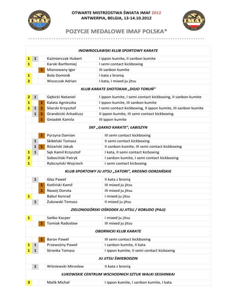OTWARTE MISTRZOSTWA ŚWIATA IMAF 2012 ANTWERPIA, BELGIA, 13-14.10.2012 POZYCJE MEDALOWE IMAF POLSKA* ----------------------------------------------------------------------------INOWROCŁAWSKI KLUB SPORTOWY KARATE 1 1 1 1 2 Kaźmierczak Hubert Karski Bartłomiej 1 Mianowany Igor Boła Dominik Woszczak Adrian I ippon kumite, II sanbon kumite I semi contact kickboxing III sanbon kumite I kata z bronią I kata, I mixed ju jitsu KLUB KARATE SHOTOKAN „DOJO TORUŃ” 2 1 Gębicki Nataniel 1 1 Kalata Agnieszka 1 1 1 Silarski Krzysztof 1 1 Grandzicki Arkadiusz 1 Gniadek Kamila I ippon kumite, I semi contact kickboxing, II sanbon kumite I ippon kumite, III sanbon kumite I semi contact kickboxing, II ippon kumite, III sanbon kumite II ippon kumite, III semi contact kickboxing III ippon kumite SKF „GAKKO KARATE”, ŁABISZYN 1 Pyrzyna Damian 1 Skibiński Tomasz 1 1 Różański Jakub 1 1 Sęk Kamil Krzysztof 2 Sobociński Patryk 1 Rybczyński Wojciech III semi contact kickboxing II semi contact kickboxing II sanbon kumite, III semi contact kickboxing I kata, II semi contact kicboxing I sanbon kumite, I semi contact kickboxing I semi contact kicboxing KLUB SPORTOWY JU JITSU „SATORI”, KROSNO ODRZAŃSKIE 1 Glaz Paweł 1 Kotliński Kamil 1 Nawój Dorota 1 Babul Konrad 1 Żukowski Tomasz II kata z bronią III mixed ju jitsu III mixed ju jitsu I mixed ju jitsu II mixed ju jitsu ZIELONOGÓRSKI OŚRODEK JU JITSU / KOBUDO (PAJJ) 1 Sańko Kacper 1 Tomiak Radosław I mixed ju jitsu III mixed ju jitsu OBORNICKI KLUB KARATE 1 Baran Paweł 1 1 Przewoźny Paweł 1 1 Stronka Tomasz III semi contact kickboxing I sanbon kumite, II kata I ippon kumite, II semi contact kicboxing JU JITSU ŚWIEBODZIN 1 Wiśniewski Mirosław II kata z bronią ŁUKOWSKIE CENTRUM WSCHODNICH SZTUK WALKI SEISHINKAI 3 Malik Michał I ippon kumite, I sanbon kumite, I kata DRUŻYNY - KATA SYNCHRONICZNE 1 1 Dominik Boła, Igor Mianowany, Filip Mianowany (wszyscy Inowrocławski KSK) Paweł Przewoźny, Paweł Baran, Krzysztof Waśko (wszyscy Obornicki KK) 1 Bartłomiej Karski, Emil Witkowski (obaj Inowrocławski KSK), Michał Malik (Seishinkai Łuków) ----------------------------------------------------------------------------IMAF POLSKA 22 12 12 IMAF POLSKA ----------------------------------------------------------------------------- SPECJALNE WYRÓŻNIENIA: NATANIEL GĘBICKI (KLUB KARATE SHOTOKAN „DOJO TORUŃ”), WYRÓŻNIENIE ZAWODNICZE MACIEJ SIKORA (ZIELONOGÓRSKI OŚRODEK JU JITSU / KOBUDO), WYRÓŻNIENIE TRENERSKIE * wykaz nie uwzględnia szczegółowego podziału w konkurencjach (wiek, stopień, waga etc.)