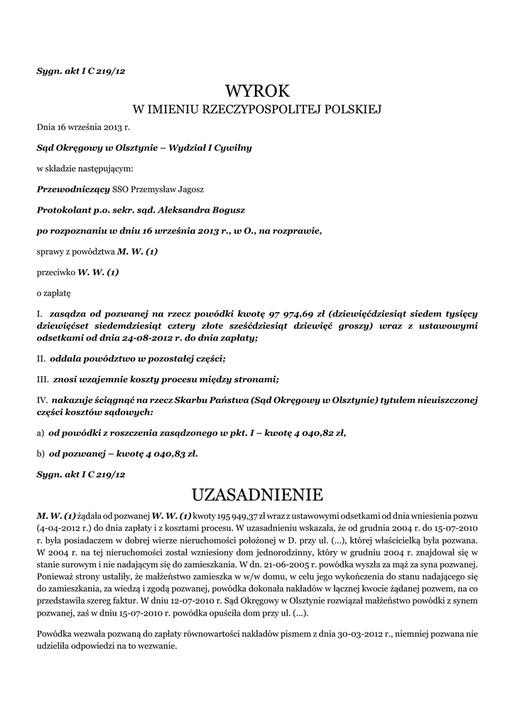 Sygn. akt I C 219/12 WYROK W IMIENIU RZECZYPOSPOLITEJ POLSKIEJ Dnia 16 września 2013 r. Sąd Okręgowy w Olsztynie – Wydział I Cywilny w składzie następującym: Przewodniczący SSO Przemysław Jagosz Protokolant p.o. sekr. sąd. Aleksandra Bogusz po rozpoznaniu w dniu 16 września 2013 r., w O., na rozprawie, sprawy z powództwa M. W. (1) przeciwko W. W. (1) o zapłatę I. zasądza od pozwanej na rzecz powódki kwotę 97 974,69 zł (dziewięćdziesiąt siedem tysięcy dziewięćset siedemdziesiąt cztery złote sześćdziesiąt dziewięć groszy) wraz z ustawowymi odsetkami od dnia 24-08-2012 r. do dnia zapłaty; II. oddala powództwo w pozostałej części; III. znosi wzajemnie koszty procesu między stronami; IV. nakazuje ściągnąć na rzecz Skarbu Państwa (Sąd Okręgowy w Olsztynie) tytułem nieuiszczonej części kosztów sądowych: a) od powódki z roszczenia zasądzonego w pkt. I – kwotę 4 040,82 zł, b) od pozwanej – kwotę 4 040,83 zł. Sygn. akt I C 219/12 UZASADNIENIE M. W. (1) żądała od pozwanej W. W. (1) kwoty 195 949,37 zł wraz z ustawowymi odsetkami od dnia wniesienia pozwu (4-04-2012 r.) do dnia zapłaty i z kosztami procesu. W uzasadnieniu wskazała, że od grudnia 2004 r. do 15-07-2010 r. była posiadaczem w dobrej wierze nieruchomości położonej w D. przy ul. (...), której właścicielką była pozwana. W 2004 r. na tej nieruchomości został wzniesiony dom jednorodzinny, który w grudniu 2004 r. znajdował się w stanie surowym i nie nadającym się do zamieszkania. W dn. 21-06-2005 r. powódka wyszła za mąż za syna pozwanej. Ponieważ strony ustaliły, że małżeństwo zamieszka w w/w domu, w celu jego wykończenia do stanu nadającego się do zamieszkania, za wiedzą i zgodą pozwanej, powódka dokonała nakładów w łącznej kwocie żądanej pozwem, na co przedstawiła szereg faktur. W dniu 12-07-2010 r. Sąd Okręgowy w Olsztynie rozwiązał małżeństwo powódki z synem pozwanej, zaś w dniu 15-07-2010 r. powódka opuściła dom przy ul. (...). Powódka wezwała pozwaną do zapłaty równowartości nakładów pismem z dnia 30-03-2012 r., niemniej pozwana nie udzieliła odpowiedzi na to wezwanie. (pozew) Pozwana W. W. (1)wniosła o oddalenie powództwa i zwrot kosztów procesu. W uzasadnieniu wskazała, że kwestionuje przedstawione przez powódkę faktury jako nieprawdziwe lub dotyczące innej budowy. Powódka nie pracowała i nie uzyskiwała żadnego dochodu, nie dokonywała żadnych zakupów materiałów budowlanych, gdyż zajmował się tym syn pozwanej, a finansowaniem budowy zajmowała się pozwana, jej mąż i syn. W 2005 r. dom był wykończony na parterze, zaś poddasze wykończono latem 2005 r. Powódka zamieszkała tam wspólnie z synem pozwanej, w lutym 2005 r. wyprowadziła się do swoich rodziców, a następnie – po ślubie z synem pozwanej – ponownie zamieszkali razem w domu przy G. (odpowiedź na pozew k. 78-80) Sąd ustalił, co następuje: W dniu 23-09-2003 r. M. W. (2) (syn pozwanej) i powódka zawarli umowę przedwstępną kupna działki gruntu położonej w D. przy ul. (...), przy czym do zawarcia umowy przyrzeczonej miało dojść po uzyskaniu przez syna pozwanej potwierdzenia obywatelstwa polskiego. (bezsporne, umowa k. 91-92) W dniu 20-11-2003 r. syn pozwanej w obecności powódki dokonał kupna przedmiotowej działki tylko na swoją rzecz. (bezsporne, umowa k. 97-99) W dacie tych umów powódka i syn pozwanej nie byli małżeństwem, natomiast mieli wspólne plany życiowe. (bezsporne) W 2004 r. na przedmiotowej działce rozpoczęła się budowa domu jednorodzinnego. Inwestycję prowadził M. W. (2) (syn pozwanej), który miał już przygotowaną część materiałów budowlanych przechowywanych m.in. u znajomych, a zakupionych i pobranych m.in. w hurtowni prowadzonej przez rodziców powódki. W kwietniu i lipcu 2004 r. M. W. zawarł umowę sprzedaży energii elektrycznej oraz o przyłączenie do sieci gazowej, a ta ostatnia sieć został odebrana w grudniu 2004 r. W grudniu 2004 r. budynek był już postawiony i na parterze wykończony w stopniu nadającym się do zamieszkania. Początkowo zamieszkał tam syn pozwanej, a następnie – w grudniu 2004 r. - wprowadziła się powódka. (bezsporne, zeznania świadków k. 163-168, zwłaszcza S. K. i M. W., dokumentacja umów i odbiorów w zakresie mediów k. 88-89, 104-110, zeznania stron) W dniu 21-06-2005 r. powódka i syn pozwanej zawarli związek małżeński w Niemczech. W dniu 17-09-2005 r. powódka i syn wzięli ślub kościelny w Polsce, zarejestrowany przez polski USC. Małżonkowie nie zawierali małżeńskich umów majątkowych (bezsporne, oświadczenia k. 117v) W dniu 22-09-2005 r. (5 dni po ślubie kościelnym) syn pozwanej darował pozwanej do jej majątku osobistego działkę przy ul. (...). Przy zawieraniu umowy wskazano, że M. W. nabył działkę przed zawarciem małżeństwa i umów majątkowych małżeńskich nie zawierał, a na działce znajduje się rozpoczęta budowa domu mieszkalnego. (bezsporne, umowa k. 93-94) Po dacie małżeństwa powódka i M. W. (2), mimo darowizny dokonanej na rzecz pozwanej, nadal mogli zamieszkiwać w domu przy ul. (...). Nadal były prowadzone prace zmierzające do wykończenia domu oraz jego otoczenia. Materiały do budowy i prac wykończeniowych w większości były pobierane z hurtowni prowadzonej przez rodziców powódki – E.i S. R.. Pobrane materiały odnotowywano w zeszycie, wydawano na nie dokumenty WZ, zaś na potwierdzenie ich zakupu wystawiano faktury na nazwisko powódki. W poszczególnych latach suma kwot obrazujących wartość pobranych w ten sposób materiałów obliczona na podstawie w/w dokumentów wynosiła: a) w 2005 r. – 60 445,27 zł (od czerwca 2005 r.), b) w 2006 r. – 15 181,96 zł, c) w 2007 r. – 19 241,24 zł, d) w 2008 r. – 92 108,95 zł, e) w 2009 r. – 8 971,95 zł, tj. łącznie 195 949,37 zł. (faktury i rachunki w załączniku, zestawienie k. 220-223) W dniu 12-07-2010 r.