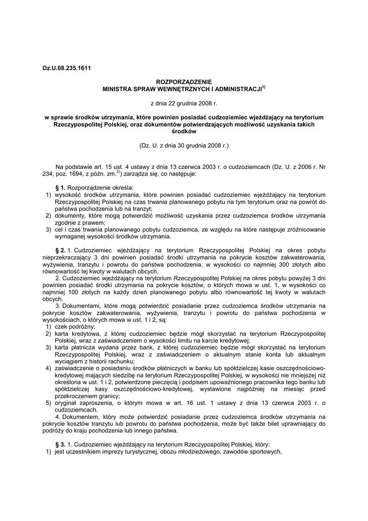 Dz.U.08.235.1611 ROZPORZĄDZENIE 1) MINISTRA SPRAW WEWNĘTRZNYCH I ADMINISTRACJI z dnia 22 grudnia 2008 r. w sprawie środków utrzymania, które powinien posiadać cudzoziemiec wjeżdżający na terytorium Rzeczypospolitej Polskiej, oraz dokumentów potwierdzających możliwość uzyskania takich środków (Dz. U. z dnia 30 grudnia 2008 r.) Na podstawie art. 15 ust. 4 ustawy z dnia 13 czerwca 2003 r. o cudzoziemcach (Dz. U. z 2006 r. Nr 2) 234, poz. 1694, z późn. zm. ) zarządza się, co następuje: § 1. Rozporządzenie określa: 1) wysokość środków utrzymania, które powinien posiadać cudzoziemiec wjeżdżający na terytorium Rzeczypospolitej Polskiej na czas trwania planowanego pobytu na tym terytorium oraz na powrót do państwa pochodzenia lub na tranzyt; 2) dokumenty, które mogą potwierdzić możliwość uzyskania przez cudzoziemca środków utrzymania zgodnie z prawem; 3) cel i czas trwania planowanego pobytu cudzoziemca, ze względu na które następuje zróżnicowanie wymaganej wysokości środków utrzymania. § 2. 1. Cudzoziemiec wjeżdżający na terytorium Rzeczypospolitej Polskiej na okres pobytu nieprzekraczający 3 dni powinien posiadać środki utrzymania na pokrycie kosztów zakwaterowania, wyżywienia, tranzytu i powrotu do państwa pochodzenia, w wysokości co najmniej 300 złotych albo równowartość tej kwoty w walutach obcych. 2. Cudzoziemiec wjeżdżający na terytorium Rzeczypospolitej Polskiej na okres pobytu powyżej 3 dni powinien posiadać środki utrzymania na pokrycie kosztów, o których mowa w ust. 1, w wysokości co najmniej 100 złotych na każdy dzień planowanego pobytu albo równowartość tej kwoty w walutach obcych. 3. Dokumentami, które mogą potwierdzić posiadanie przez cudzoziemca środków utrzymania na pokrycie kosztów zakwaterowania, wyżywienia, tranzytu i powrotu do państwa pochodzenia w wysokościach, o których mowa w ust. 1 i 2, są: 1) czek podróżny; 2) karta kredytowa, z której cudzoziemiec będzie mógł skorzystać na terytorium Rzeczypospolitej Polskiej, wraz z zaświadczeniem o wysokości limitu na karcie kredytowej; 3) karta płatnicza wydana przez bank, z której cudzoziemiec będzie mógł skorzystać na terytorium Rzeczypospolitej Polskiej, wraz z zaświadczeniem o aktualnym stanie konta lub aktualnym wyciągiem z historii rachunku; 4) zaświadczenie o posiadaniu środków płatniczych w banku lub spółdzielczej kasie oszczędnościowokredytowej mających siedzibę na terytorium Rzeczypospolitej Polskiej, w wysokości nie mniejszej niż określona w ust. 1 i 2, potwierdzone pieczęcią i podpisem upoważnionego pracownika tego banku lub spółdzielczej kasy oszczędnościowo-kredytowej, wystawione najpóźniej na miesiąc przed przekroczeniem granicy; 5) oryginał zaproszenia, o którym mowa w art. 16 ust. 1 ustawy z dnia 13 czerwca 2003 r. o cudzoziemcach. 4. Dokumentem, który może potwierdzić posiadanie przez cudzoziemca środków utrzymania na pokrycie kosztów tranzytu lub powrotu do państwa pochodzenia, może być także bilet uprawniający do podróży do kraju pochodzenia lub innego państwa. § 3. 1. Cudzoziemiec wjeżdżający na terytorium Rzeczypospolitej Polskiej, który: 1) jest uczestnikiem imprezy turystycznej, obozu młodzieżowego, zawodów sportowych, 2) ma opłacone koszty pobytu w Rzeczypospolitej Polskiej, 3) przyjeżdża do placówki leczniczo-sanatoryjnej, 4) jest uczestnikiem programu umożliwiającego wykonywanie wakacyjnej pracy na terytorium Rzeczypospolitej Polskiej, niestanowiącej głównego celu pobytu, uregulowanego umową międzynarodową, której Rzeczpospolita Polska jest stroną, powinien posiadać kwotę co najmniej 20 złotych na każdy dzień planowanego pobytu, nie mniej jednak niż 100 złotych albo ich równowartość w walutach obcych. 2. Dokumentami, które mogą potwierdzić cel planowanego pobytu przez cudzoziemców, o których mowa w ust. 1, są: 1) dokument potwierdzający uczestnictwo w imprezie turystycznej, obozie młodzieżowym lub zawodach sportowych; 2) dowód opłacenia kosztów pobytu w Rzeczypospolitej Polskiej w zakresie obejmującym co najmniej koszty zakwaterowania i wyżywienia; 3) skierowanie do placówki leczniczo-sanatoryjnej; 4) wiza w celu udziału w programie wymiany kulturalnej lub edukacyjnej albo programie pomocy humanitarnej lub programie wakacyjnej pracy studentów, zawierająca nazwę programu zamieszczoną w polu "uwagi". 3. Dokument potwierdzający uczestnictwo w imprezie turystycznej, obozie młodzieżowym lub zawodach sportowych, o którym mowa w ust. 2 pkt 1, powinien zawierać imię i nazwisko, miejsce zamieszkania i adres cudzoziemca, w przypadku przyjazdu indywidualnego, lub liczbę osób objętych zbiorową imprezą turystyczną, oraz w szczególności: 1) dane wystawcy dokumentu, w tym jego nazwę i siedzibę; 2) dane dotyczące organizatora i realizatora usług turystycznych; 3) termin oraz miejsce pobytu na terytorium Rzeczypospolitej Polskiej; 4) szczegółowy wykaz usług turystycznych, a w przypadku wycieczki turystycznej - jej dokładną trasę; 5) potwierdzenie opłacenia kosztów usługi turystycznej, z wyszczególnieniem kosztów zakwaterowania i wyżywienia oraz ceny tej usługi. § 4. 1. Cudzoziemiec wjeżdżający na terytorium Rzeczypospolitej Polskiej w celu podjęcia lub kontynuowania studiów, uczestniczenia w badaniach naukowych lub szkoleniach powinien posiadać kwotę 1.600 złotych albo jej równowartość w walutach obcych na pokrycie kosztów zakwaterowania i wyżywienia przez okres pierwszych 2 miesięcy planowanego pobytu na tym terytorium. 2. Dokumentami, które mogą potwierdzić posiadanie przez cudzoziemca, o którym mowa w ust. 1, środków utrzymania na pokrycie kosztów zakwaterowania i wyżywienia, są: 1) zaświadczenie o posiadaniu środków płatniczych w banku lub spółdzielczej kasie oszczędnościowokredytowej mających siedzibę na terytorium Rzeczypospolitej Polskiej, w wysokości ni
