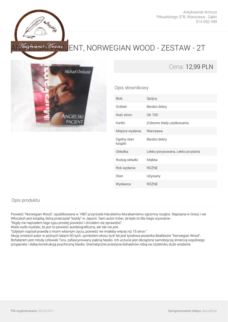 Antykwariat Amicus Piłsudskiego 37B, Warszawa - Ząbki 514 092 499 ANGIELSKI PACJENT, NORWEGIAN WOOD - ZESTAW - 2T Cena: 12,99 PLN Opis słownikowy Blok: Spójny Grzbiet: Bardzo dobry Ilość stron: OK 700 Kartki: Znikome ślady użytkowania Miejsce wydania: Warszawa Ogólny stan książki: Bardzo dobry Okładka: Lekko porysowana, Lekko przytarta Rodzaj okładki: Miękka Rok wydania: RÓŻNE Stan: Używany Wydawca: RÓŻNE Opis produktu Powieść "Norwegian Wood", opublikowana w 1987 przyniosła Harukiemu Murakamiemu ogromny rozgłos. Napisana w Grecji i we Włoszech jest książką, którą przeczytał "każdy" w Japonii. Sam autor mówi, że było to dla niego wyzwanie "Nigdy nie napisałem tego typu prostej powieści i chciałem się sprawdzić". Wiele osób myślało, że jest to powieść autobiograficzna, ale tak nie jest. "Gdybym napisał prawdę o moim własnym życiu, powieść nie miałaby więcej niż 15 stron." Akcję umieścił autor w późnych latach 60-tych, symbolem etosu tych lat jest tytułowa piosenka Beatlesów "Norwegian Wood". Bohaterem jest młody człowiek Toru, zafascynowany piękną Naoko. Ich uczucie jest obciążone samobójczą śmiercią wspólnego przyjaciela i słabą konstrukcją psychiczną Naoko. Dramatyczne przeżycia bohaterów robią na czytelniku duże wrażenie. Plik wygenerowano: 09-03-2017 Oprogramowanie sklepu: AptusShop Antykwariat Amicus Piłsudskiego 37B, Warszawa - Ząbki 514 092 499 Galeria Plik wygenerowano: 09-03-2017 Powered by TCPDF (www.tcpdf.org) Oprogramowanie sklepu: AptusShop