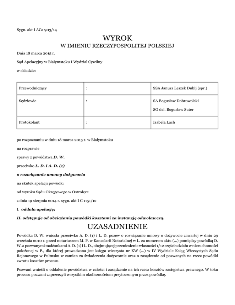 Sygn. akt I ACa 903/14 WYROK W IMIENIU RZECZYPOSPOLITEJ POLSKIEJ Dnia 18 marca 2015 r. Sąd Apelacyjny w Białymstoku I Wydział Cywilny w składzie: Przewodniczący : SSA Janusz Leszek Dubij (spr.) Sędziowie : SA Bogusław Dobrowolski SO del. Bogusław Suter Protokolant : Izabela Lach po rozpoznaniu w dniu 18 marca 2015 r. w Białymstoku na rozprawie sprawy z powództwa D. W. przeciwko L. D. i A. D. (1) o rozwiązanie umowy dożywocia na skutek apelacji powódki od wyroku Sądu Okręgowego w Ostrołęce z dnia 19 sierpnia 2014 r. sygn. akt I C 1151/12 I. oddala apelację; II. odstępuje od obciążania powódki kosztami za instancję odwoławczą. UZASADNIENIE Powódka D. W. wniosła przeciwko A. D. (1) i L. D. pozew o rozwiązanie umowy o dożywocie zawartej w dniu 29 września 2010 r. przed notariuszem M. P. w Kancelarii Notarialnej w L. za numerem aktu (...) pomiędzy powódką D. W. a pozwanymi małżonkami A. D. (1) i L. D., obejmującej przeniesienie własności 1/12 części udziału w nieruchomości położonej w P., dla której prowadzona jest księga wieczysta nr KW (...) w IV Wydziale Ksiąg Wieczystych Sądu Rejonowego w Pułtusku w zamian za świadczenia dożywotnie oraz o zasądzenie od pozwanych na rzecz powódki zwrotu kosztów procesu. Pozwani wnieśli o oddalenie powództwa w całości i zasądzenie na ich rzecz kosztów zastępstwa prawnego. W toku procesu pozwani zaprzeczyli wszystkim okolicznościom przytoczonym przez powódkę. Sąd Okręgowy w Ostrołęce wyrokiem z dnia 19 sierpnia 2014 roku oddalił powództwo oraz zniósł wzajemnie pomiędzy stronami koszty zastępstwa prawnego. U podstaw powyższego rozstrzygnięcia znalazły się następujące ustalenia faktyczne: Powódka aktem notarialnym dnia 20 sierpnia 2010 r. Rep. (...) przed notariuszem J. K., prowadzącym Kancelarię Notarialną w P., G. K. i B. K. cały przysługujący im udział, wynoszący 1/12 części we współwłasności nieruchomości położonej w gminie i mieście P. przy ulicy (...), stanowiącej działkę ewidencyjną, oznaczoną numerem(...) o powierzchni 0,0618 ha, dla której Sąd Rejonowy w Pułtusku prowadzi księgę wieczystą Nr (...) sprzedali D. W. za cenę 125 000 zł, ta zaś za tę cenę go kupiła. Następnie, aktem notarialnym Rep. A Nr (...)2010 r.,w dniu 28 września 2010 r. przed notariuszem E. P. w L. D. W. zawarła z A. D. (1) i jego żoną L. D., rodzicami P. D. umowę dożywocia, mocą której przeniosła na rzecz pozwanych do ich majątku wspólnego cały należący do niej udział w powyższej nieruchomości w zamian za dożywocie, na co pozwani wyrazili zgodę i zobowiązali się zapewnić powódce dożywotnie utrzymanie tj.: przyjąć ją jako domownika, dostarczać jej wyżywienia, ubrania, mieszkania, światła i opału, zapewnić jej odpowiednią pomoc i pielęgnowanie w chorobie oraz sprawić jej własnym kosztem pogrzeb odpowiadający zwyczajom miejscowym; a D. W. na taką treść dożywocia wyraziła zgodę. Strony wartość przenoszonego udziału zgodnie określiły na kwotę 125 000 zł. Sporządzająca powyższy akt notariusz poinformowała strony o treści art. 908-916 Kodeksu cywilnego dotyczących umowy dożywocia oraz, w powołaniu na orzeczenie Sądu Najwyższego o tym, że dopuszczalne jest przeniesienie w zamian za dożywocie udziału we współwłasności nieruchomości. W chwili zawierania umowy powódka nie miała do wskazanej umowy żadnych zastrzeżeń. Przed zawarciem powyższej umowy powódka nie znała pozwanych, nie rozmawiała z nimi o jej warunkach. W tym czasie była w dobrych relacjach z ich synem – P. D., który to pośredniczył przy zawarciu umowy i zaaranżował w tym celu spotkanie u notariusza. Nałożone powyższą umową obowiązki wykonywał w głównej mierze syn pozwanych – P. D., utrzymywał z nią stały kontakt, składał wizyty, dokonywał napraw, przejawiał inicjatywę w uzyskaniu dla powódki świadczeń z pomocy społecznej. Po zawarciu umowy, P. D. w okresie od września do grudnia 2010 r. odwiedzał powódkę wielokrotnie. Uszczelnił okna, usuwał zgłaszane przez powódkę usterki. W grudniu 2010 r. zakupił powódce opał. W końcu roku 2010 r. zaproponował powódce, aby ta w okresie wiosennym ze względu na zaplanowane prace remontowe łazienki opuściła mieszkanie. Powódka zaniepokoiła się przypuszczając, że pod pretekstem modernizacji części mieszkania, pozwani w ten sposób chcą się jej pozbyć. Nie spotkała się P. D., który nalegał wówczas na spotkanie. Przestała odpowiadać na telefony, kontakt z powódką od tego momentu zaczął systematycznie zanikać. Pismem z dnia 18 stycznia 2011 r. skierowanym do powódki, P. D. – syn pozwanych – wyraził zaniepokojenie brakiem kontaktu z powódką i jej stanem zdrowia. Wyraził chęć realizacji swych zobowiązań wobec powódki w sposób wcześniej ustalony a także spotkania na przyjaznej stopie, w tym w celu omówienia ewentualnych żądań powódki co do rozwiązania umowy. W powyższym piśmie P. D. potwierdził, że wysłał jej przekazem pocztowym 200 zł. W tym czasie powódka zainteresowana była już rozwiązaniem umowy dożywocia. Uzyskała stosowną poradę od adwokata w tym względzie, po czym nie opuszczając mieszkania, uniemożliwiła remont rzeczonej łazienki. Zaniepokojona postawą P. D. powódka znalazła oparcie w sąsiadce – E. D., która według D. W., chroniła ją przed pozwanymi, w których to teraz widziała tylko oszustów. Powódka uskarżała się, że między innymi okno w kuchni jest nieszczelne i w związku z tym jest tam chłodno, że skończył się jej opał, bojler zaczął przeciekać, w drzwiach wejściowych jest dziura. Skierowała się do P. D. o pomoc w tym zakresie. Po czym pozwany wraz z synem P. D. zdjęli bojler i zamontowali termę elektryczną. Po tym, jak piec grzewczy popsuł się A. D. (1) i P. D. zakupili i przekazali powódce olejowy piec elektryczny. Mimo to, jak twierdzi powódka pro