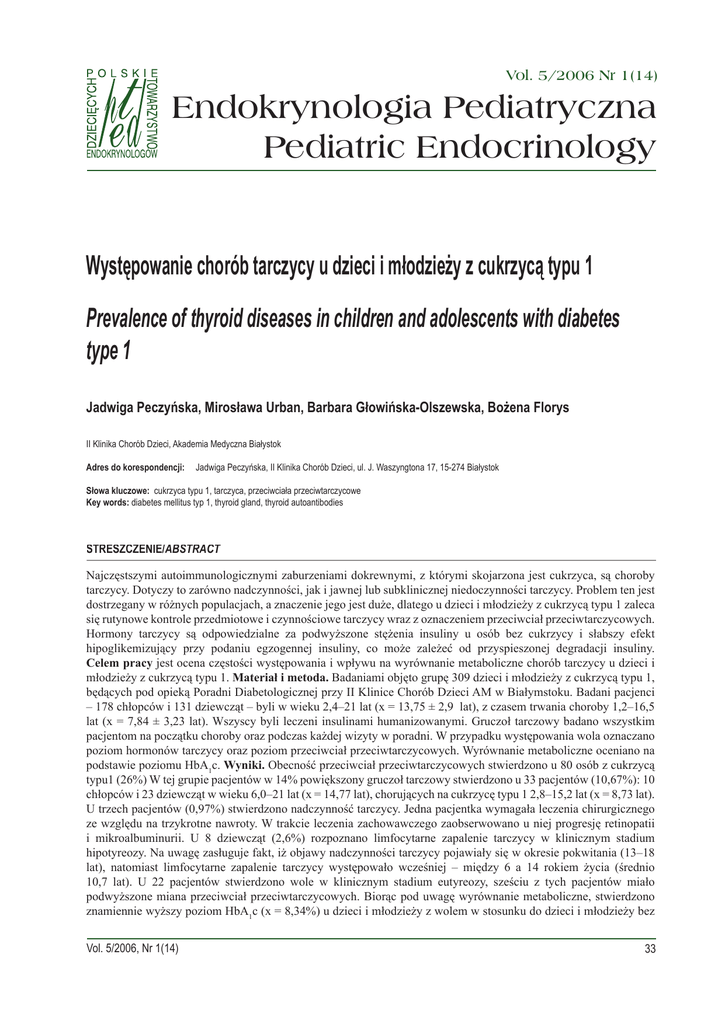 Vol. 5/2006 Nr 1(14) Endokrynologia Pediatryczna Pediatric Endocrinology Występowanie chorób tarczycy u dzieci i młodzieży z cukrzycą typu 1 Prevalence of thyroid diseases in children and adolescents with diabetes type 1 Jadwiga Peczyńska, Mirosława Urban, Barbara Głowińska-Olszewska, Bożena Florys II Klinika Chorób Dzieci, Akademia Medyczna Białystok Adres do korespondencji: Jadwiga Peczyńska, II Klinika Chorób Dzieci, ul. J. Waszyngtona 17, 15-274 Białystok Słowa kluczowe: cukrzyca typu 1, tarczyca, przeciwciała przeciwtarczycowe Key words: diabetes mellitus typ 1, thyroid gland, thyroid autoantibodies STRESZCZENIE/ STRESZCZENIE/ABSTRACT Najczęstszymi autoimmunologicznymi zaburzeniami dokrewnymi, z którymi skojarzona jest cukrzyca, są choroby tarczycy. Dotyczy to zarówno nadczynności, jak i jawnej lub subklinicznej niedoczynności tarczycy. Problem ten jest dostrzegany w różnych populacjach, a znaczenie jego jest duże, dlatego u dzieci i młodzieży z cukrzycą typu 1 zaleca się rutynowe kontrole przedmiotowe i czynnościowe tarczycy wraz z oznaczeniem przeciwciał przeciwtarczycowych. Hormony tarczycy są odpowiedzialne za podwyższone stężenia insuliny u osób bez cukrzycy i słabszy efekt hipoglikemizujący przy podaniu egzogennej insuliny, co może zależeć od przyspieszonej degradacji insuliny. Celem pracy jest ocena częstości występowania i wpływu na wyrównanie metaboliczne chorób tarczycy u dzieci i młodzieży z cukrzycą typu 1. Materiał i metoda. Badaniami objęto grupę 309 dzieci i młodzieży z cukrzycą typu 1, będących pod opieką Poradni Diabetologicznej przy II Klinice Chorób Dzieci AM w Białymstoku. Badani pacjenci – 178 chłopców i 131 dziewcząt – byli w wieku 2,4–21 lat (x = 13,75 ± 2,9 lat), z czasem trwania choroby 1,2–16,5 lat (x = 7,84 ± 3,23 lat). Wszyscy byli leczeni insulinami humanizowanymi. Gruczoł tarczowy badano wszystkim pacjentom na początku choroby oraz podczas każdej wizyty w poradni. W przypadku występowania wola oznaczano poziom hormonów tarczycy oraz poziom przeciwciał przeciwtarczycowych. Wyrównanie metaboliczne oceniano na podstawie poziomu HbA1c. Wyniki. Obecność przeciwciał przeciwtarczycowych stwierdzono u 80 osób z cukrzycą typu1 (26%) W tej grupie pacjentów w 14% powiększony gruczoł tarczowy stwierdzono u 33 pacjentów (10,67%): 10 chłopców i 23 dziewcząt w wieku 6,0–21 lat (x = 14,77 lat), chorujących na cukrzycę typu 1 2,8–15,2 lat (x = 8,73 lat). U trzech pacjentów (0,97%) stwierdzono nadczynność tarczycy. Jedna pacjentka wymagała leczenia chirurgicznego ze względu na trzykrotne nawroty. W trakcie leczenia zachowawczego zaobserwowano u niej progresję retinopatii i mikroalbuminurii. U 8 dziewcząt (2,6%) rozpoznano limfocytarne zapalenie tarczycy w klinicznym stadium hipotyreozy. Na uwagę zasługuje fakt, iż objawy nadczynności tarczycy pojawiały się w okresie pokwitania (13–18 lat), natomiast limfocytarne zapalenie tarczycy występowało wcześniej – między 6 a 14 rokiem życia (średnio 10,7 lat). U 22 pacjentów stwierdzono wole w klinicznym stadium eutyreozy, sześciu z tych pacjentów miało podwyższone miana przeciwciał przeciwtarczycowych. Biorąc pod uwagę wyrównanie metaboliczne, stwierdzono znamiennie wyższy poziom HbA1c (x = 8,34%) u dzieci i młodzieży z wolem w stosunku do dzieci i młodzieży bez Vol. 5/2006, Nr 1(14) 33 Praca oryginalna Endokrynol. Ped., 5/2006;1(14):33-38 jawnych objawów chorób tarczycy (x = 7,7%). Stwierdzono także znamiennie wyższe zapotrzebowanie na insulinę u pacjentów z jawnymi objawami chorób tarczycy (0,93 vs 0,80 IU/kg/dobę). U 15 osób z wolem (46%) odnotowano w wywiadzie rodzinnym obciążenia chorobami tarczycy. Wnioski: 1. Choroby tarczycy występują często wśród dzieci i młodzieży z cukrzycą typu 1, dwukrotnie częściej u dziewcząt. 2. Choroby tarczycy wpływają na pogorszenie wyrównania metabolicznego. Endokrynol. Ped., 5/2006;1(14):33-38 The most frequent autoimmunologic endocrinologic disorders connected with diabetes are thyroid disorders. This include hyperthyroidism, as well as overt and incipent subcliniced hypothyroidism. The problem is of great importance, therefore in diabetic children and adolescents routine control of thyroid gland with evaluation of thyroid hormons and antythyroid antybodies is recommended. Thyroid hormones are responsible for elevated insulin levels in people without diabetes, and poor hypoglycaemic effect during exogenic insulin treatment, what can be dependent or increased insulin degradation. The aim of the study was evaluation of prevalence of thyroid disorders and influence on metabolic control in children and adolescents with diabetes type1. Materials and methods. The study was carried out on 309 children and + heir adolscents with diabetes type 1. Patients were 2.4–21 yrs old (x = 13.75 yrs), with diabetes duration 1.2–16.5 yrs (x = 7.84 yrs); 178 boys and 131 girls. All were treated with human insulins. Thyroid gland was assessed at the beginning of the disease and during every outpatient control visit. In case struma was found, we assessed hormon levels and antythyroid antibodies. Metabolic control was evaluated on the basis of HbA1c level. Results. The presence of antythyroid antybodies was found in 80 patients with diabetes type 1 (26%). In this group 14% had struma simplex. Totally, struma was found in 33 patients (10.67%): 10 boys and 23 girls, aged 6,0–21 yrs (x = 14.77 yrs), suffering from diabetes type 1 2.8–15.2 yrs (x = 8.73 yrs). In 3 patients (0.97%) we recognized hyperthyroidism. One patient (a girl) had surgical treatment, because of three recurrences of the disease. During farmacologic treatment of the hyperthyroidism we observed progression of retinopathy and microalbuminuria in this patient. In 8 girls (2.6%) lymphocytic thyroiditis was recognized, in clinical stadium of hypothyreosis. Hyperthyroidism was found durin