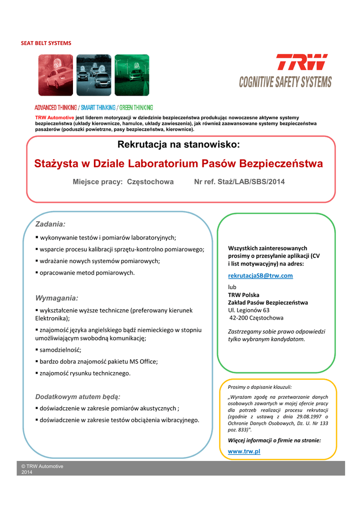 SEAT BELT SYSTEMS TRW Automotive jest liderem motoryzacji w dziedzinie bezpieczeństwa produkując nowoczesne aktywne systemy bezpieczeństwa (układy kierownicze, hamulce, układy zawieszenia), jak również zaawansowane systemy bezpieczeństwa pasażerów (poduszki powietrzne, pasy bezpieczeństwa, kierownice). Rekrutacja na stanowisko: Stażysta w Dziale Laboratorium Pasów Bezpieczeństwa Miejsce pracy: Częstochowa Nr ref. Staż/LAB/SBS/2014 Zadania: wykonywanie testów i pomiarów laboratoryjnych; wdrażanie nowych systemów pomiarowych; Wszystkich zainteresowanych prosimy o przesyłanie aplikacji (CV i list motywacyjny) na adres: opracowanie metod pomiarowych. [email protected] wsparcie procesu kalibracji sprzętu-kontrolno pomiarowego; wykształcenie wyższe techniczne (preferowany kierunek Elektronika); lub TRW Polska Zakład Pasów Bezpieczeństwa Ul. Legionów 63 42-200 Częstochowa znajomość języka angielskiego bądź niemieckiego w stopniu umożliwiającym swobodną komunikację; Zastrzegamy sobie prawo odpowiedzi tylko wybranym kandydatom. Wymagania: samodzielność; bardzo dobra znajomość pakietu MS Office; znajomość rysunku technicznego. Prosimy o dopisanie klauzuli: Dodatkowym atutem będą: doświadczenie w zakresie pomiarów akustycznych ; doświadczenie w zakresie testów obciążenia wibracyjnego. „Wyrażam zgodę na przetwarzanie danych osobowych zawartych w mojej ofercie pracy dla potrzeb realizacji procesu rekrutacji (zgodnie z ustawą z dnia 29.08.1997 o Ochronie Danych Osobowych, Dz. U. Nr 133 poz. 833)". Więcej informacji o firmie na stronie: www.trw.pl © TRW Automotive 2014