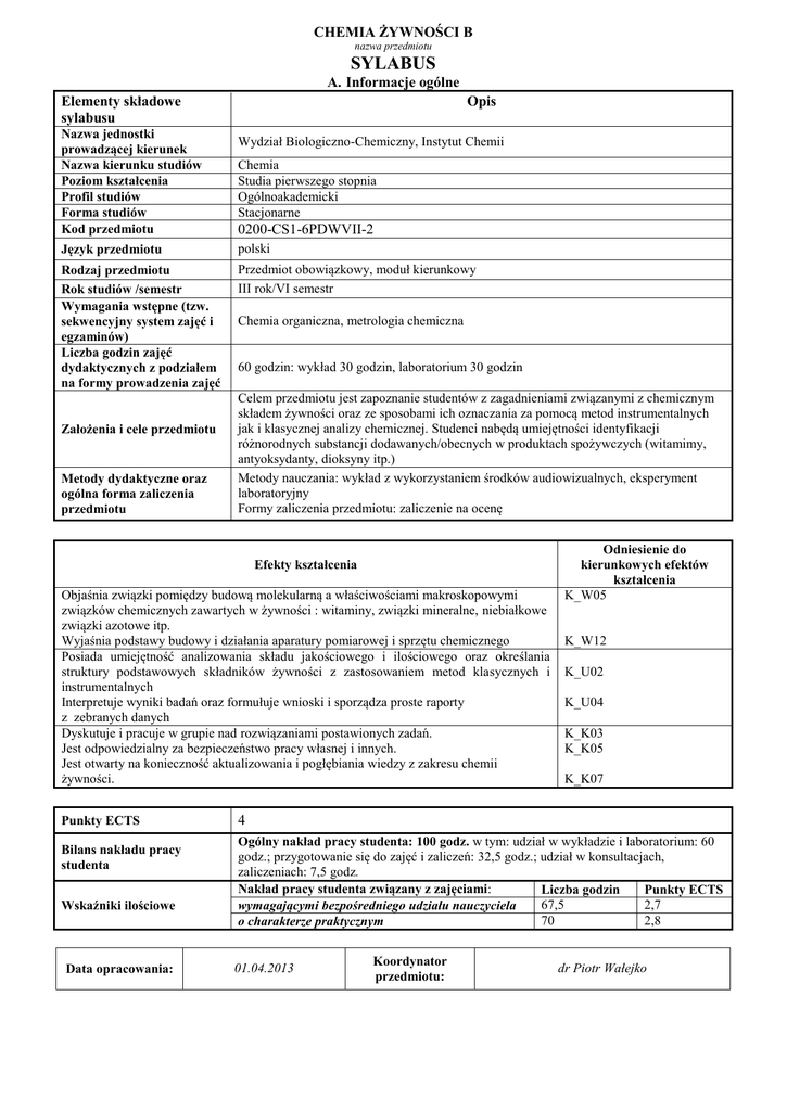 CHEMIA ŻYWNOŚCI B nazwa przedmiotu SYLABUS A. Informacje ogólne Elementy składowe sylabusu Opis Nazwa jednostki prowadzącej kierunek Nazwa kierunku studiów Poziom kształcenia Profil studiów Forma studiów Kod przedmiotu Wydział Biologiczno-Chemiczny, Instytut Chemii Język przedmiotu polski Rodzaj przedmiotu Rok studiów /semestr Wymagania wstępne (tzw. sekwencyjny system zajęć i egzaminów) Liczba godzin zajęć dydaktycznych z podziałem na formy prowadzenia zajęć Przedmiot obowiązkowy, moduł kierunkowy III rok/VI semestr Założenia i cele przedmiotu Metody dydaktyczne oraz ogólna forma zaliczenia przedmiotu Chemia Studia pierwszego stopnia Ogólnoakademicki Stacjonarne 0200-CS1-6PDWVII-2 Chemia organiczna, metrologia chemiczna 60 godzin: wykład 30 godzin, laboratorium 30 godzin Celem przedmiotu jest zapoznanie studentów z zagadnieniami związanymi z chemicznym składem żywności oraz ze sposobami ich oznaczania za pomocą metod instrumentalnych jak i klasycznej analizy chemicznej. Studenci nabędą umiejętności identyfikacji różnorodnych substancji dodawanych/obecnych w produktach spożywczych (witamimy, antyoksydanty, dioksyny itp.) Metody nauczania: wykład z wykorzystaniem środków audiowizualnych, eksperyment laboratoryjny Formy zaliczenia przedmiotu: zaliczenie na ocenę Efekty kształcenia Objaśnia związki pomiędzy budową molekularną a właściwościami makroskopowymi związków chemicznych zawartych w żywności : witaminy, związki mineralne, niebiałkowe związki azotowe itp. Wyjaśnia podstawy budowy i działania aparatury pomiarowej i sprzętu chemicznego Posiada umiejętność analizowania składu jakościowego i ilościowego oraz określania struktury podstawowych składników żywności z zastosowaniem metod klasycznych i instrumentalnych Interpretuje wyniki badań oraz formułuje wnioski i sporządza proste raporty z zebranych danych Dyskutuje i pracuje w grupie nad rozwiązaniami postawionych zadań. Jest odpowiedzialny za bezpieczeństwo pracy własnej i innych. Jest otwarty na konieczność aktualizowania i pogłębiania wiedzy z zakresu chemii żywności. Punkty ECTS Bilans nakładu pracy studenta Wskaźniki ilościowe Data opracowania: Odniesienie do kierunkowych efektów kształcenia K_W05 K_W12 K_U02 K_U04 K_K03 K_K05 K_K07 4 Ogólny nakład pracy studenta: 100 godz. w tym: udział w wykładzie i laboratorium: 60 godz.; przygotowanie się do zajęć i zaliczeń: 32,5 godz.; udział w konsultacjach, zaliczeniach: 7,5 godz. Nakład pracy studenta związany z zajęciami: Liczba godzin Punkty ECTS 67,5 2,7 wymagającymi bezpośredniego udziału nauczyciela 70 2,8 o charakterze praktycznym 01.04.2013 Koordynator przedmiotu: dr Piotr Wałejko SYLABUS B. Informacje szczegółowe Elementy składowe sylabusu Opis Nazwa przedmiotu Kod przedmiotu Nazwa kierunku Nazwa jednostki prowadzącej kierunek Język przedmiotu Chemia żywności B 0200-CS1-6PDWVII-2 Chemia Rok studiów/ semestr Liczba godzin zajęć dydaktycznych oraz forma prowadzenia zajęć Prowadzący IIIrok/VI semestr Wykład: 30 godzin Treści merytoryczne przedmiotu Wydział Biologiczno-Chemiczny, Instytut Chemii polski dr hab. Aneta Petelska dr Piotr Wałejko 1. Witaminy w produktach żywnościowych. 2. Związki mineralne w produktach żywnościowych. 3. Niebiałkowe związki azotowe. 4. Zanieczyszczenia żywności. 5. Dodatki do żywności, kategorie dodatków do żywności, dodatki zapobiegające psuciu się żywności, dodatki smakowo-zapachowe, dodatki kształtujące cechy fizyczne żywności, dodatki skrobiowe i białkowe, dodatki o wartościach odżywczych, dodatki ułatwiające wyrób żywności 6. Zafałszowania żywności 7. Wybrane elementy analizy sensorycznej produktów żywnościowych Efekty kształcenia wraz ze sposobem ich weryfikacji Forma i warunki zaliczenia przedmiotu Wykaz literatury podstawowej i uzupełniającej Egzamin pisemny; K_W05, K_W12, K_U02, K_U04 Dopuszczenie do zaliczenia: zaliczenie laboratorium na pozytywną ocenę. Forma zaliczenia: uczestnictwo w wykładach; zaliczenie pisemne na ocenę Literatura obowiązkowa: 1. J. Kumirska, M. Gołębiowski, M. Paszkiewicz, A. Bychowska, Analiza żywności, Skrypt z ochrony środowiska, Wydawnictwo Uniwersytetu Gdańskiego, Gdańsk 2010. 2. Chemia żywności. Praca zbiorowa pod red. Z. Sikorskiego. WNT, Warszawa, 2002. 3. Analiza żywności. Praca zbiorowa pod red. M. Klepackiej. Fundacja Rozwój SGGW, Warszawa 2005. 4. Z.E. Sikorski – Chemia Żywności, WNT, Warszawa 2002. Literatura uzupełniająca: Publikacje w czasopismach naukowych ………………………………. podpis osoby składającej sylabus SYLABUS C. Informacje szczegółowe Elementy składowe sylabusu Opis Nazwa przedmiotu Kod przedmiotu Nazwa kierunku Nazwa jednostki prowadzącej kierunek Język przedmiotu Chemia żywności B 0200-CS1-6PDWVII-2 Chemia Rok studiów/ semestr Liczba godzin zajęć dydaktycznych oraz forma prowadzenia zajęć Prowadzący Treści merytoryczne przedmiotu IIIrok/VI semestr Laboratorium 30godzin Efekty kształcenia wraz ze sposobem ich weryfikacji Forma i warunki zaliczenia przedmiotu Wykaz literatury podstawowej i uzupełniającej Wydział Biologiczno-Chemiczny, Instytut Chemii polski dr J. Kotyńska, dr P. Wałejko Ćwiczenia 1. Badanie zmiany barwy roztworów flawonoidów w zależności od pH. 2. Oznaczanie witamin rozpuszczalnych w tłuszczach i wodzie. 3. Oznacznie mutagennych i rakotwórczych składników żywności . 4. Oznaczanie witaminy C w soku z kiszonej kapusty. 5. Oznaczanie kwasu benzoesowego w napojach metodą miareczkowania. Sposoby weryfikacji: bieżąca ocena postępów podczas zajęć K_W12, K_K07, ocena efektów pracy zespołowej K_K03, K_K05, ocena sporządzonych raportów K_U04, kolokwium pisemne K_W05, K_W07. Zaliczenie zajęć: wykonanie ćwiczeń laboratoryjnych przewidzianych programem studiów, zaliczenie kolokwium pisemnego na pozytywną ocenę, Literatura obowiązkowa: 1. J. Kumirs