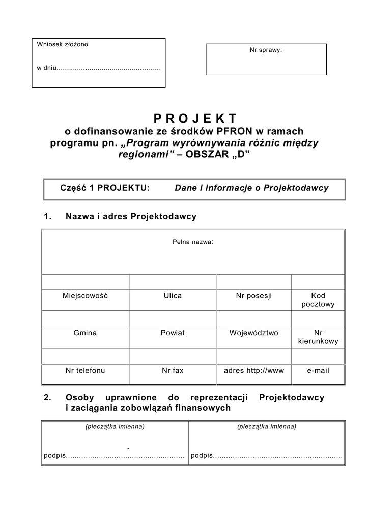 Wniosek z ono Nr sprawy: w dniu................................................... PROJEKT o dofinansowanie ze rodków PFRON w ramach programu pn. „Program wyrównywania ró nic mi dzy regionami” – OBSZAR „D” Cz 1. 1 PROJEKTU: Dane i informacje o Projektodawcy Nazwa i adres Projektodawcy Pe na nazwa : Miejscowo 2. Ulica Nr posesji Kod pocztowy Gmina Powiat Województwo Nr kierunkowy Nr telefonu Nr fax adres http://www e-mail Osoby uprawnione do reprezentacji i zaci gania zobowi za finansowych (piecz tka imienna) Projektodawcy (piecz tka imienna) - podpis...................................................... podpis........................................................... ....... .. 3. Informacje o realizacji obowi zku wp at na rzecz PFRON Czy Projektodawca jest zobowi zany do wp at na rzecz PFRON tak: nie: tak: nie: Podstawa zwolnienia z wp at na rzecz PFRON Czy Projektodawca zalega z wp atami na rzecz PFRON Nr identyfikacyjny PFRON Kwota zaleg ci z tytu u wp at, których termin p atno ci up yn w miesi cu poprzedzaj cym miesi c z enia wniosku 4. ...............,......z Informacje o Projektodawcy Zakres terytorialny dzia ania Projektodawcy: REGON Nr identyfikacyjny NIP Nazwa banku Nr rachunku bankowego Czy Projektodawca jest podatnikiem VAT: tak: nie: podstawa prawna zwolnienia z podatku VAT .................................................... Wnioskodawca jest podatnikiem VAT, lecz w ramach wnioskowanych do dofinansowania kosztów nie mo e obni kwoty podatku nale nego o podatek naliczony tak: nie: podstawa prawna:............................................................................................. 5. Informacja o korzystaniu ze rodków PFRON (za okres ostatnich 3 lat) Czy Projektodawca korzysta ze rodków PFRON Cel Nr i data (nazwa zadania ustawowego oraz zawarcia umowy /lub nazwa programu, w ramach którego przyznana zosta a pomoc) Razem kwota przyznana: Cz 2 PROJEKTU: Kwota przyznana tak nie Termin rozliczenia Razem kwota rozliczona: Informacje o projekcie 1. Opis projektu Nazwa projektu : Cel projektu: (w przypadku obszernego opisu – w za czeniu) Projekt dotyczy terenu: miejskiego ; wiejskiego ; miejsko-wiejskiego ; Kwota rozliczona Nazwa jednostki organizacyjnej projektodawcy, która b dzie dysponowa pojazdem Dok adna lokalizacja obiektu (miejscowo , ulica, nr posesji, kod pocztowy, gmina, powiat, województwo): NIP………….….; REGON ………......; Nr identyfikacyjny PFRON ……………. nale y wype ni je eli posiada 2. Uzasadnienie potrzeby zakupu pojazdu (pojazdów) do przewozu osób niepe nosprawnych (w przypadku obszernego opisu – w za czeniu) 3. Charakterystyka dotychczas wykonywanych przewozów na rzecz osób niepe nosprawnych (w przypadku obszernego opisu – w za czeniu) 4. Diagnoza sytuacji, z której wynika podj cia dzia opisanych w projekcie (w przypadku obszernego opisu – w za czeniu) b dzie konieczno 5. Harmonogram realizacji projektu Rozpocz cie realizacji projektu (dzie , miesi c, rok): Przewidywany czas realizacji (w miesi cach) : 6. a) Warto wska ników bazowych liczba pojazdów (w rozbiciu na mikrobusypojazdy o liczbie miejsc 9 cznie z kierowc i autobusy) wykorzystywanych do przewozu osób niepe nosprawnych b cych w posiadaniu beneficjenta, w tym pojazdów przystosowanych do przewozu osób na wózkach inwalidzkich, wed ug stanu na ostatni dzie roku poprzedzaj cego rok z enia wyst pienia jednostki samorz du terytorialnego lub wniosku o dofinansowanie Liczba mikrobusów ............................. w tym przystosowanych do przewozu osób na wózkach .................................. Liczba autobusów ..............................., w tym przystosowanych do przewozu osób na wózkach ................................ b) osoby niepe nosprawne liczba osób niepe nosprawnych, z wyodr bnieniem osób niepe nosprawnych na pe noletnie do 18 roku cznie wózkach inwalidzkich, którym beneficjent ycia zapewnia sta y codzienny przewóz, wed ug stanu na ostatni dzie roku poprzedzaj cego rok z enia wyst pienia jednostki samorz du pe noletnie do18 roku cznie na terytorialnego lub wniosku o dofinansowanie na wózkach ycia na wózkach wózkach c) wysoko rodków zaplanowanych przez beneficjenta na zakup lub przystosowanie pojazdów przeznaczonych do przewozu osób niepe nosprawnych, w roku z enia wyst pienia jednostki samorz du terytorialnego lub wniosku o dofinansowanie 7. Koszt realizacji projektu A. czny koszt realizacji projektu: …………………. z ownie z otych: …………………………………………………………………….z B. W asne rodki przeznaczone na realizacj projektu: …………. z ownie z otych: ………………………………………………………………….. z C. Inne ród a finansowania ogó em rodki wp acone, przyrzeczone, gwarancje – z wy czeniem rodków pochodz cych z PFRON): .......................................z ownie z otych:………............................................................................. ..................................................................................................................... D. Wnioskowana kwota dofinansowania ze rodków PFRON: ……………….. z ownie z otych: ………………………………………………………………….. z 8. Informacje dotycz ce pomocy publicznej Projektodawca podlega przepisom ustawy z dnia 30 kwietnia 2004 r. o post powaniu w sprawach dotycz cych pomocy publicznej (Dz. U.z 2007r. Nr 59, poz. 404 z pó n.zm.) tak nie Projektodawca prowadzi dzia alno gospodarcz tak nie ; Wsparcie ze rodków PFRON zostanie przeznaczone prowadzonej dzia alno ci gospodarczej tak nie ; na finansowanie Wsparcie projektodawcy ze rodków PFRON grozi zak óceniem lub zak óca konkurencj oraz wp ywa na wymian handlow mi dzy krajami cz onkowskimi UE tak nie ; Planowana pomoc jest pomoc de minimis 9. Informacje uzupe niaj ce tak nie ; 10. Za czniki (dokumenty) wymagane do Projektu L.p. Za czono do wniosku Nazwa za cznika tak