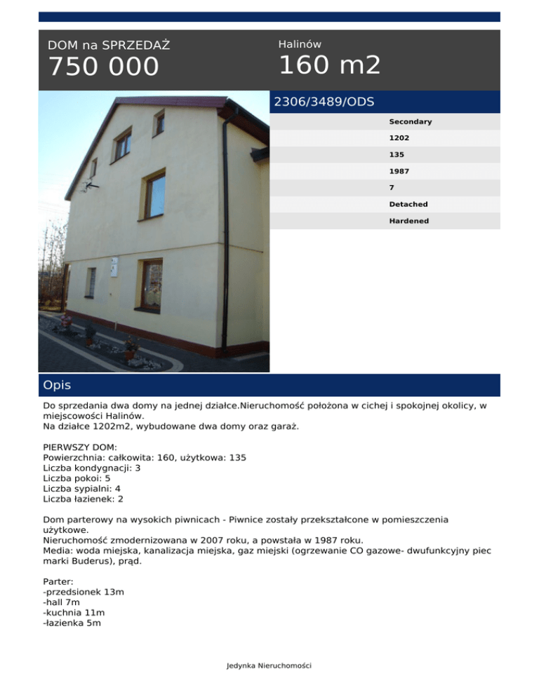 Halinów DOM na SPRZEDAŻ 160 m2 750 000 2306/3489/ODS Secondary 1202 135 1987 7 Detached Hardened Opis Do sprzedania dwa domy na jednej działce.Nieruchomość położona w cichej i spokojnej okolicy, w miejscowości Halinów. Na działce 1202m2, wybudowane dwa domy oraz garaż. PIERWSZY DOM: Powierzchnia: całkowita: 160, użytkowa: 135 Liczba kondygnacji: 3 Liczba pokoi: 5 Liczba sypialni: 4 Liczba łazienek: 2 Dom parterowy na wysokich piwnicach - Piwnice zostały przekształcone w pomieszczenia użytkowe. Nieruchomość zmodernizowana w 2007 roku, a powstała w 1987 roku. Media: woda miejska, kanalizacja miejska, gaz miejski (ogrzewanie CO gazowe- dwufunkcyjny piec marki Buderus), prąd. Parter: -przedsionek 13m -hall 7m -kuchnia 11m -łazienka 5m Jedynka Nieruchomości -2 pokoje 23m i 31m -kotłownia z pralnią -spiżarnia Na całej kondygnacji terakota i ogrzewanie podłogowe. I pięrto: -hall 12m -łazienka 7m -sypialnia 11m -2 pokoje z balkonem 14 i 17m -mały pokój, połączony z dużym pokojem z którego jest wyjście na taras zadaszony 30m -garderoba II piętro: -niewykończony strych 80m, możliwość zrobienia przenajmniej 2 pomieszczeń mieszkalnych. DRUGI DOM: Piwnica Parter: -hall -kuchnia -łazienka -2 pokoje Strych Na działce znajduj się krzewy i drzewa ozdobne Podjazd wyłożony kostką brukową. Do stacji PKP Halinów ok 1 km, sklepy, kościoły, apteki, ośrodek zdrowia itp. ISTNIEJE MOŻLIWOŚĆ SPRZEDAŻY ODDZIELNIE KAŻDEGO Z DOMÓW ZAPRASZAM DO OGLĄDANIA TEL.507201111 -----Niniejsza oferta ma charakter informacyjny i jest prezentowana wyłącznie za zgodą właściciela nieruchomości.---------BIURO NIERUCHOMOŚCI JEDYNKA prowadzi działalność w zakresie pośrednictwa w obrocie nieruchomościami na terenie Sulejówka i jego okolic, jak również Otwocka.---------Zapraszamy na naszą stronę internetową WWW.BN1.COM.PL-- Sylwia Slowik tel. 507 20 11 11 tel. 22 783 22 80 email: [email protected] Jedynka Nieruchomości Powered by TCPDF (www.tcpdf.org)
