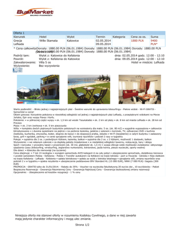 Oferta 1 Kierunek Grecja Lefkada Hotel Wille Stamata Wylot Katowice Termin Kategoria 02.05.2014 09.05.2014 Cena za os. 1880 PLN Suma 9400 PLN* * Cena całkowita:Dorosły: 1880.00 PLN (06.01.1984) Dorosły: 1880.00 PLN (06.01.1984) Dorosły: 1880.00 PLN Dorosły: 1880.00 PLN (06.01.1984) Dorosły: 1880.00 PLN (06.01.1984) (06.01.1984) Podróż tam: Wylot z: Katowice do Kefalonia dnia: 02.05.2014 godz. 12:00 - 12:10 Powrót: Wylot z: Kefalonia do Katowice dnia: 09.05.2014 godz. 12:00 - 12:10 Zakwaterowanie: Villa 5 os Hotel w mieście: Lefkada Wyżywienie: Bez wyzywienia Warto podkreślić: - Blisko jednej z najpiękniejszych plaż - Świetne warunki do uprawiania kitesurfingu - Piekne widoki - Wi-Fi GRATIS Samochód w cenie! Okiem grecosa: Korzystnie położona w niewielkiej odległości od jednej z najpiękniejszych plaż Lefkady, z przepięknymi widokami na Morze Jońskie, Epir oraz wyspy Paxos i Korfu. Położenie: • w północnej części wyspy • ok. 1,5 km od wioski Tsoukalades • ok. 2 km od plaży • ok. 8 km od miasta Lefkada • ok. 28 km od Prevezy Plaża: • ok. 2 km żwirkowa • ok. 5 km piaszczysta Willa: • kompleks dwóch piętrowych budynków położonych na wzniesieniu dla maks. 5 os. (ok. 80 m2) • wygodnie wyposażona • całkowicie klimatyzowana • z dwoma sypialniami na piętrze • na parterze łazienka, jadalnia z salonem • kominek, TV, odtwarzacz DVD • kuchnia (lodówka, kuchenka, zmywarka, toster, ekspres do kawy) • do dyspozycji pralka, żelazko • Wi-Fi (bezpłatnie) w całym budynku • zadaszony taras, grill • ogródek, parking • w cenie sprzątanie willi, wymiana ręczników i pościeli 2 razy w tygodniu Pokoje: • sypialnia dla 2 os. z podwójnym łóżkiem, łazienka, balkon • sypialnia dla 2 os. z 2 łóżkami, możliwość 1 dostawki, balkon Wyżywienie: • we własnym zakresie • za dopłatą pakiety śniadaniowe • w niedalekiej odległości tawerny, restauracje, bary i sklepy Sport i rozrywka: • prywatny basen z prysznicem (ok. 30 m2, głębokość ok. 1,5 m) • wyspa oferuje wiele możliwości zwiedzania i aktywnego spędzenia czasu (kitesurfing, windsurfing, żeglarstwo nurkowanie, lotniarstwo, jazda konna, piesze wycieczki, sporty wodne) Dla dzieci: • łóżeczka dla niemowląt (na życzenie) Cena obejmuje: • 7 lub 14 noclegów • wynajem samochodu AVIS kategorii A na cały pobyt • ubezpieczenie samochodu, dodatkowy kierowca • przelot samolotem Polska - Kefalonia - Polska • Transfer autokarem na Kefalonii na trasie lotnisko - port w Fiscardo - lotnisko • Rejs statkiem na trasie Kefalonia - Lefkada - Kefalonia • opłata lotniskowa • opłata za wylot z lotniska lokalnego • sprzątanie willi, zmiana ręczników oraz pościeli 2 x w tygodniu • opieka rezydenta • ubezpieczenie podstawowe ERV Standard KL (15 000 EUR), NNW (7 000 PLN) i bagażu (300 EUR) PROMOCJA - GRATIS tylko do 31/01/2014: - Rabaty do 35% - Voucher na wycieczkę fakultatywną 20 eur/os dor., 10 eur/dziecko - Pakiet Bezpieczna Rezerwacja - Gwarancja Niezmiennej Ceny - Gwarancja Najniższej Ceny - Gwarancja bezkosztowej zmiany rezerwacji Opcjonalnie: - Ubezpieczenie od kosztów rezygnacji - 1 % ceny Niniejsza oferta nie stanowi oferty w rozumieniu Kodeksu Cywilnego, a dane w niej zawarte mają jedynie charakter informacyjny i mogą ulec zmianie. Strona 1/2 Legenda Wypożyczalnia sprzętu zimowego Sporty zimowe Życie nocne Klimatyzacja Żeglarstwo Ułatwienia dla niepełnosprawnych Nordic walking Jazda konna Sporty wodne Minigolf Tenis Sport Blisko lotniska Zjeżdzalnie wodne Basen kryty Basen odkryty Fitness / siłownia Hotel klubowy CityBreak Region nadmorski Bez paszportu Blisko stoku Niniejsza oferta nie stanowi oferty w rozumieniu Kodeksu Cywilnego, a dane w niej zawarte mają jedynie charakter informacyjny i mogą ulec zmianie. Strona 2/2